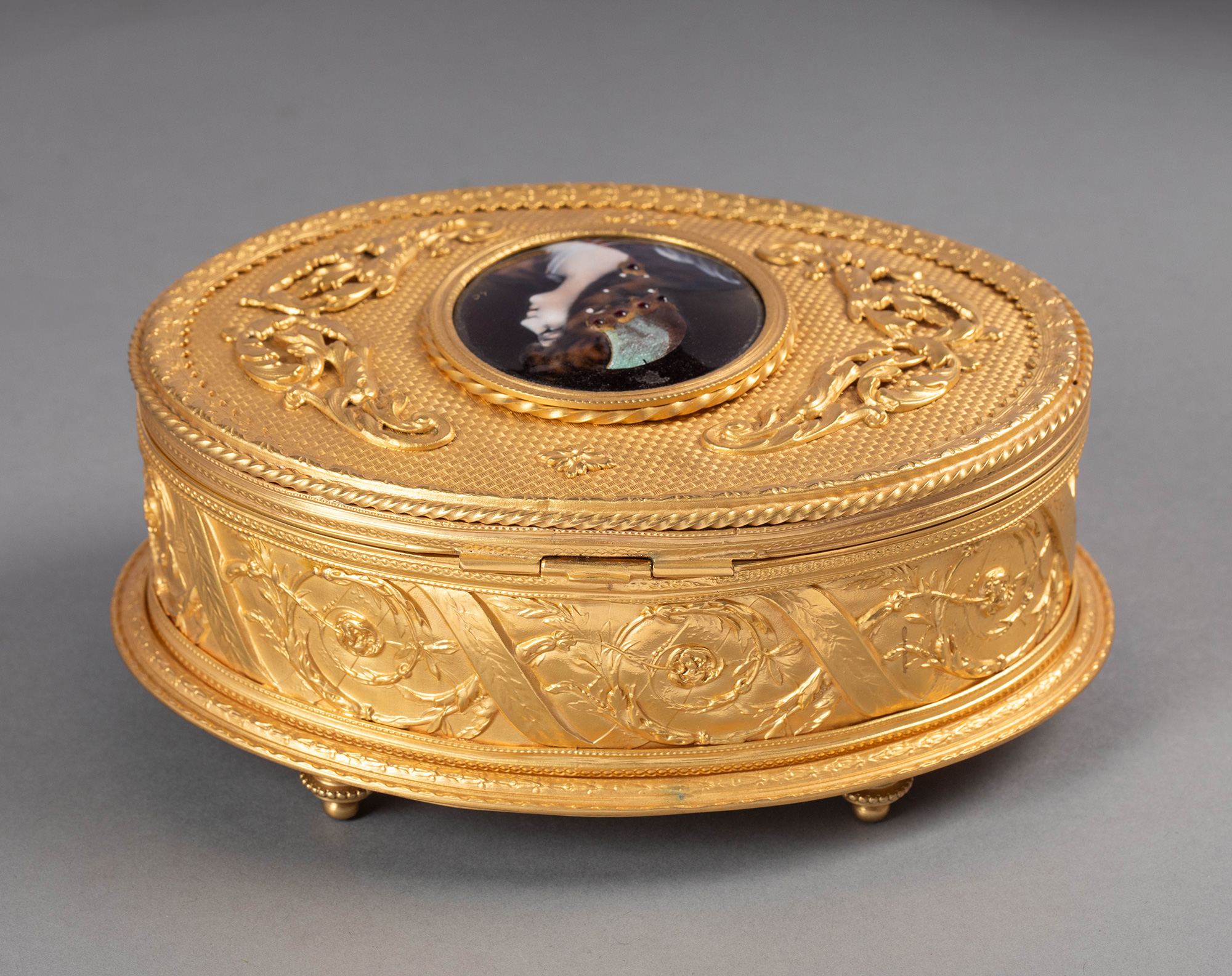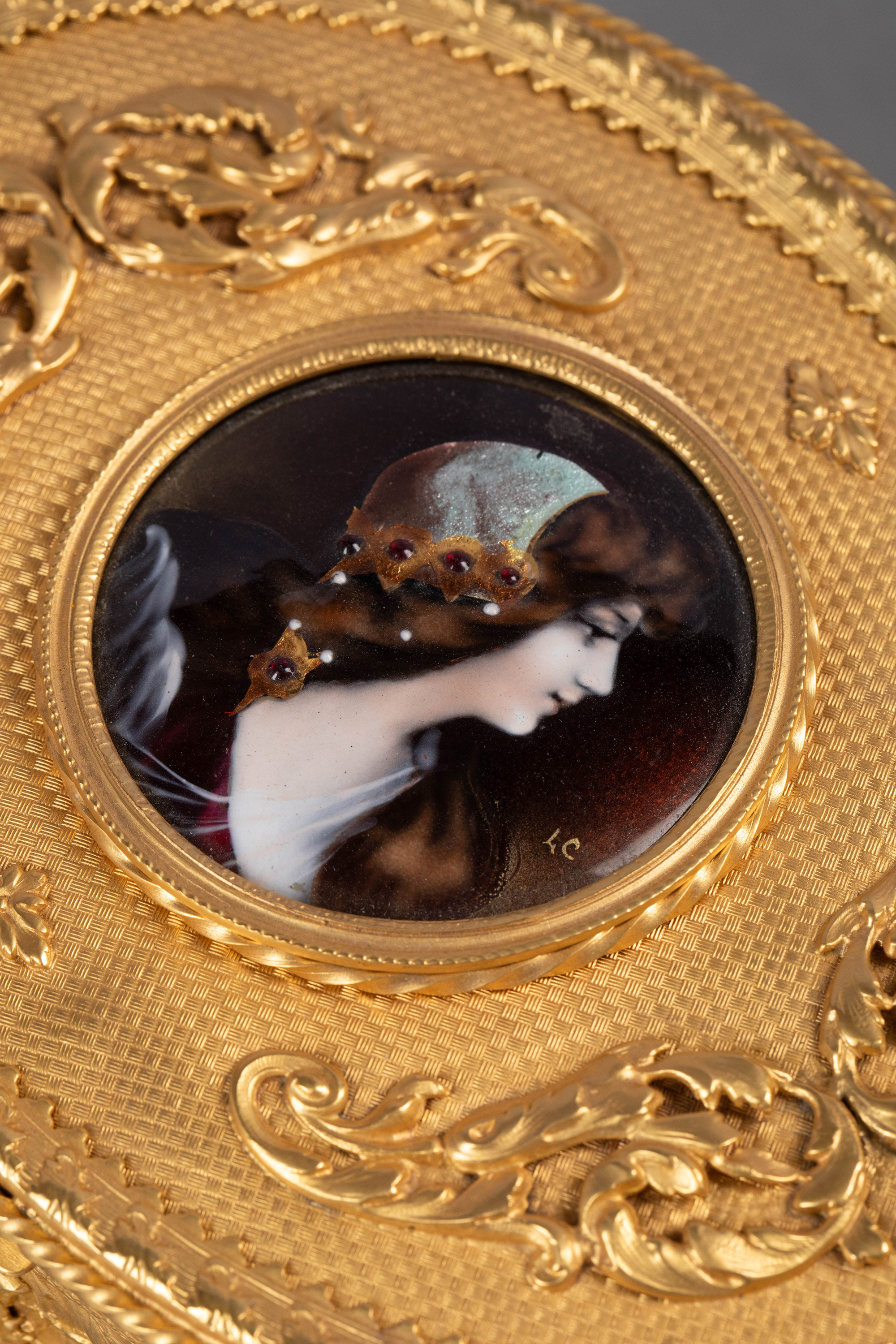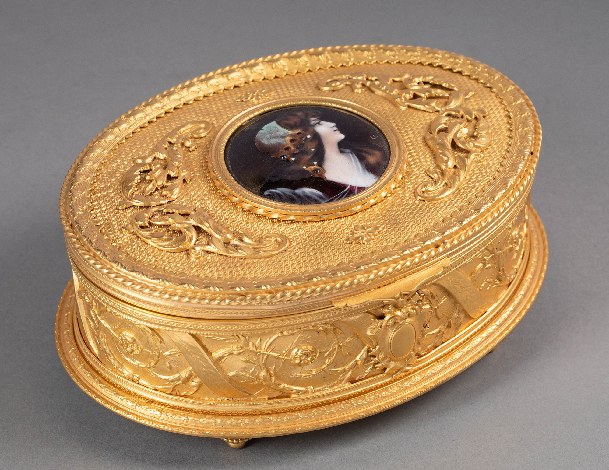 20世纪法国出品卷叶缎带纹铜鎏金精雕镶嵌少女肖像主题手绘细密画珍宝盒