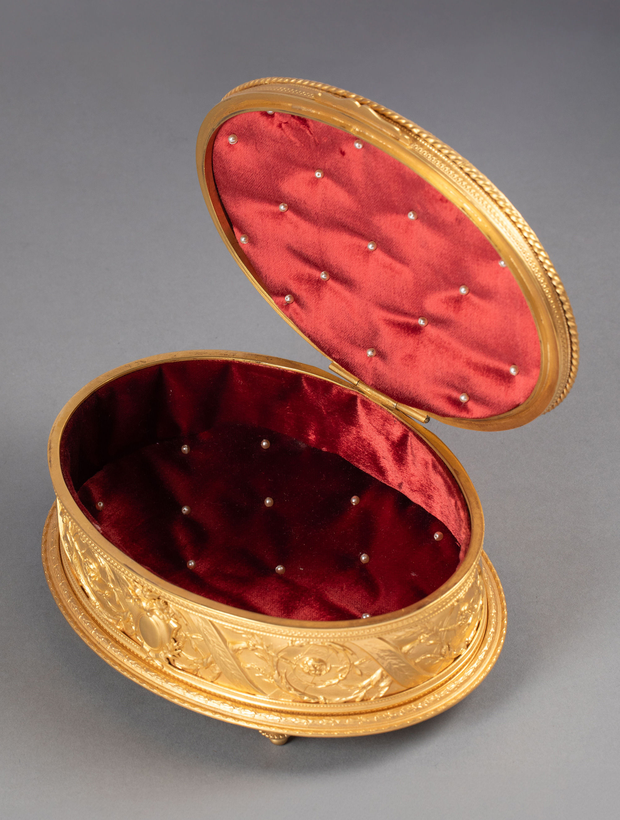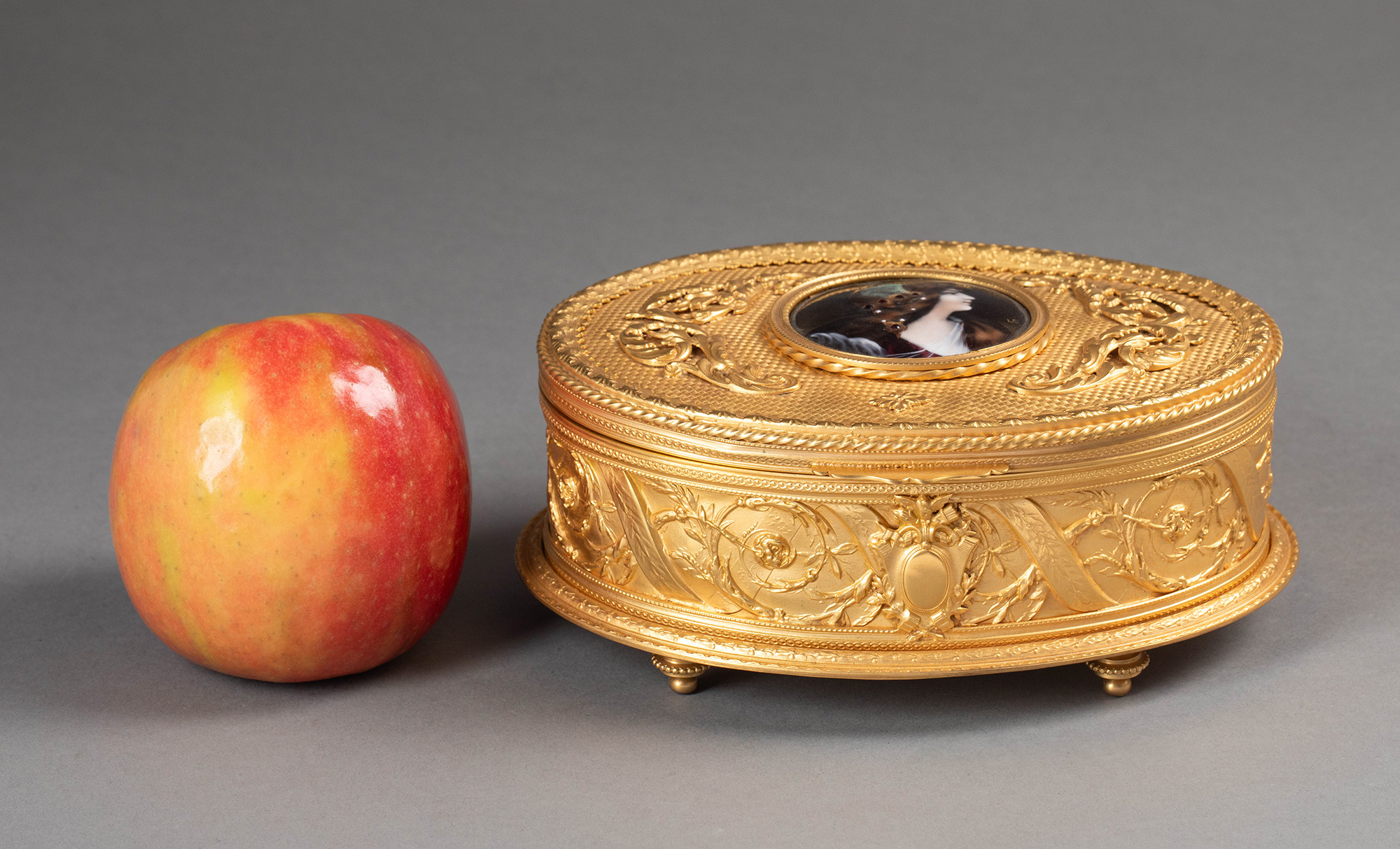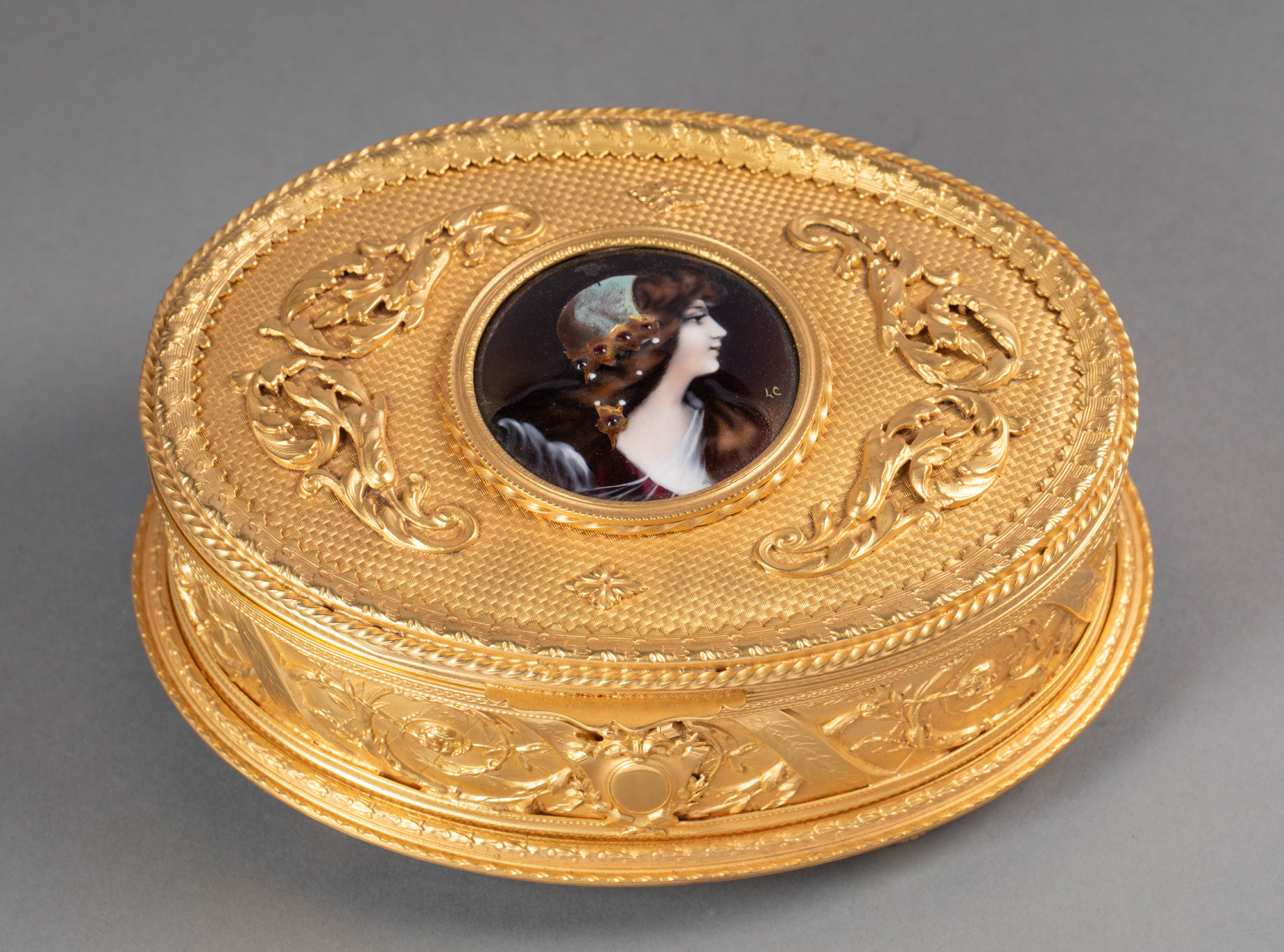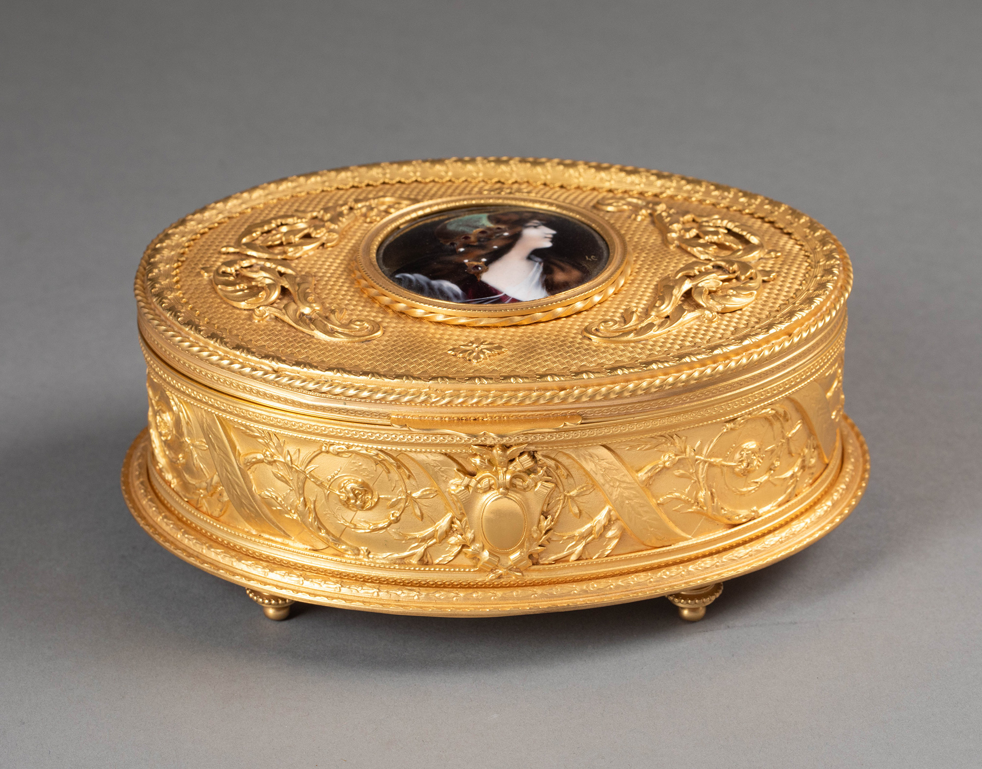 20世纪法国出品卷叶缎带纹铜鎏金精雕镶嵌少女肖像主题手绘细密画珍宝盒