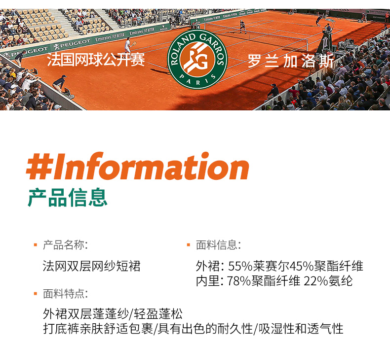 罗兰加洛斯法网网球裙女2025夏季新款网球百褶裙短裙轻盈半身裙