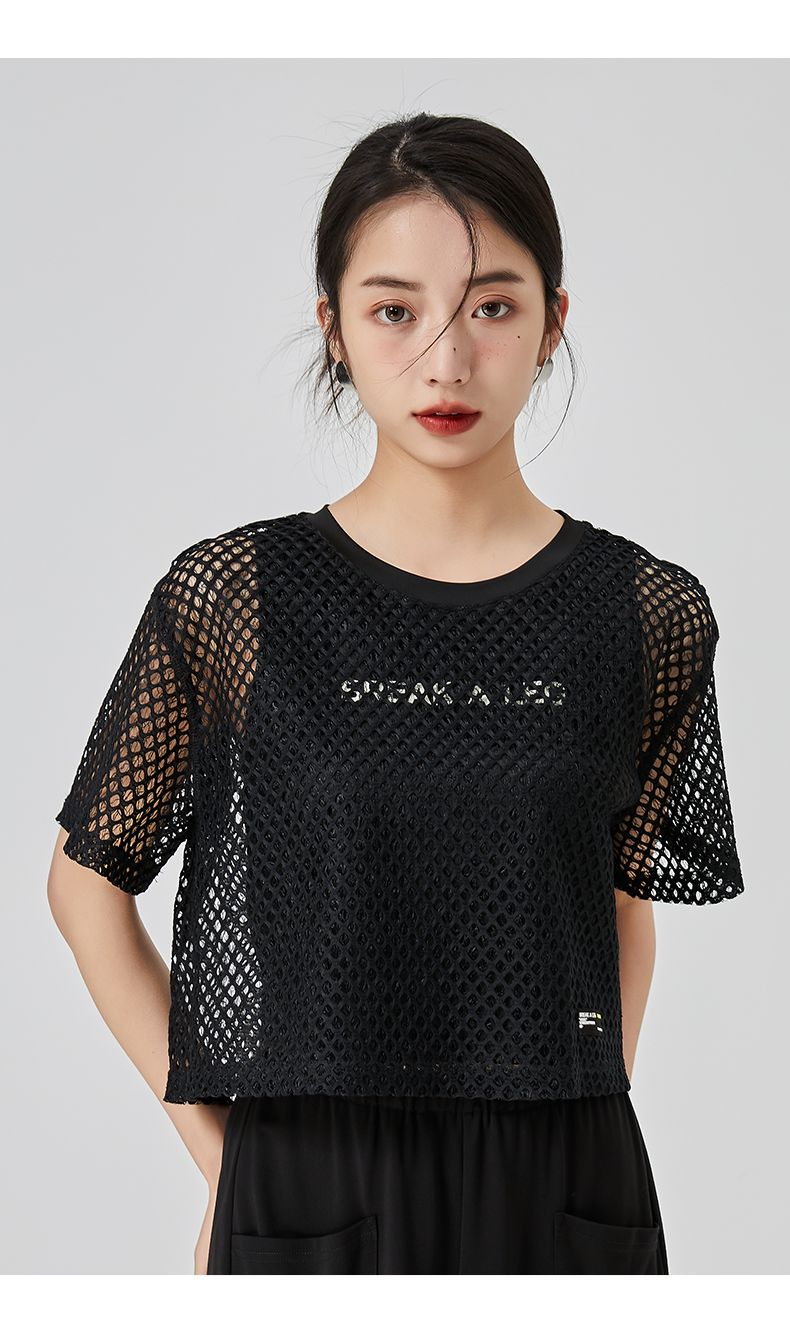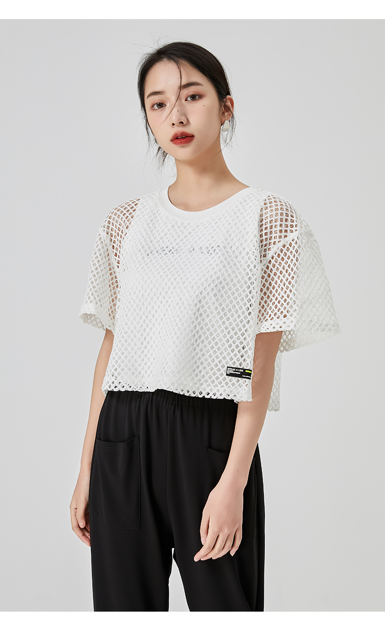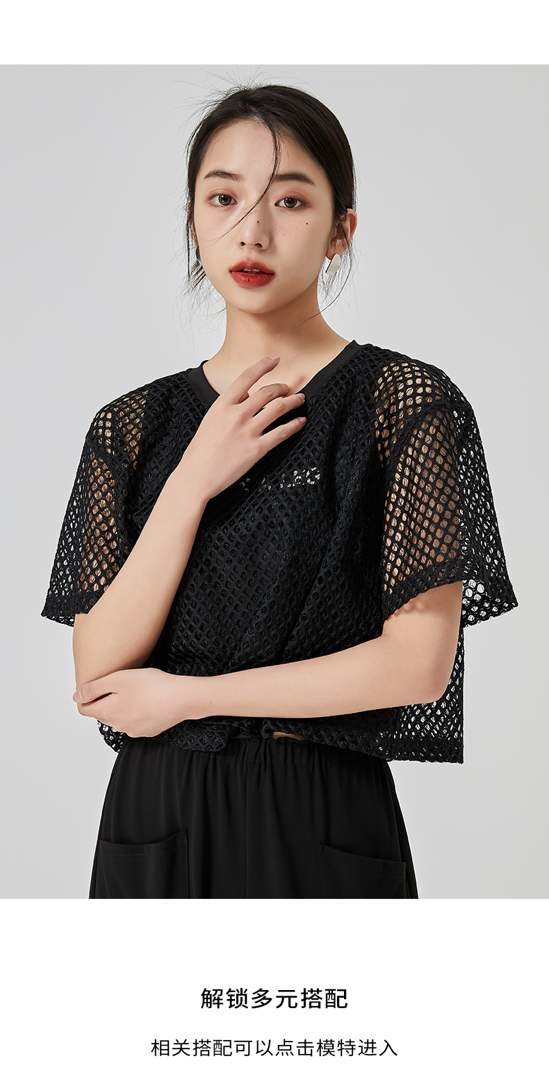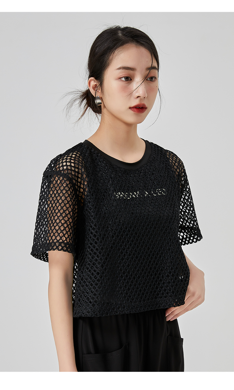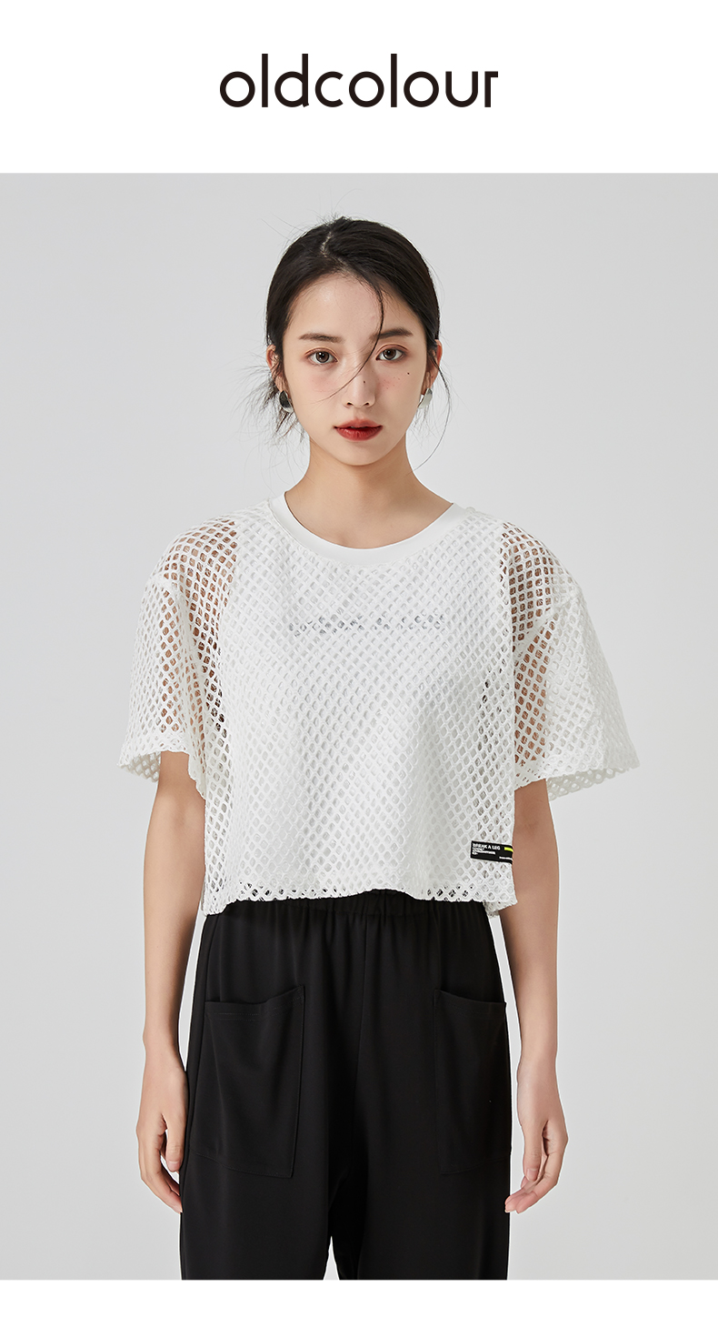 oldcolour直筒短款T恤2023夏季新款休闲网纱假两件上衣N22021274