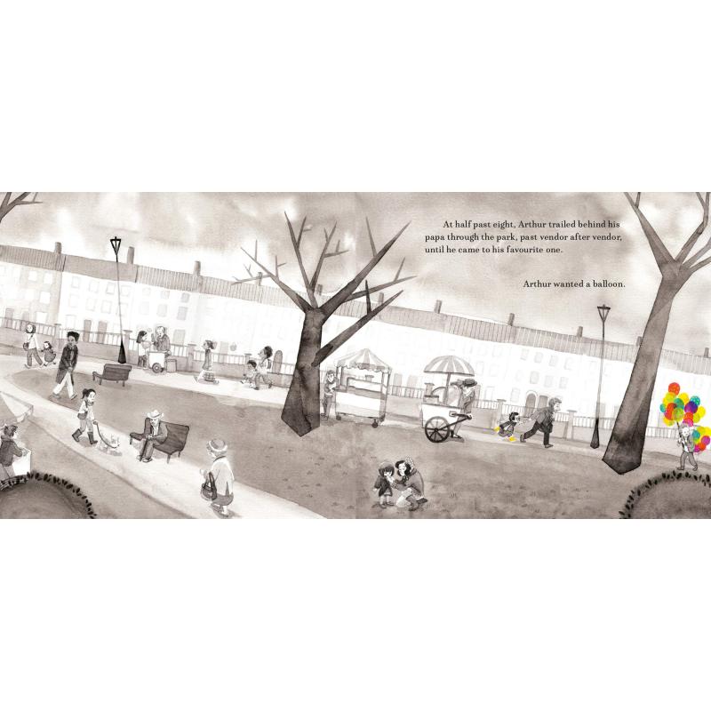 Arthur's gloomy dad rushes him through the park every morning, through grey and rainy weather. Arthur just wants a balloon from the park's vendor, and Dad always says no. But one rainy morning, the balloons magically appear at their doorstep, and Arthur figures out the perfect way to bring the sunshine out, even if only for a few moments.