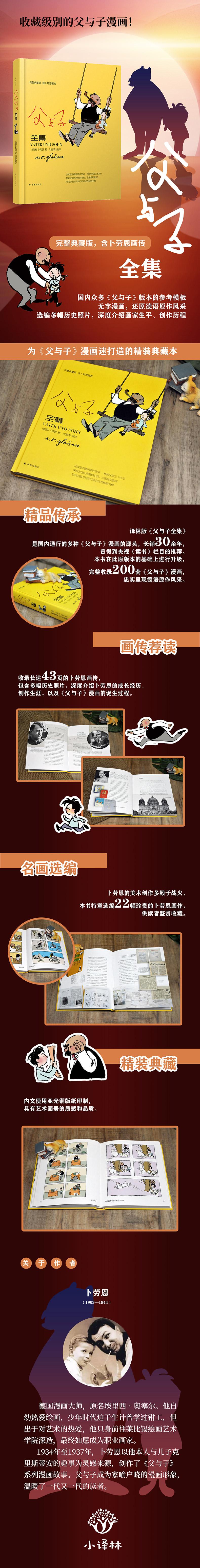 本书为《父与子全集》精装典藏版,既可供亲子阅读,也能满足老漫画爱好者和收藏者的需求。1. 经典传承:译林版《父与子全集》是国内通行的多种《父与子》漫画的源头,长销30余年,曾得到央视《读书》栏目的推荐。本书在此经典版本的基础上进行升级,完整收录200套《父与子》漫画,忠实呈现德语原作风采。2. 画传荐读:本书的一大特色在于收录了长达43页的卜劳恩画传,其中包含多幅历史照片,深度介绍卜劳恩的成长经历、创作生涯,以及《父与子》漫画的诞生过程。3. 名画选编:卜劳恩的美术创作多毁于战火,本书特意选编22幅珍贵的卜劳恩画作,供读者鉴赏收藏。4. 精装典藏:本书内文使用157克重磅亚光铜版纸印制,具有艺术画册的质感和品质。