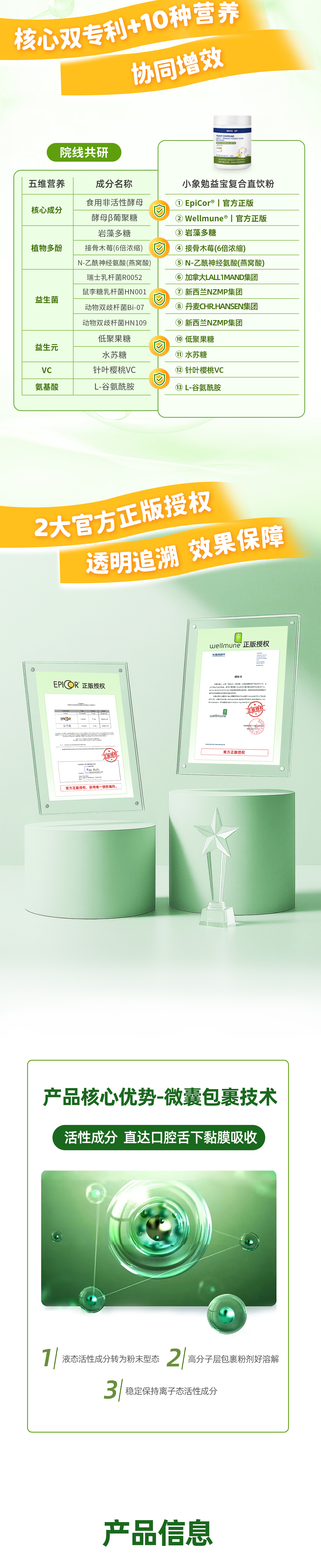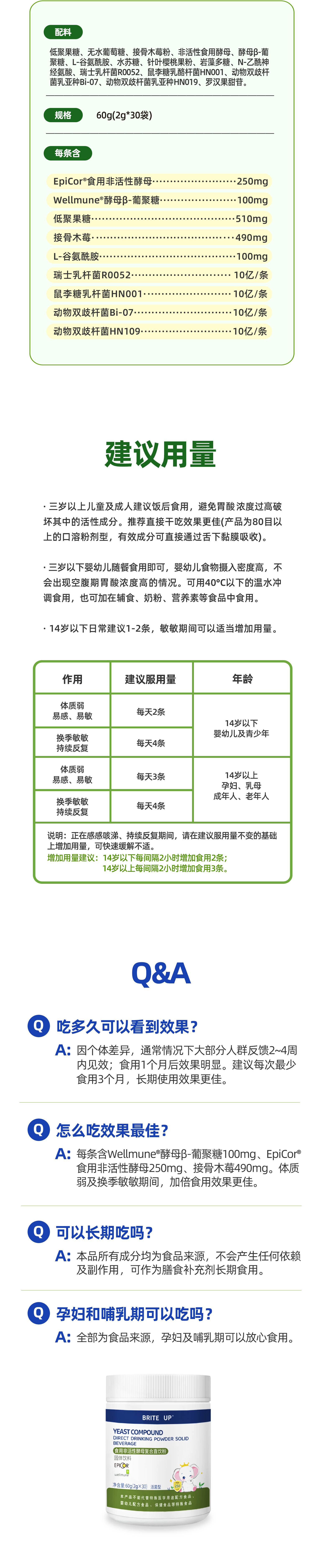 3)食用方法:产品为80目以上直饮粉工艺,推荐直接干吃效果更佳。产品有效成分可直接通过舌下黏膜吸收,并直接作用于上呼吸道黏膜。(冲调时水温控制在40度以下,使用抗生素期间间隔2小时食用。)