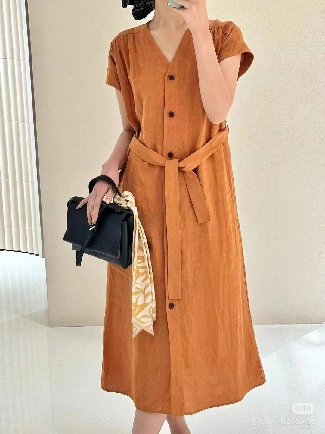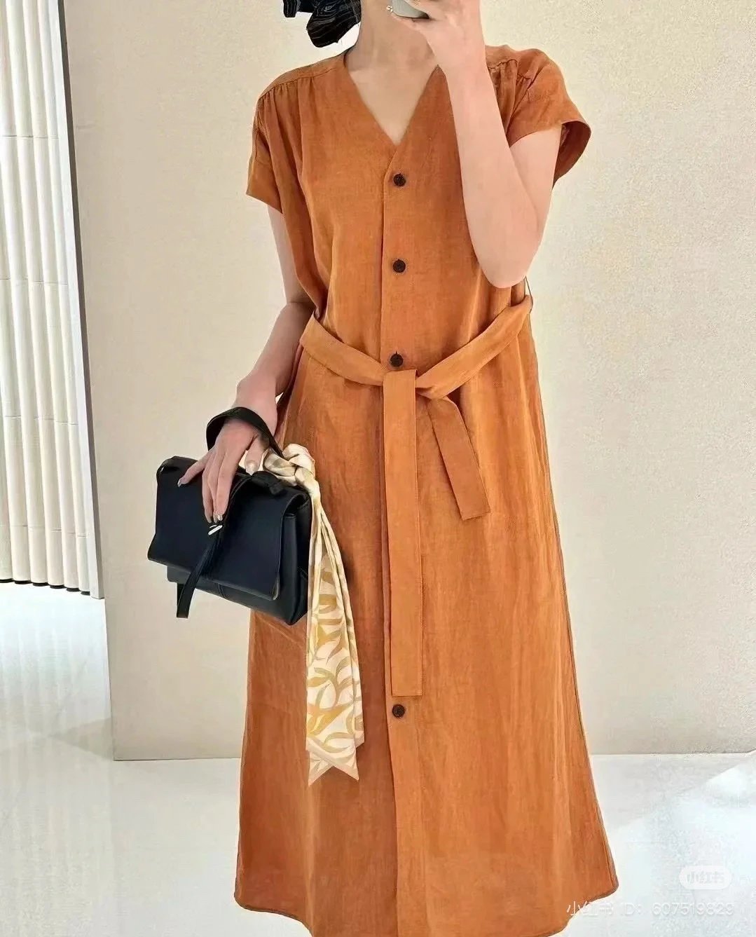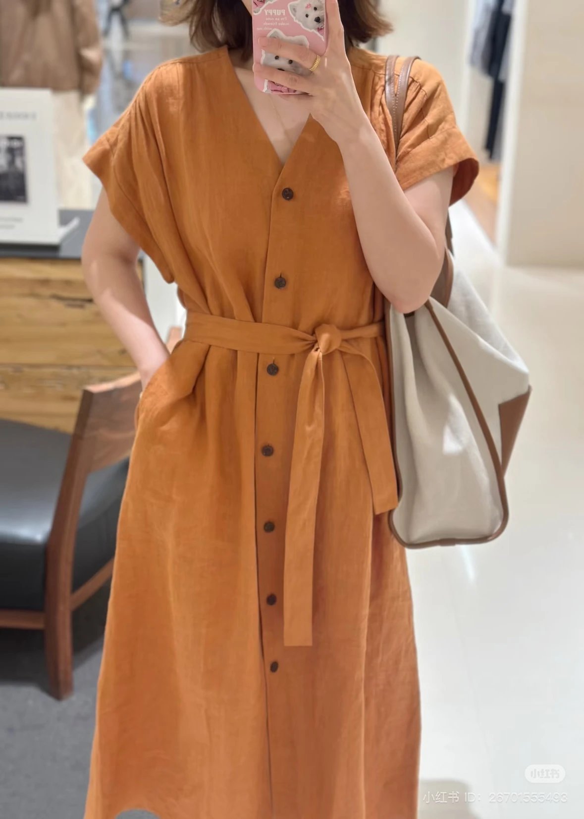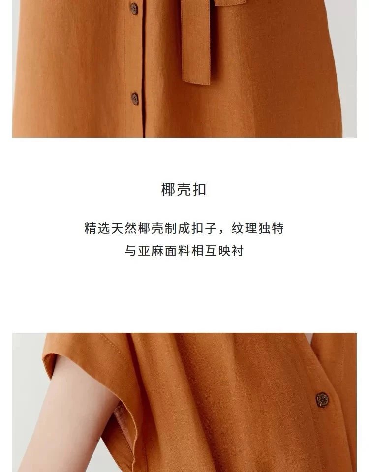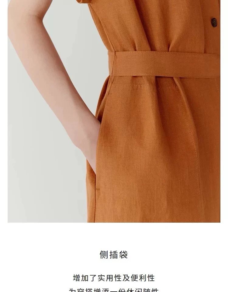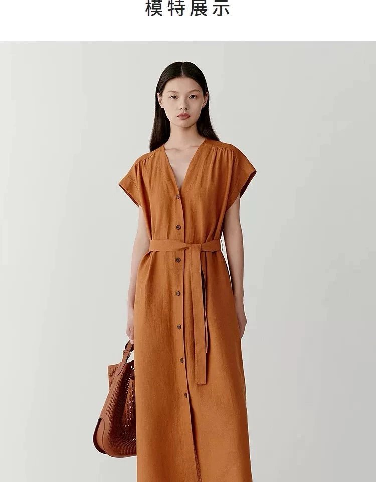 通勤必备 贸易公司 小禾V领风衣式亚麻连衣裙 比利时亚麻连衣裙 轻盈透气