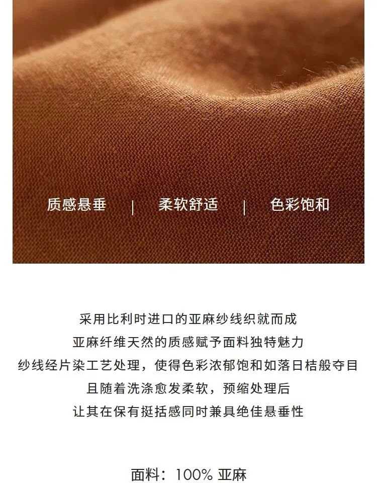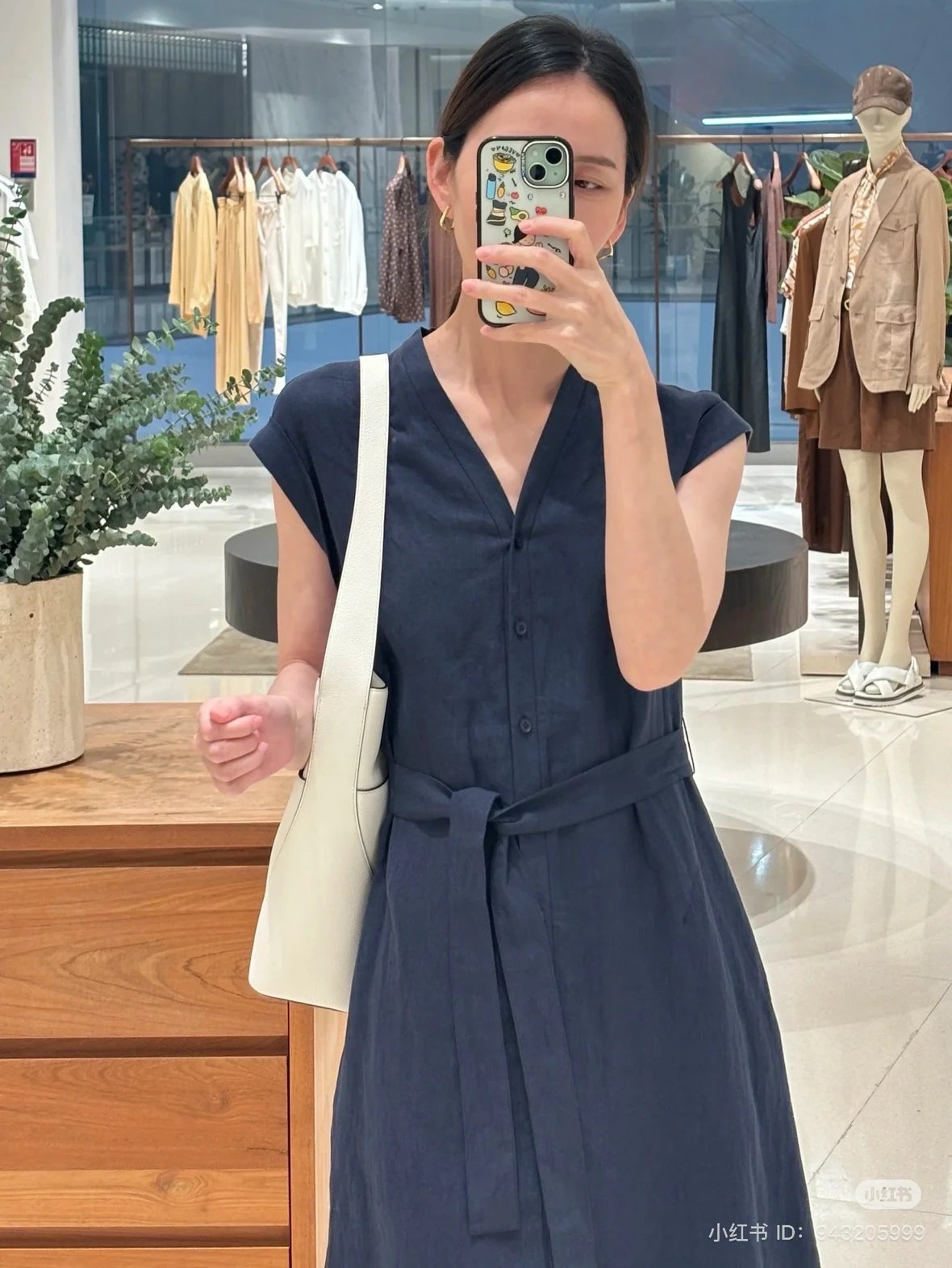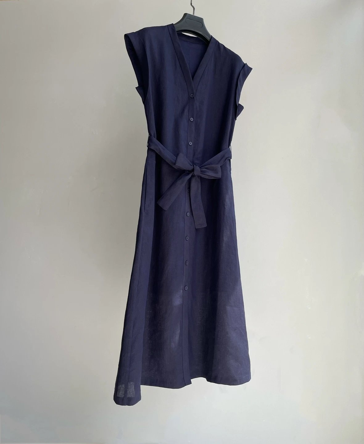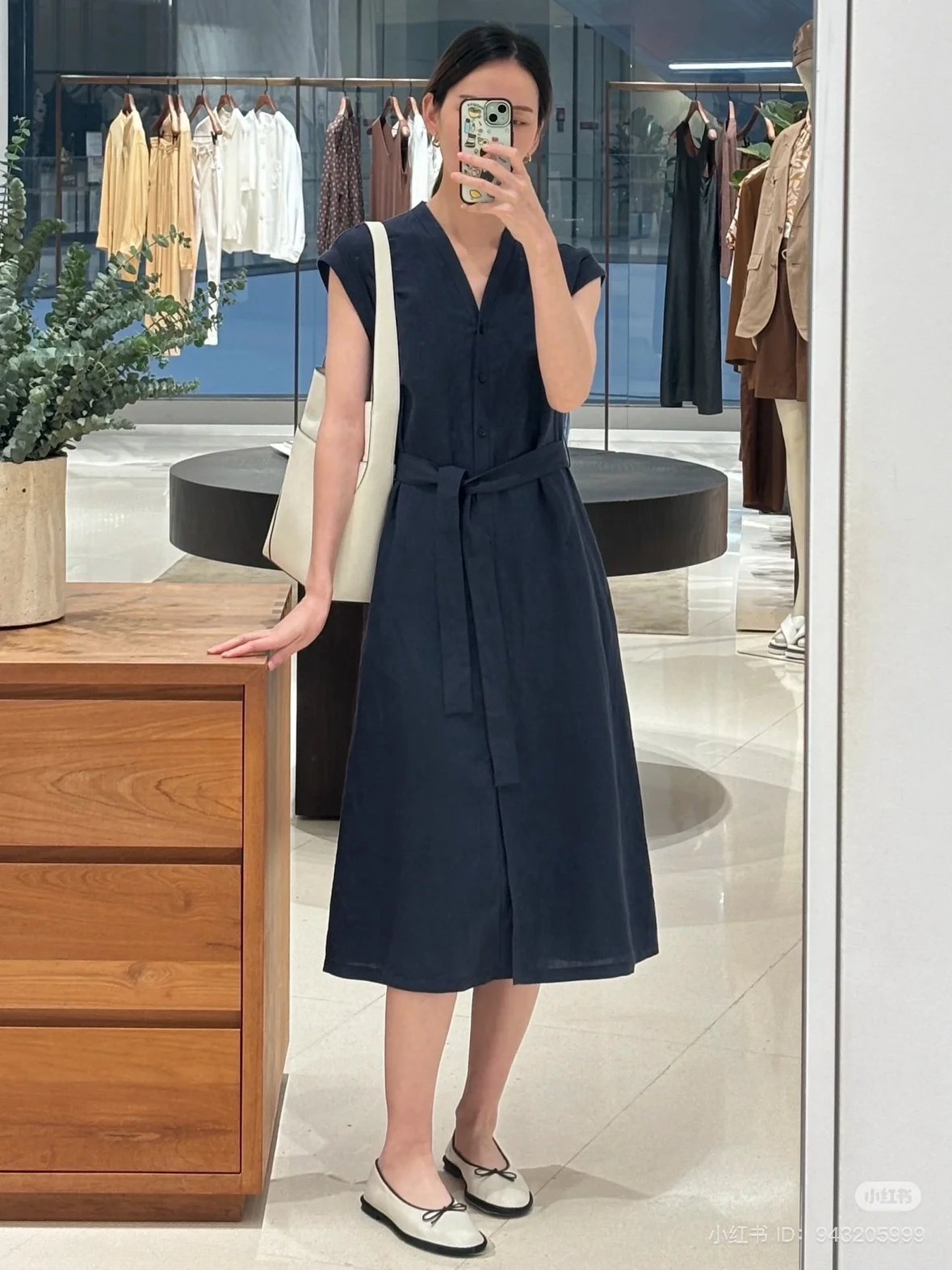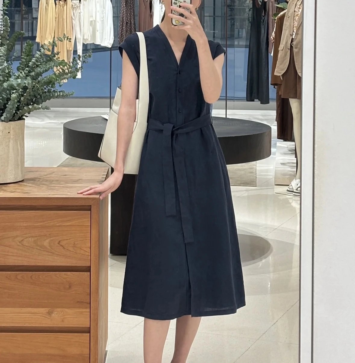 通勤必备 贸易公司 小禾V领风衣式亚麻连衣裙 比利时亚麻连衣裙 轻盈透气