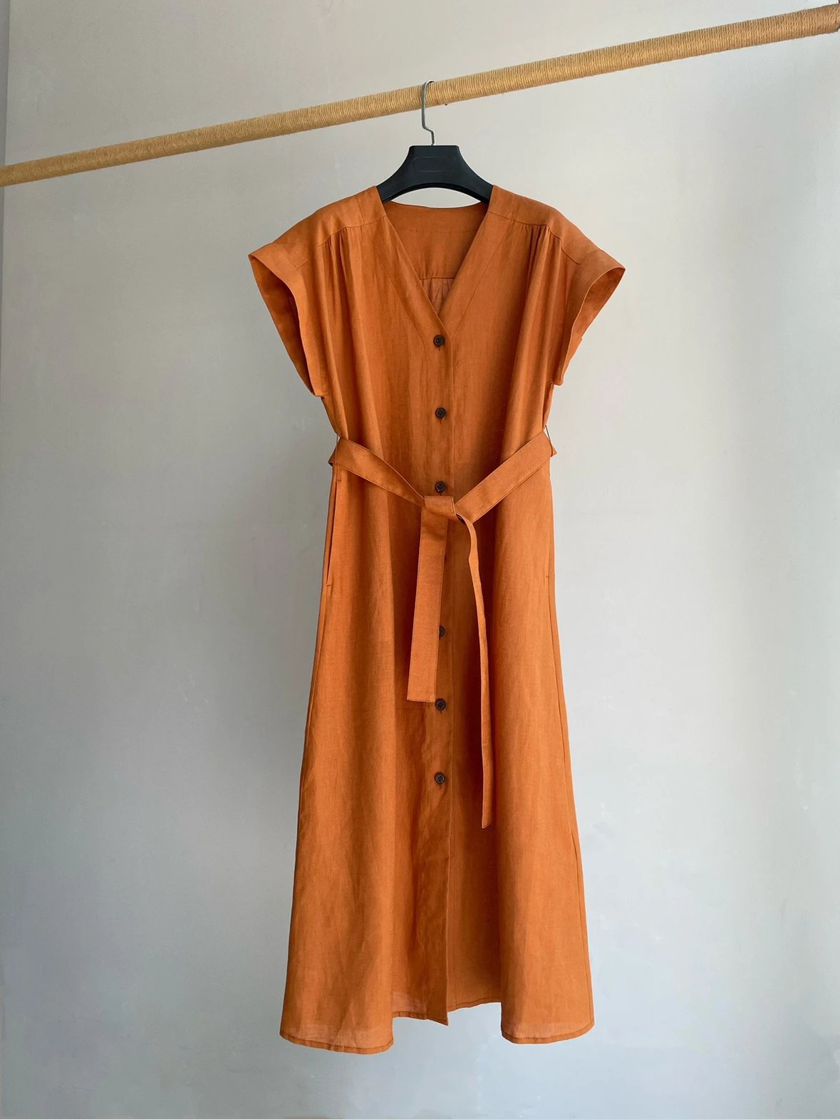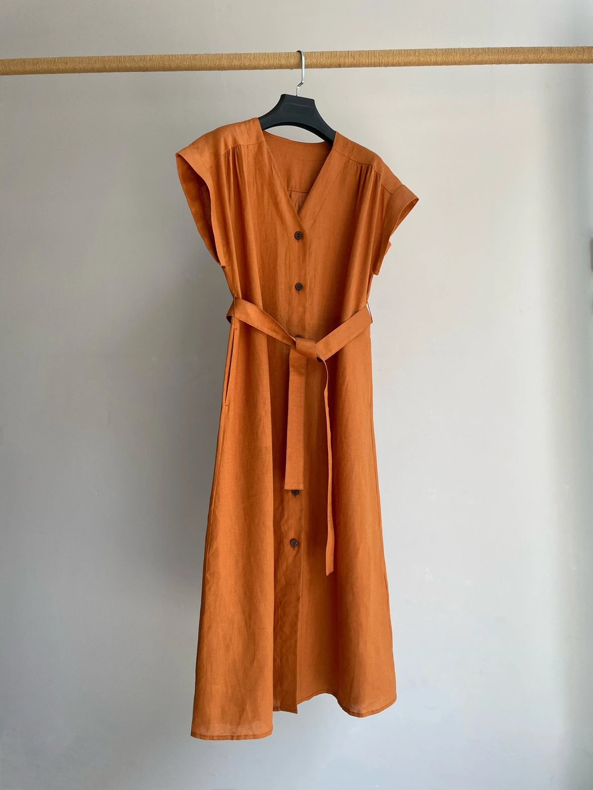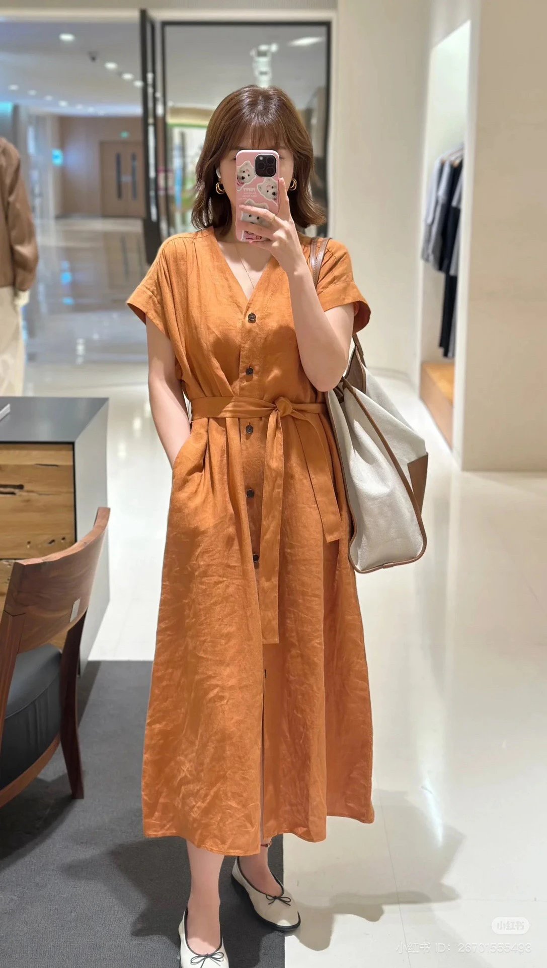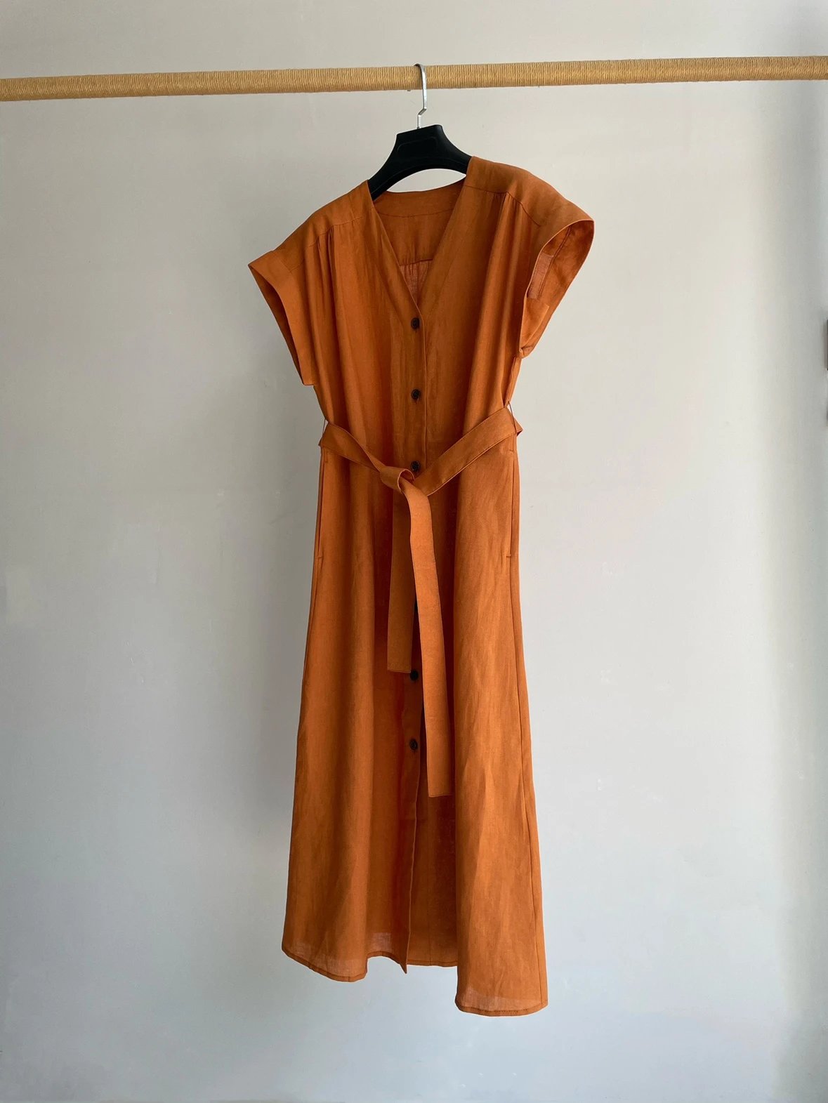 通勤必备 贸易公司 小禾V领风衣式亚麻连衣裙 比利时亚麻连衣裙 轻盈透气