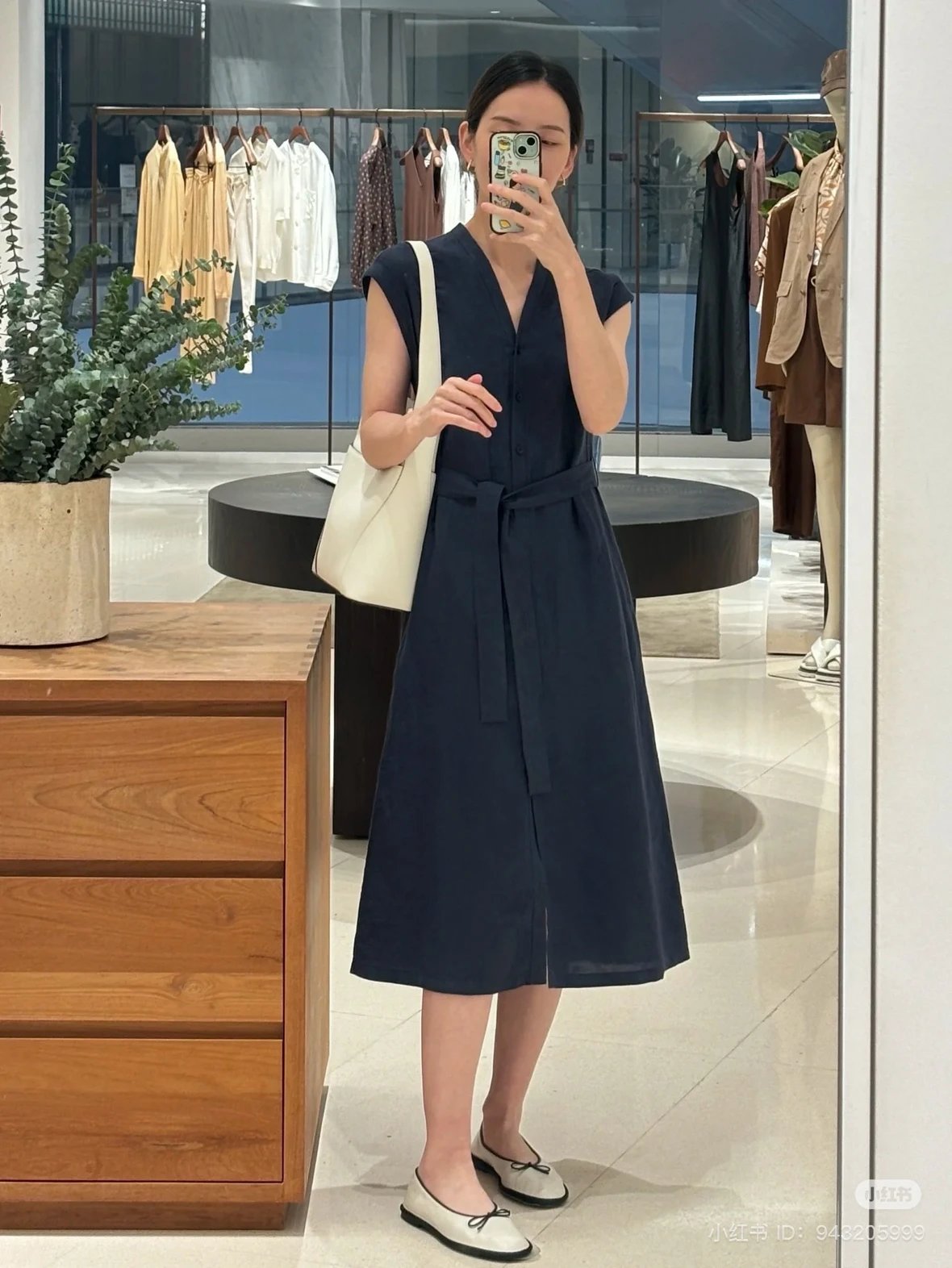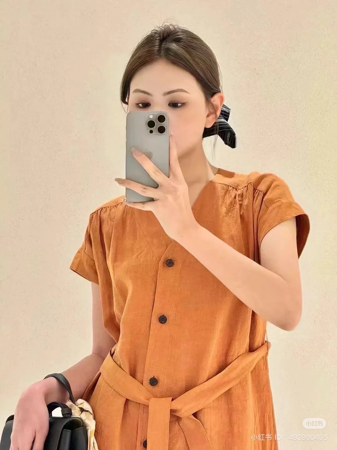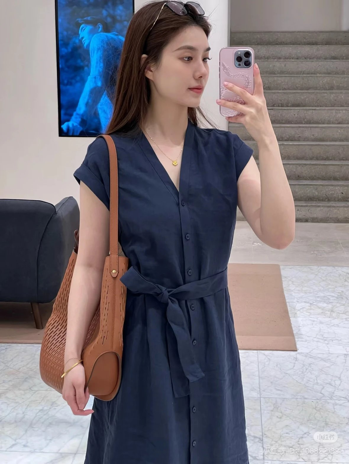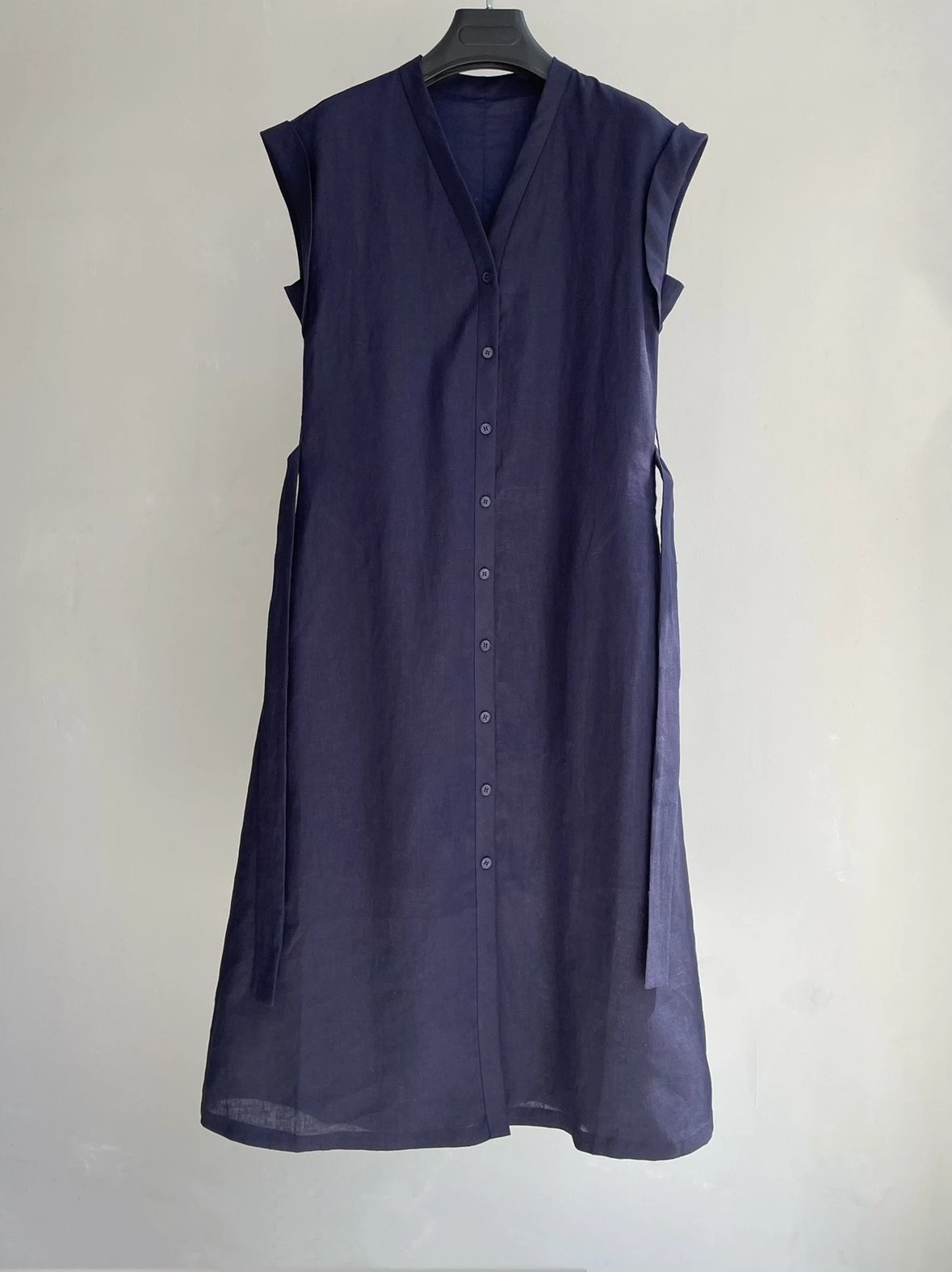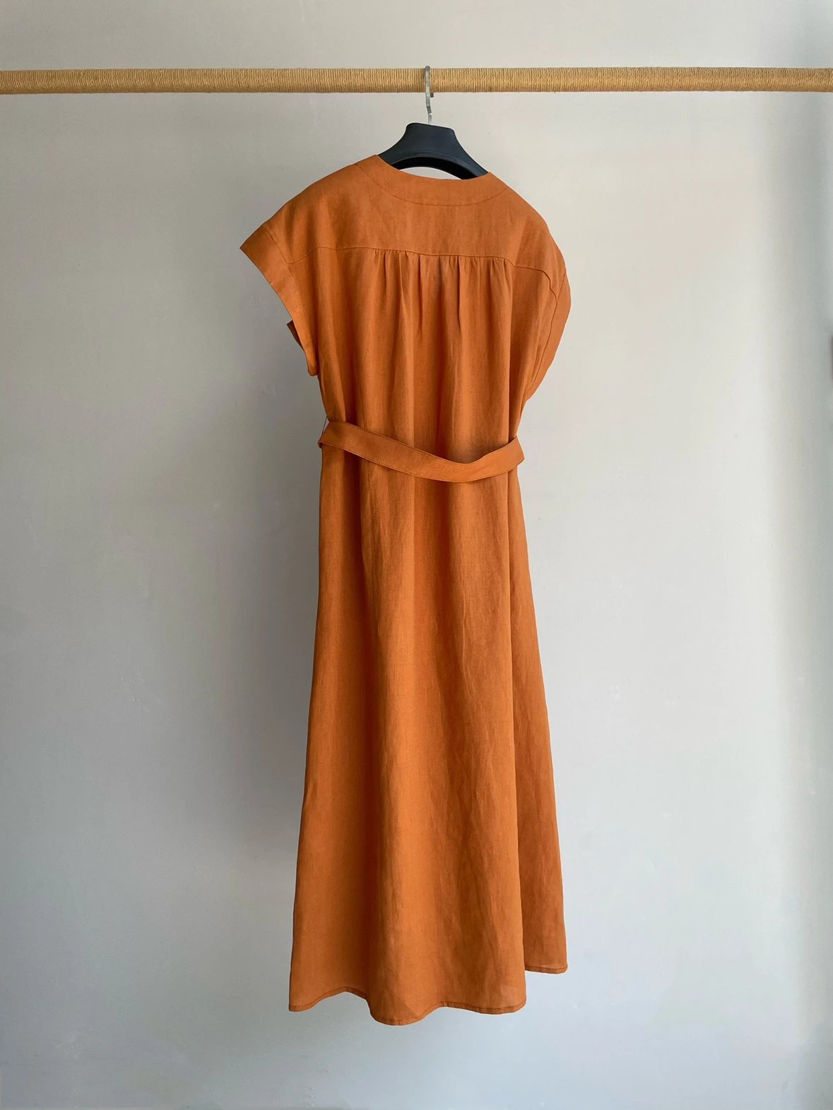 通勤必备 贸易公司 小禾V领风衣式亚麻连衣裙 比利时亚麻连衣裙 轻盈透气