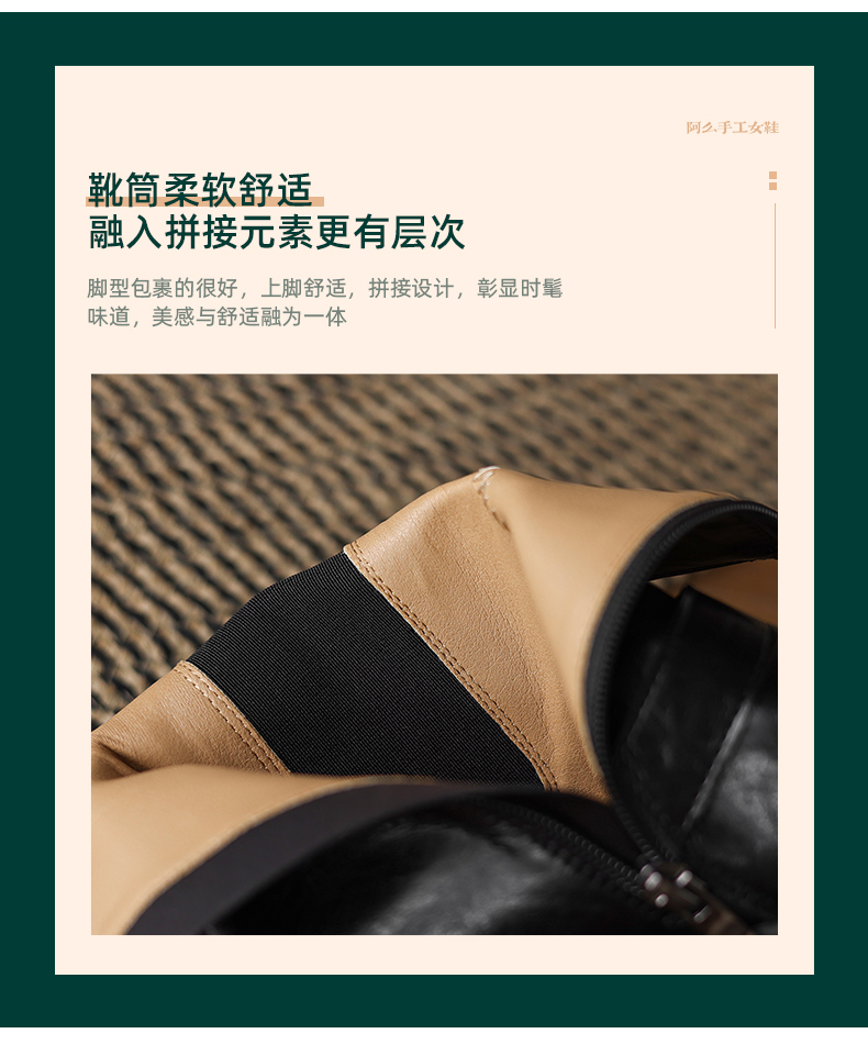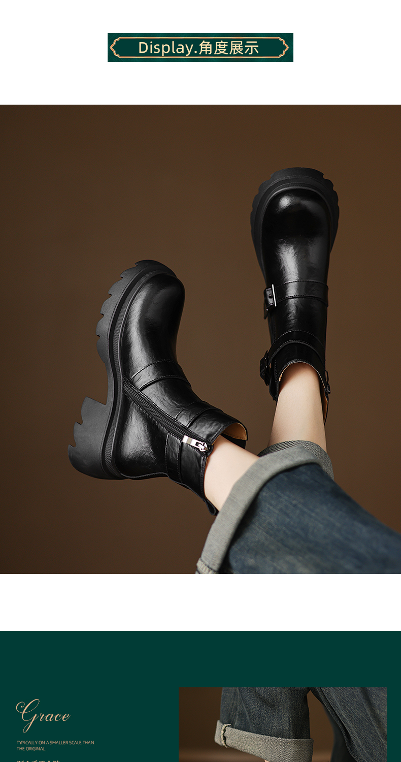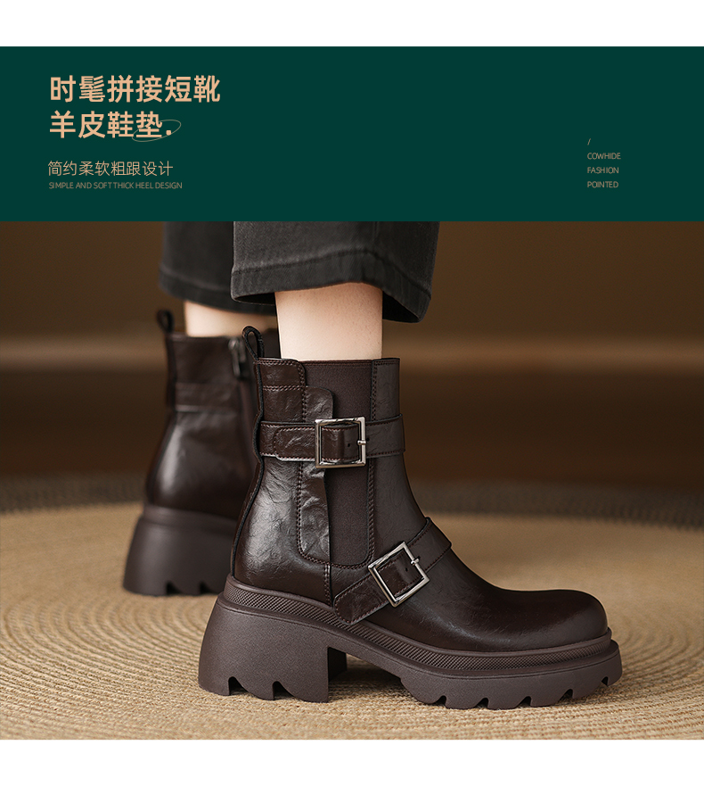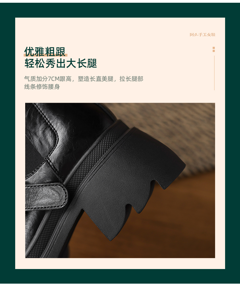 阿么手工女鞋厚底复古机车西部靴女新款旅行高跟双皮带扣短靴7CM