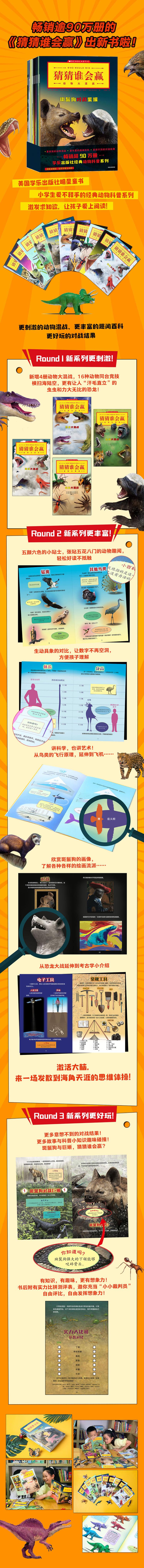 本套书是一套适合5-8岁儿童阅读的系列动物科普书。此前,《猜猜谁会赢》系列已经在中国市场出版了13册,取得了非常优异的销售成绩。此次出版的新书共10册。其中有6册仍然延续之前的体例与风格。每一册介绍了两种相近动物的身体特征、生活习惯、捕食技巧等内容,并设想出二者对抗的情景和结果。作者在书的最后鼓励小读者通过自己分析二者的特点,做出自己的想象和判断。是一套巧妙兼具了知识性、科学性、文学性和趣味性的动物科普系列。新书中还有4册以“擂台赛”的形式编写。即通过罗列数种昆虫、哺乳动物、海洋动物以及恐龙轮番对战,向小读者进行科普。