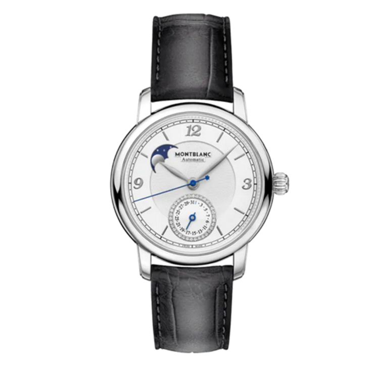 镜面 材质 | 蓝宝石水晶玻璃 | 表盘 | 精钢表壳 银白色表盘,银白色表盘,烟灰色阿拉伯数字和时标;烟灰色叶形时针和秒针,烟灰色巴顿秒针。 日期盘镶钻34颗 日期 月相显示 透底 |