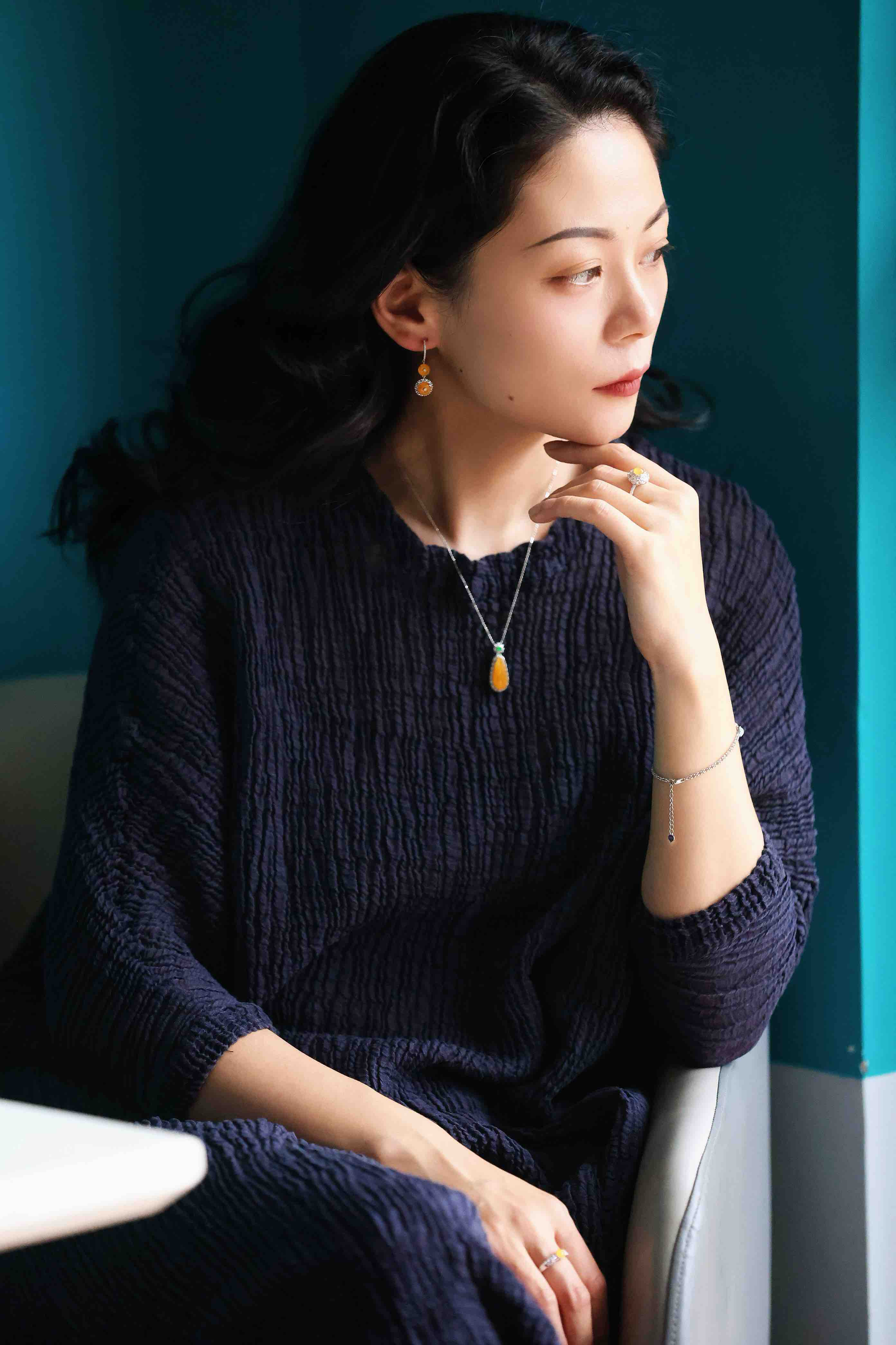 状态可以通过妆容去改变,特别是搭配这套黄色系的翡翠,把整个温柔而又不失力量感的气场诠释的很好。