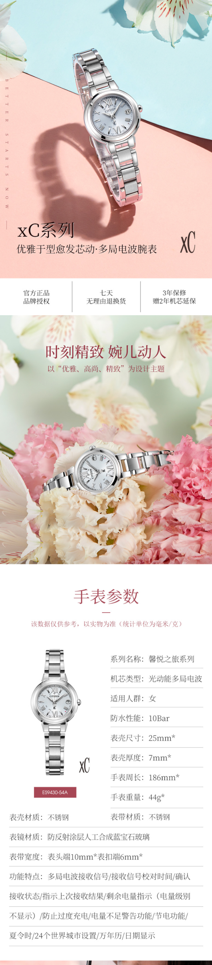 西铁城日本正品光动能不锈钢多局电波万年历女表ES9430-54A
