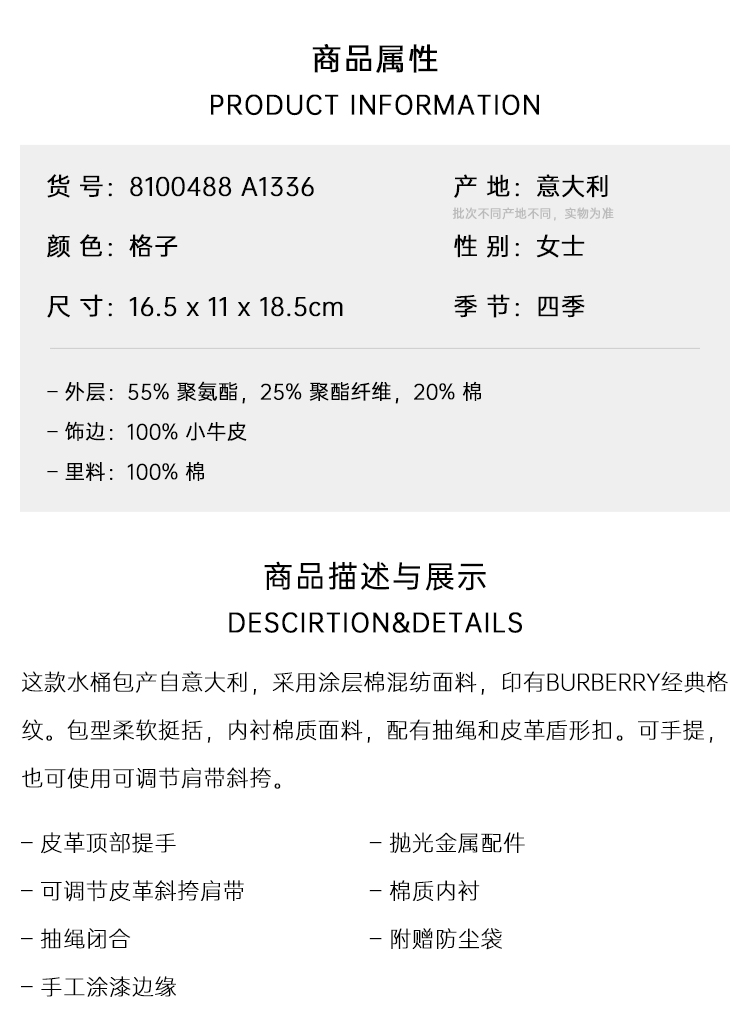【一】BURBERRY 巴宝莉 女士迷你格纹水桶包 格子色 8100488 A1336