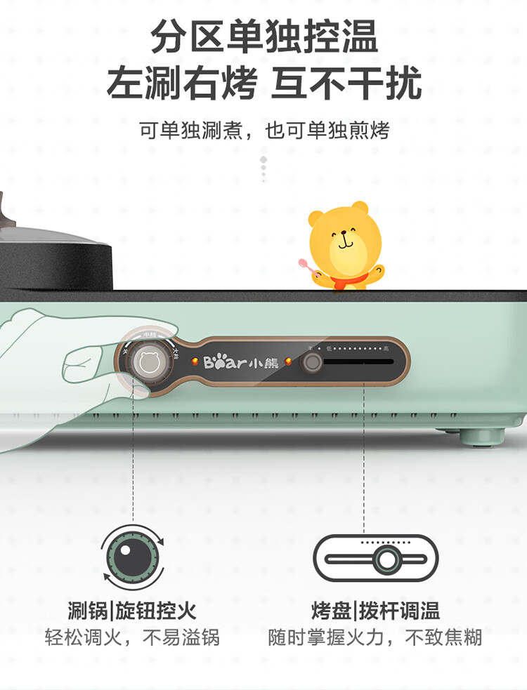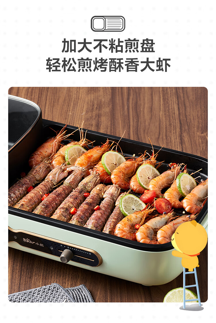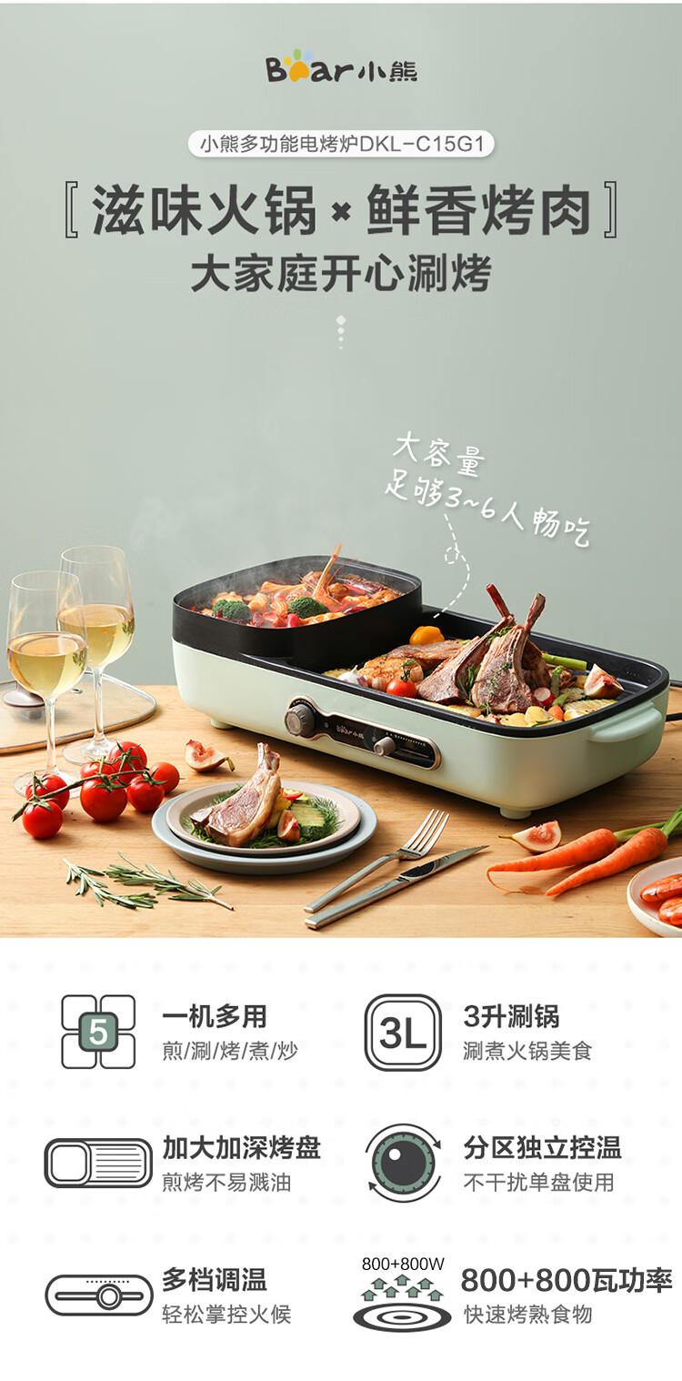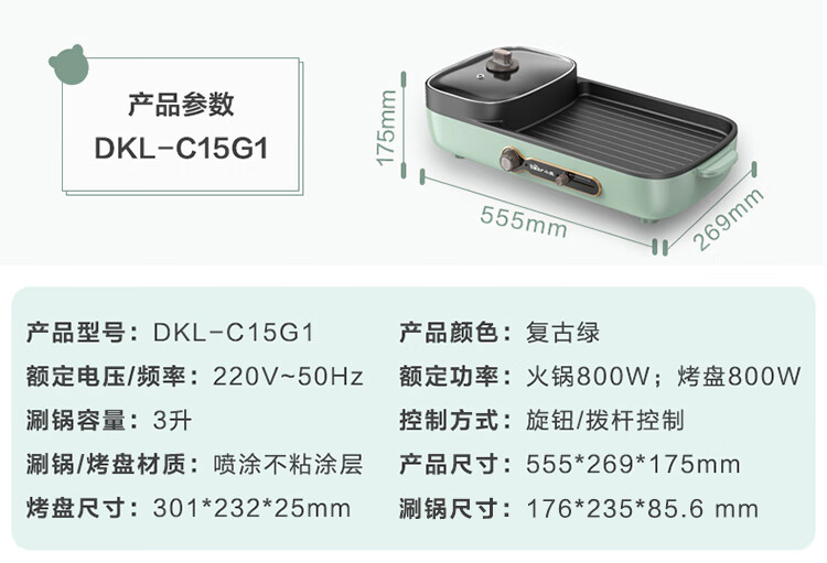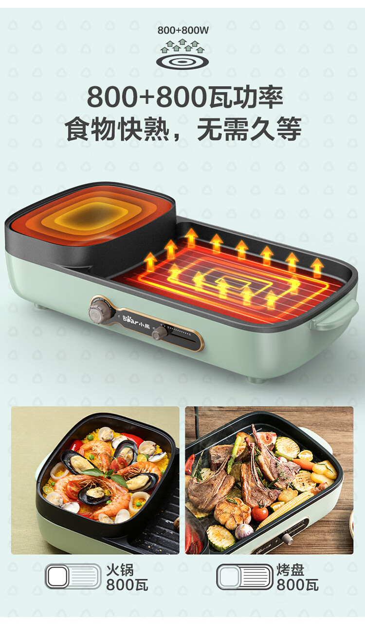 小熊多功能锅 家用电烧烤炉料理电火锅 无烟烤肉机烤涮一体锅 DKL-C15G1 复古绿