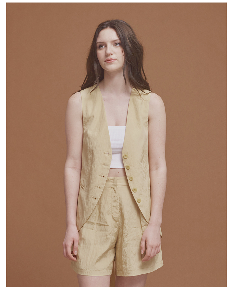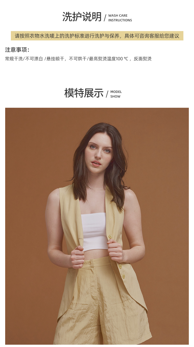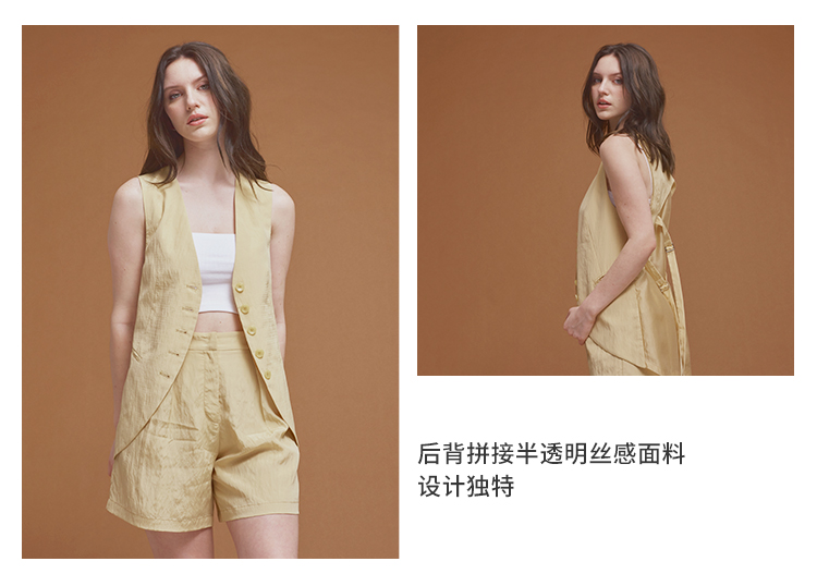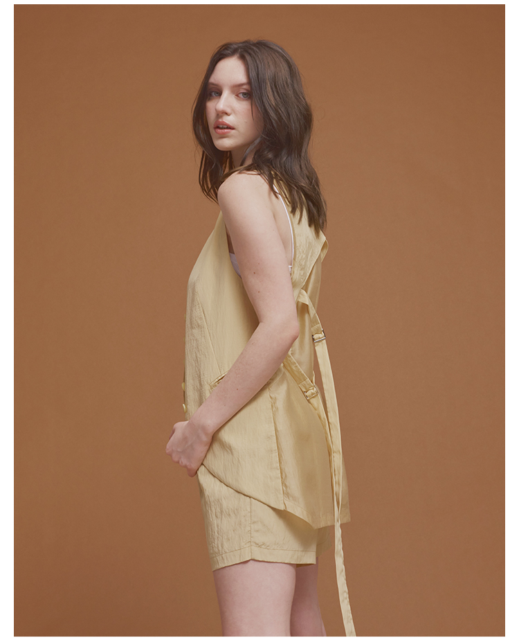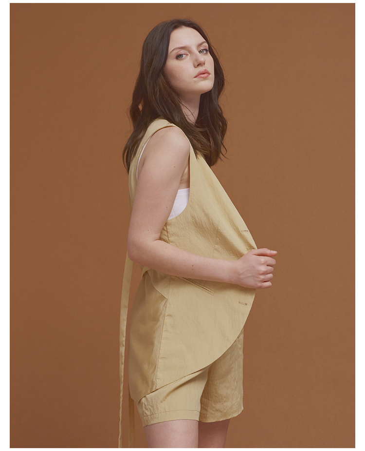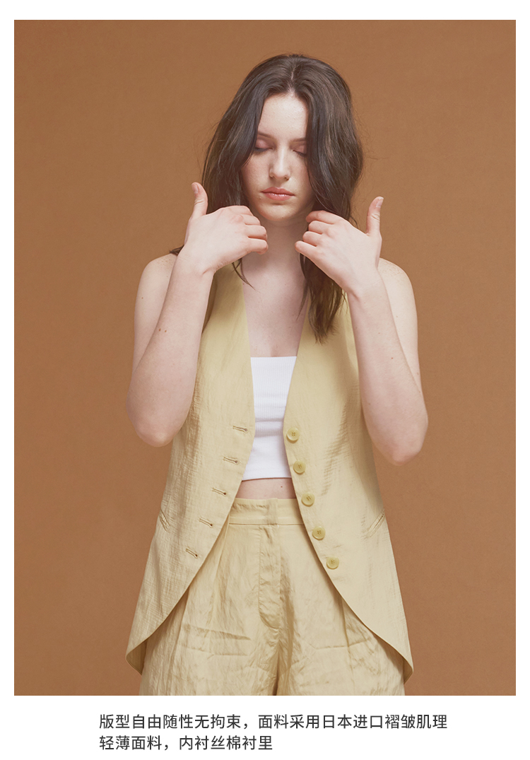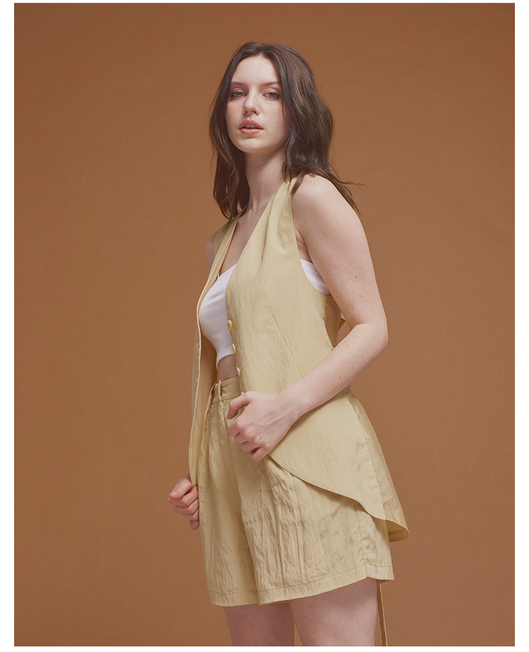 蜜黄色|收腰大斜角前门襟褶皱肌理拼接马甲 /直筒型短裤