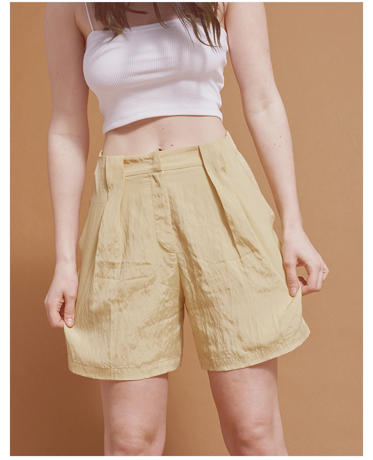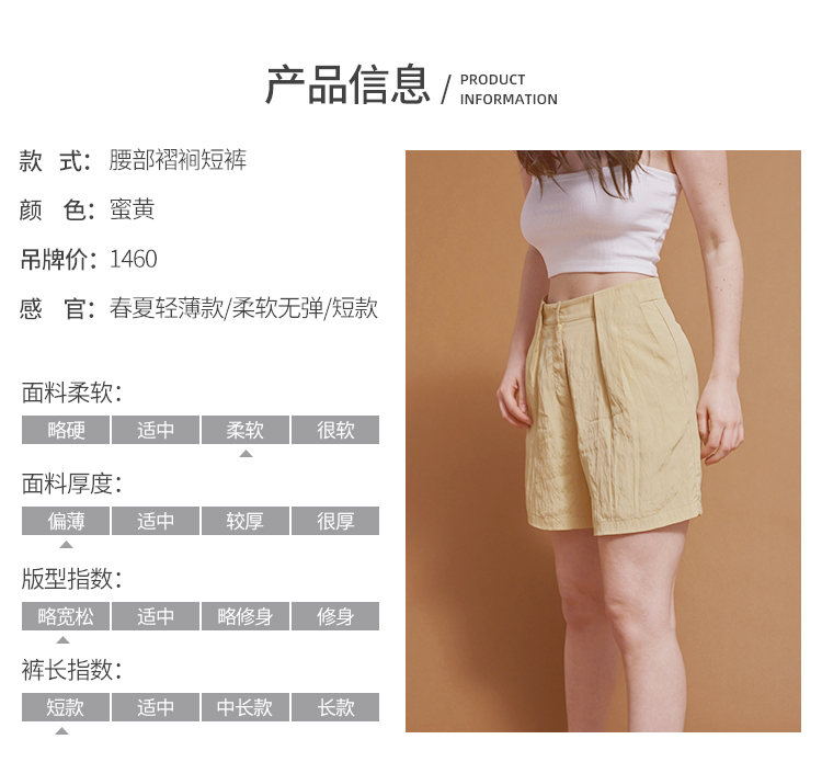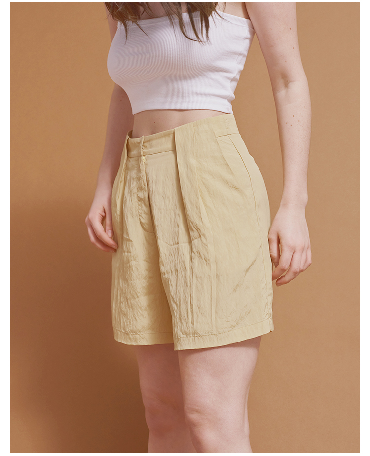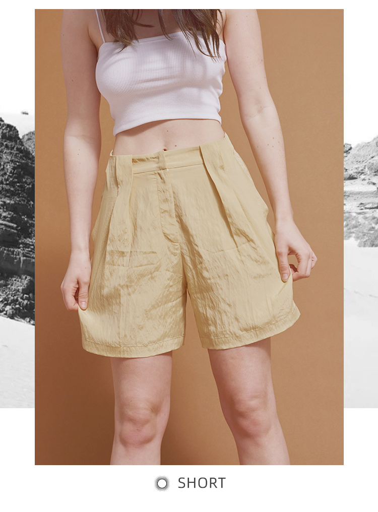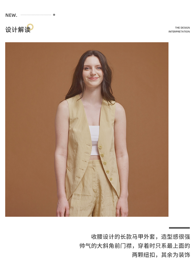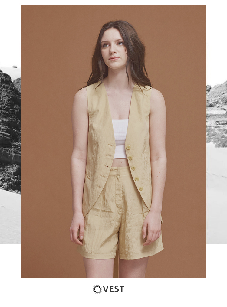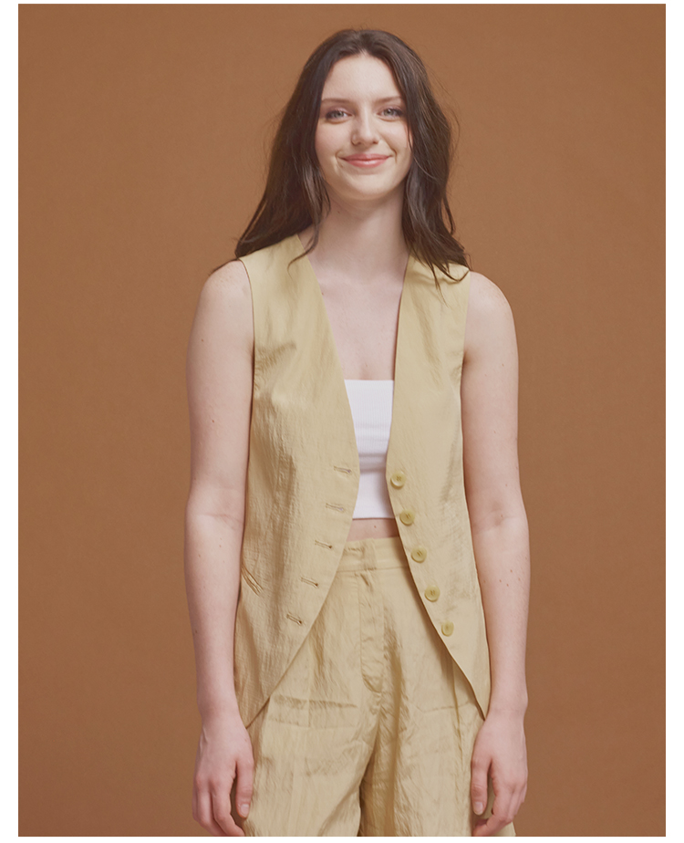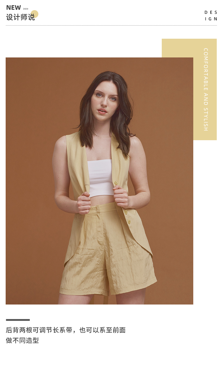 蜜黄色|收腰大斜角前门襟褶皱肌理拼接马甲 /直筒型短裤