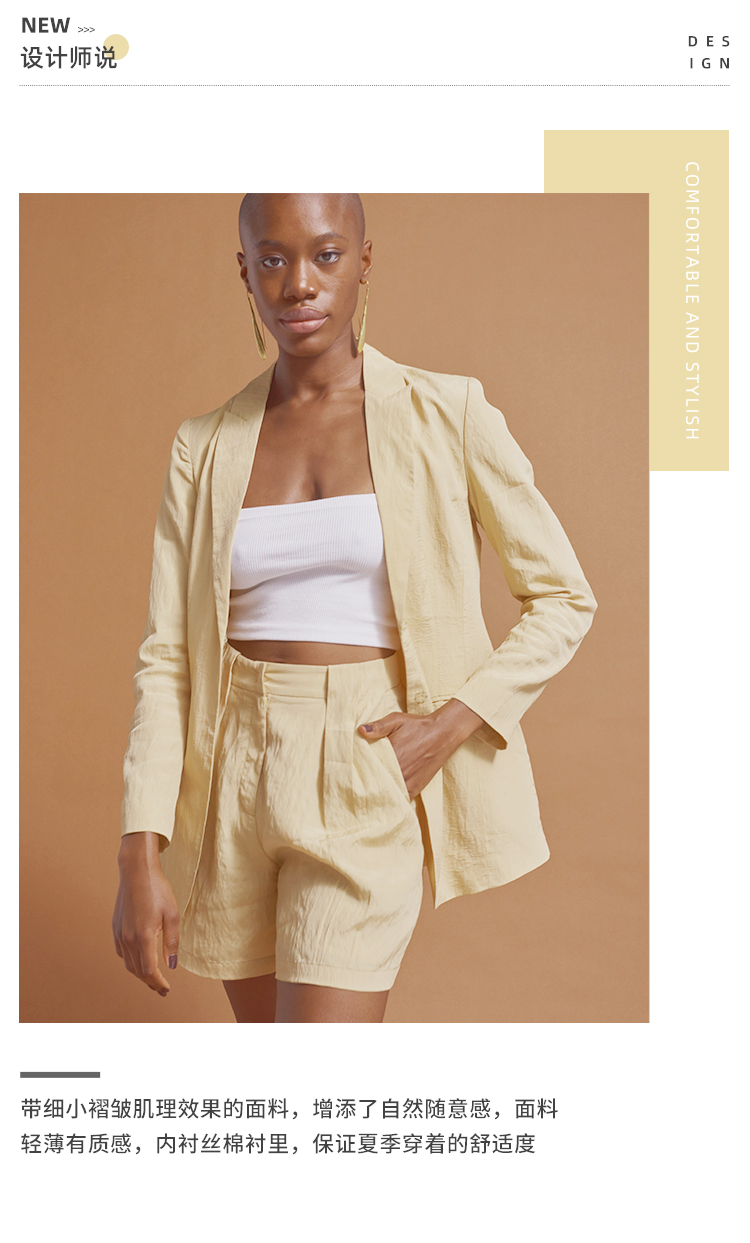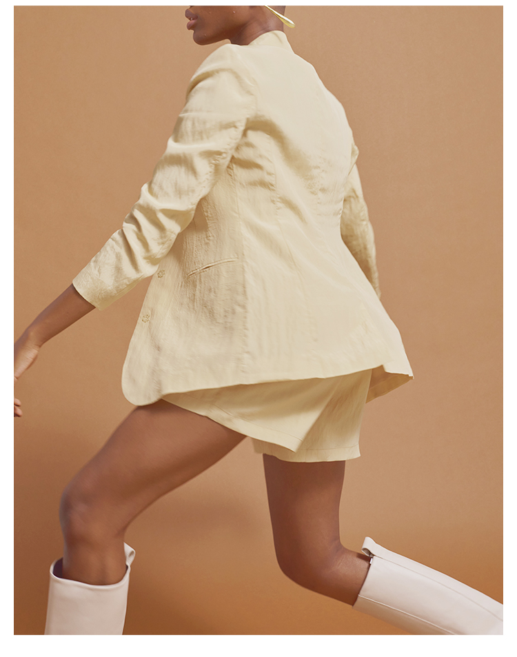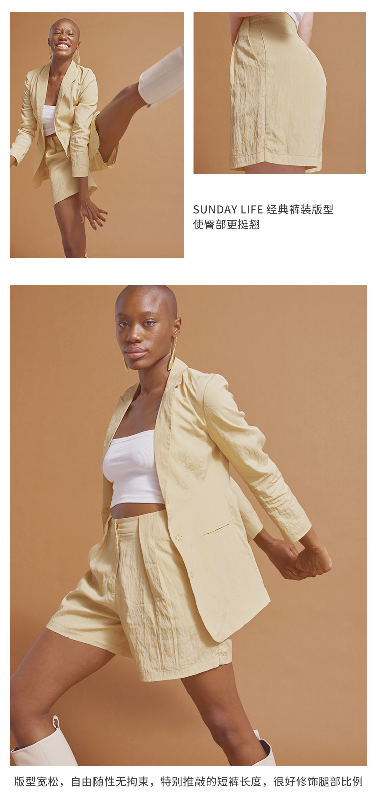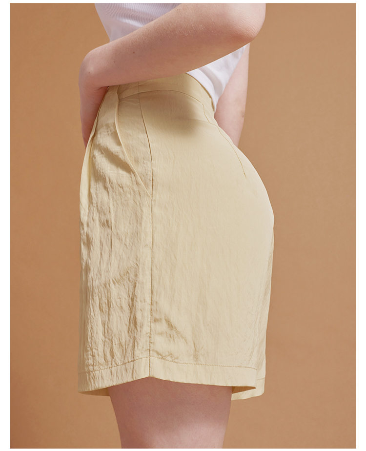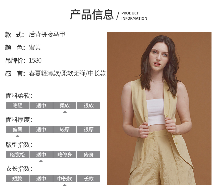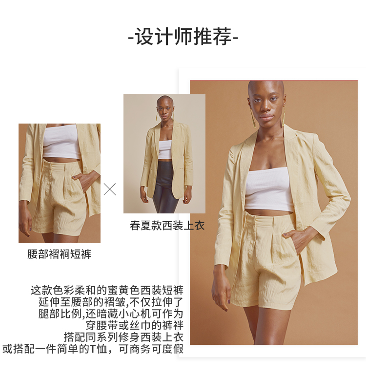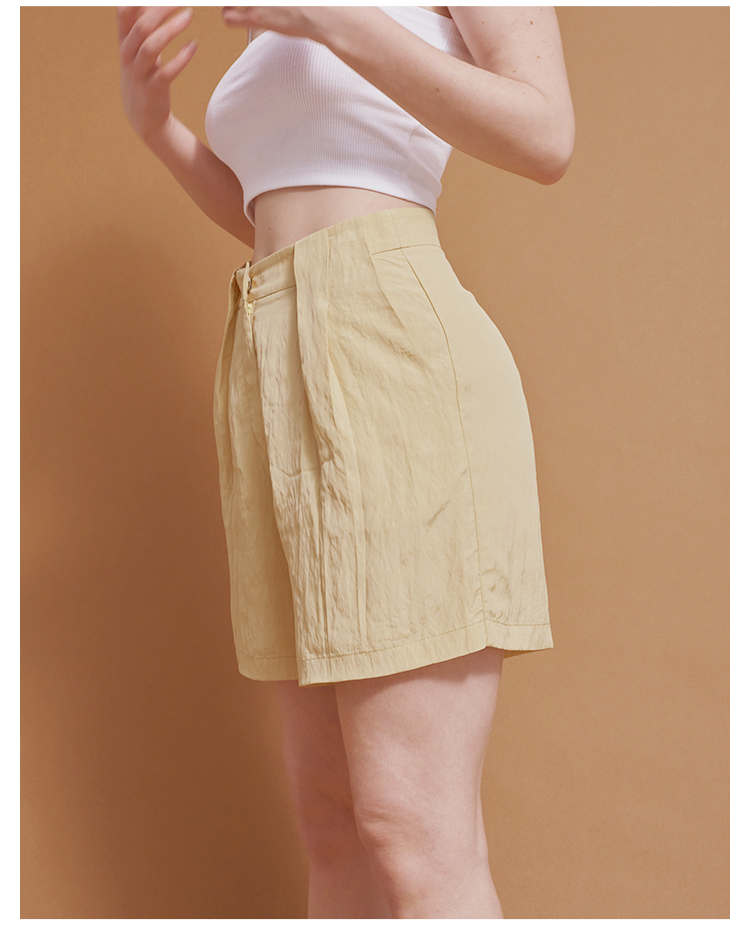 蜜黄色|收腰大斜角前门襟褶皱肌理拼接马甲 /直筒型短裤