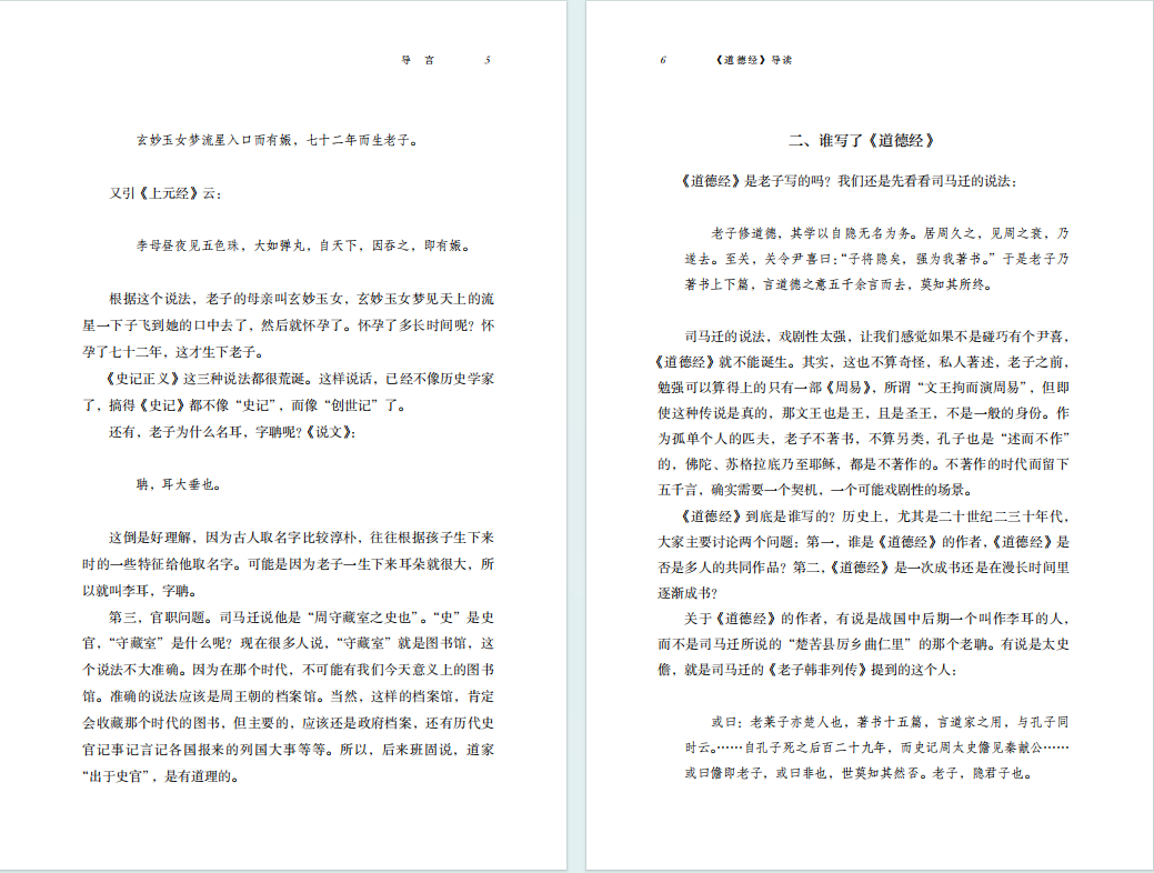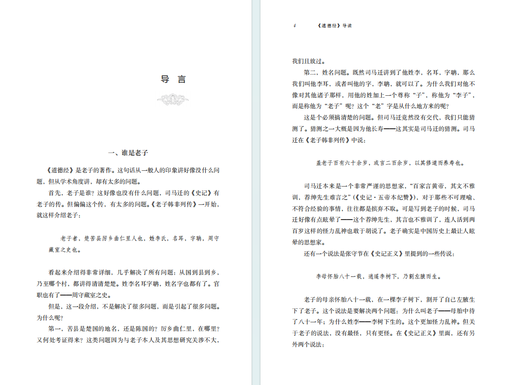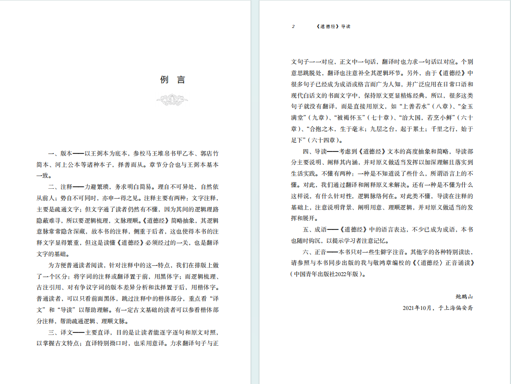 本书是鲍鹏山教授对中国传统经典《道德经》的导读之作。鲍鹏山教授以通行的王弼本为底本,参校帛书甲乙本、郭店竹简本、河上公本等诸种本子,尽可能地保留和还原流传千年的《道德经》的文本形态。各章由原文、今译、注释、导读、链接和成语六个部分构成,严谨地选择、恰当地申说各家解说,有时也呈列数家相异之说,分别指其可取之处。全书旨趣分明,将老子的玄理阐释清楚,使读者能够用日常生活经验来理解,同时又不致把玄理浅薄化,保持了《道德经》的玄理高度。