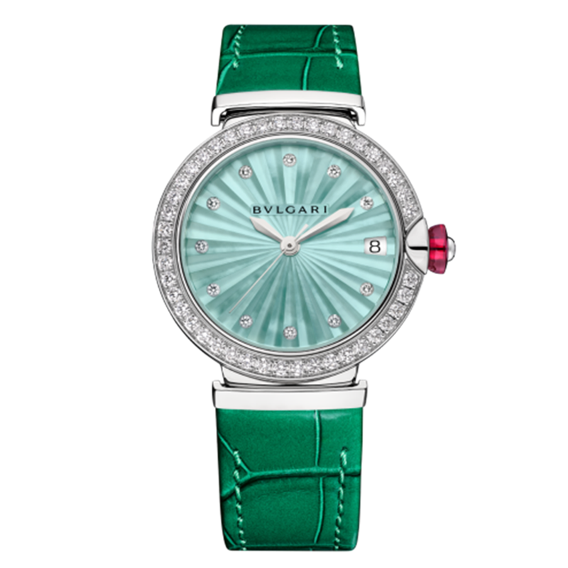 镜面 材质 | 蓝宝石水晶玻璃 | 表盘 | 精钢表壳,表圈镶嵌钻石 绿色珍珠母贝嵌花细工表盘 11颗圆形钻石时标 日期显示 精钢表圈镶嵌圆形明亮式切割钻石,精钢表冠镶嵌一颗凸形蛋面切割科技红碧玺和一颗圆形钻石 |
