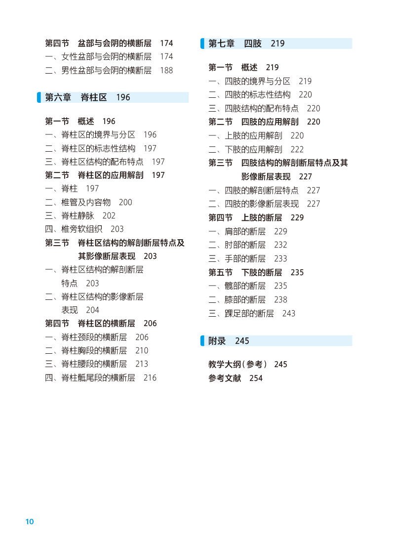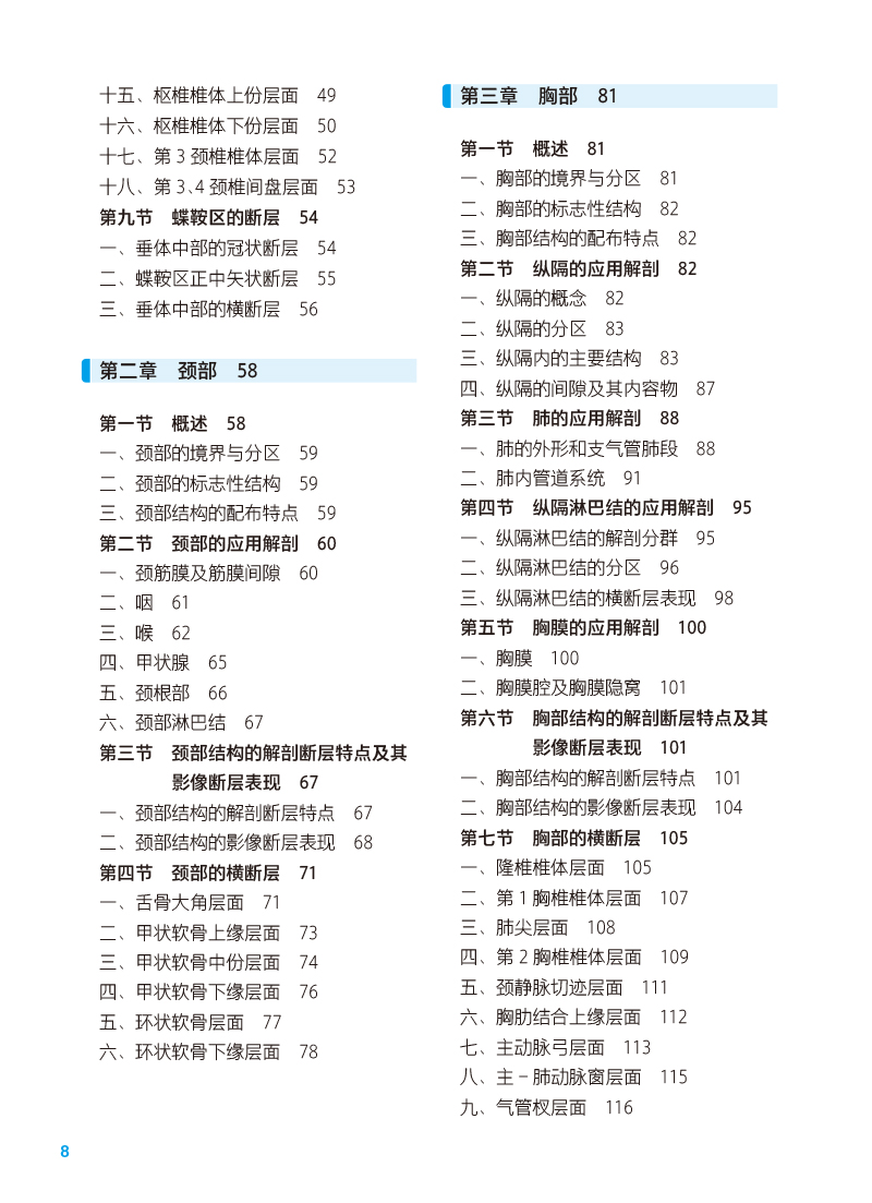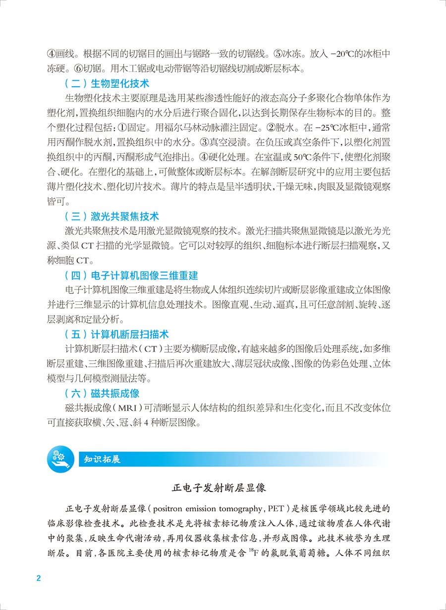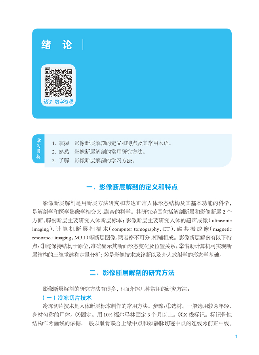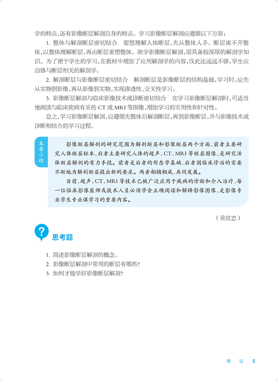 内容提要:为满足中职影像学生学习影像断层解剖的需要,编写时既考虑了学生的学习基础,又考虑学习的实用性,尽力做到了以下几个方面:①断层的选择。影像断层解剖以横断层为主描述人体重要和关键层面中结构的形态、位置、毗邻及其变化,突出重点;结合临床影像检查的需要,个别部位增加了矢状断层和冠状断层。②内容的排序。影像断层解剖主要内容的顺序为:应用解剖→解剖断层→影像断层。内容顺序安排符合学生的学习规律,即先学习相关的人体整体解剖,再学习解剖断层,逐步过渡到影像断层的学习,并尽力使人体整体解剖、解剖断层与影像断层三者的知识融为一体。