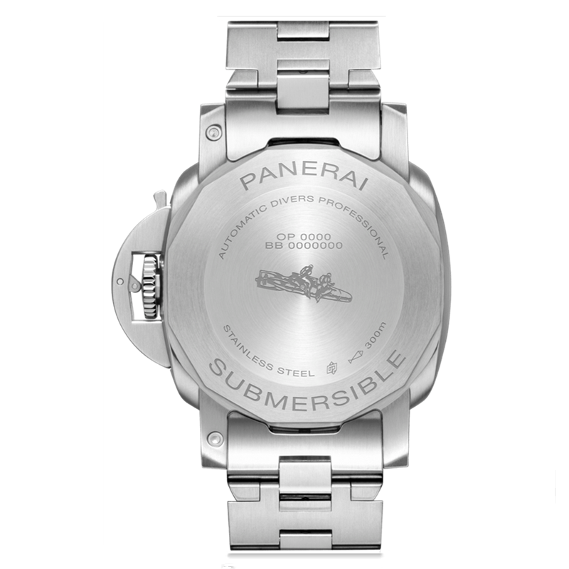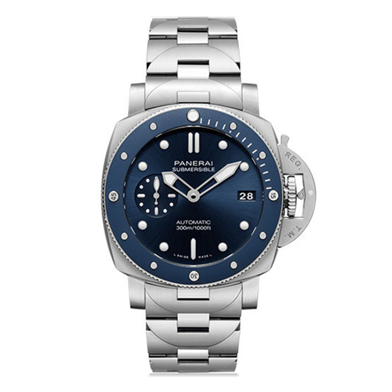 镜面材质 | 蓝宝石水晶玻璃 | 表盘 | AISI 316L精钢表壳 蓝色表盘。搭配夜光涂层小时刻度。 3点钟方位设日期显示,9点钟方位设小秒盘 单向旋转表圈,配蓝色嵌入式陶瓷转盘,逆时针旋转表圈附分度标 旋入式表冠,磨砂精钢表冠护桥 (沛纳海专利) |