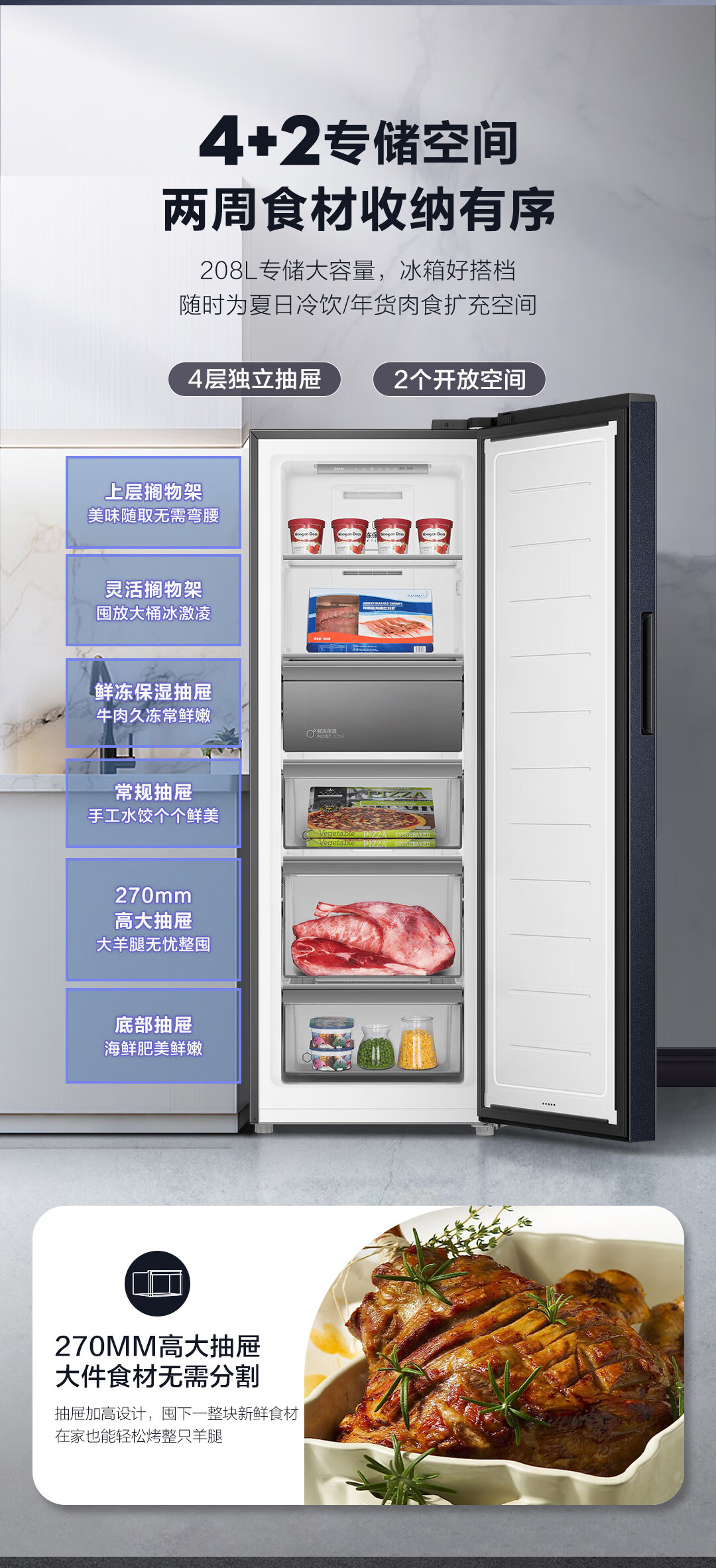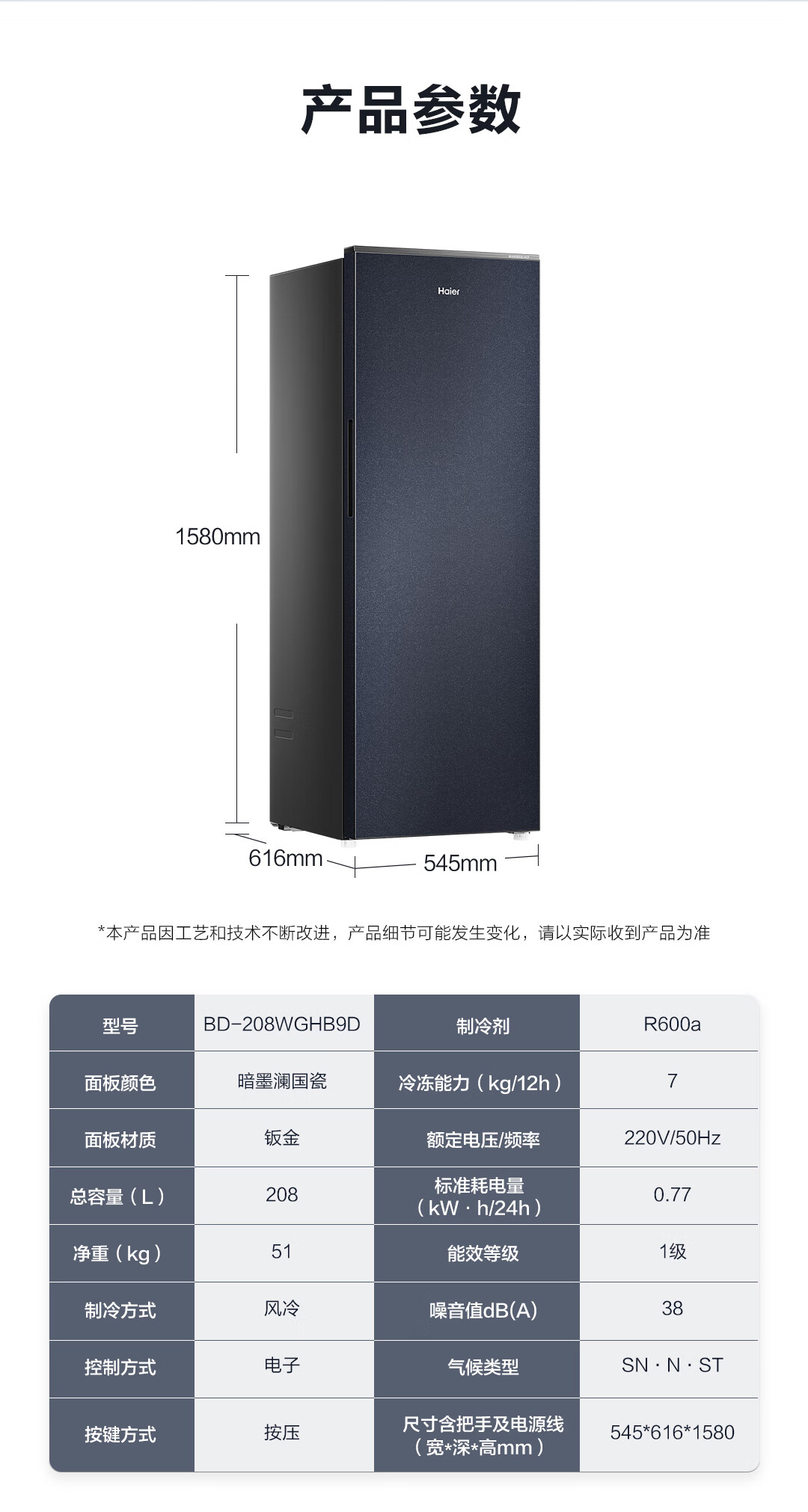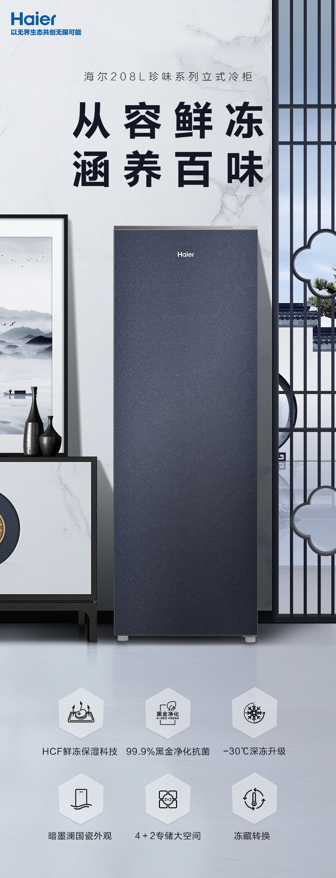海尔(Haier)国瓷系列208升一级能效风冷家用立式冷藏冷冻柜抽屉式冷柜小冰柜家用小冰箱BD-208WGHB9D