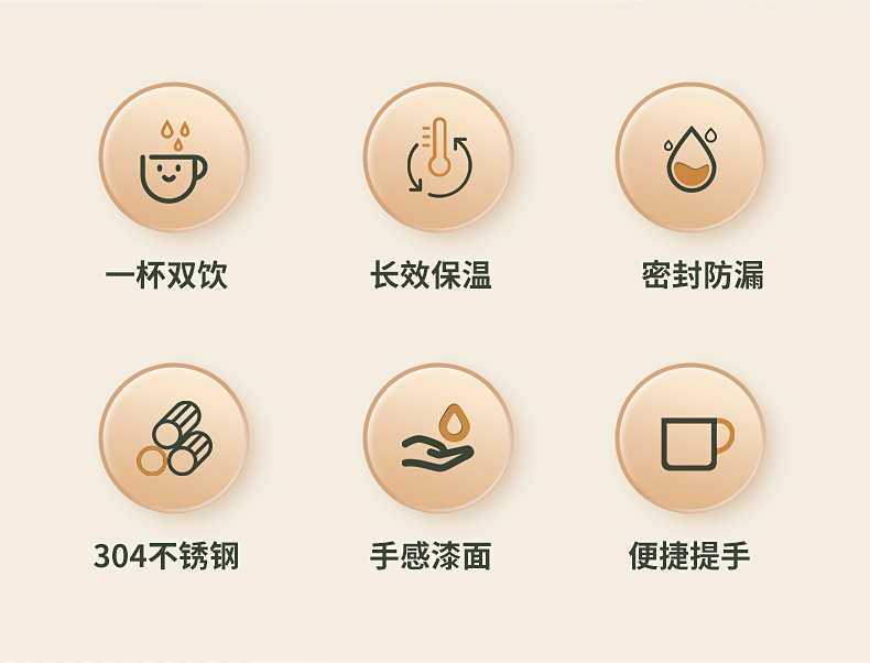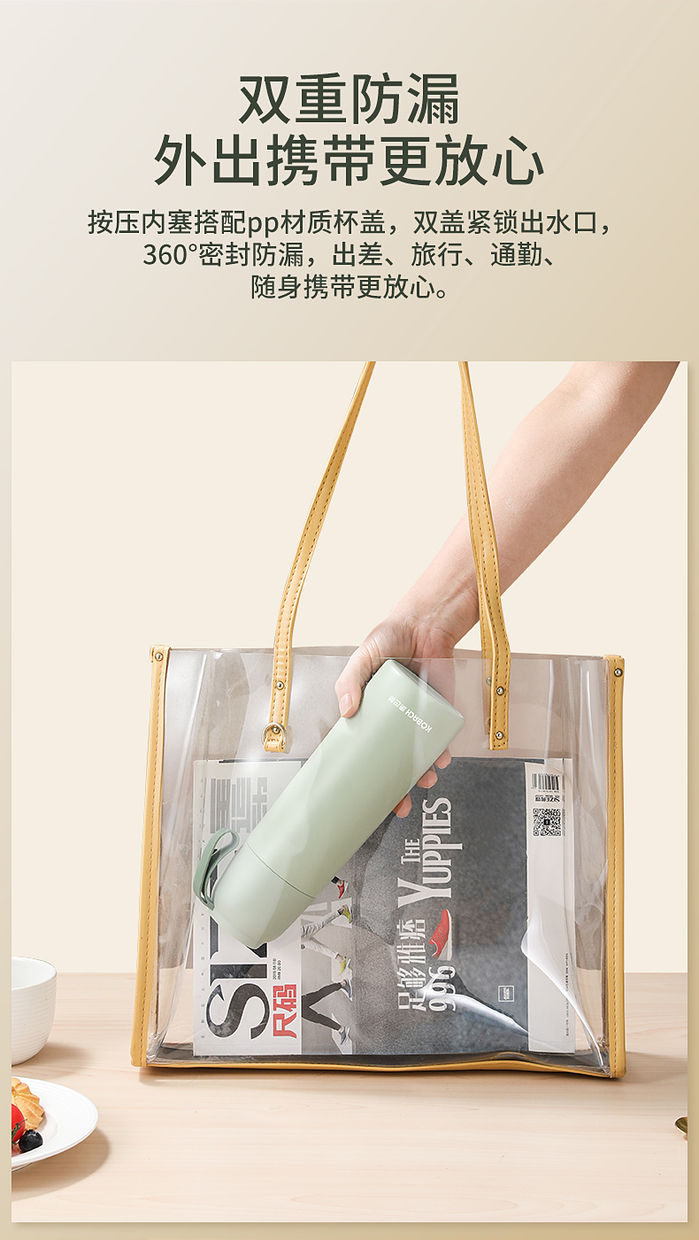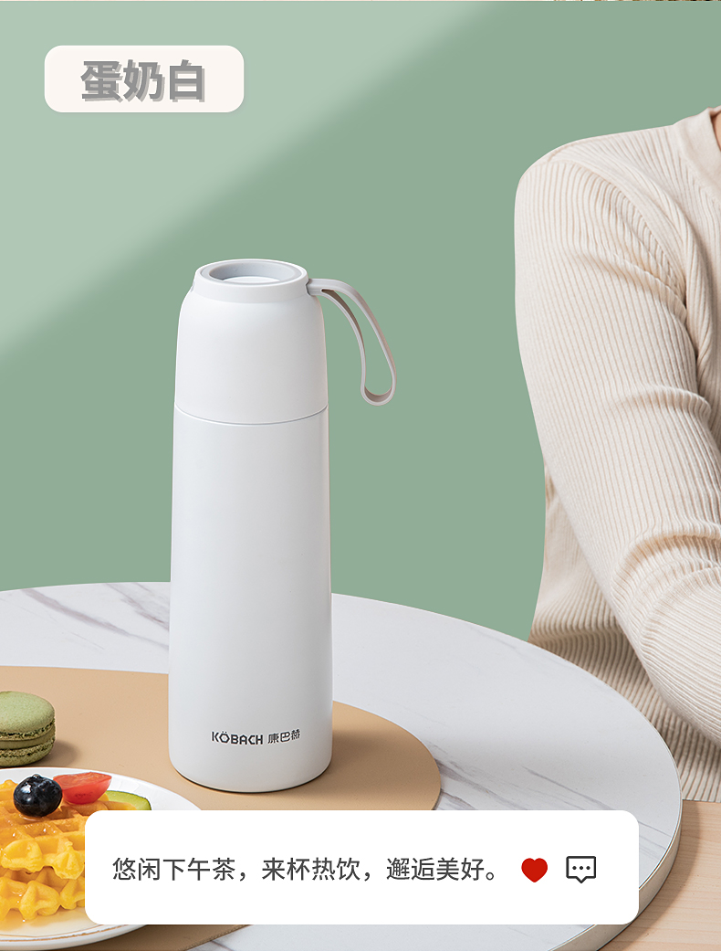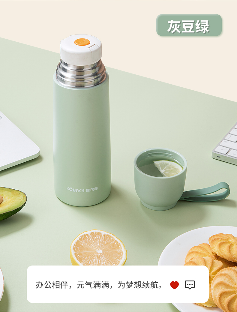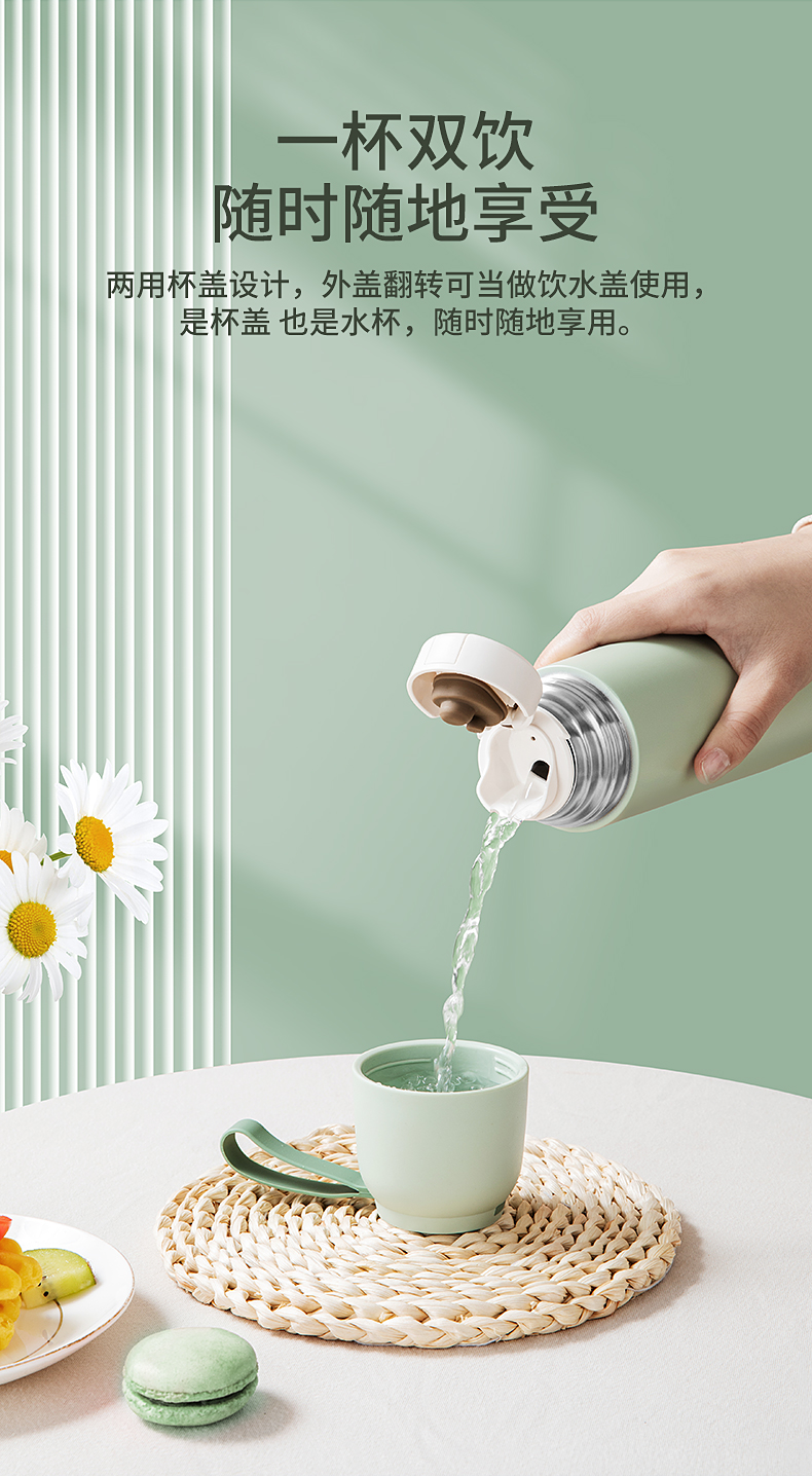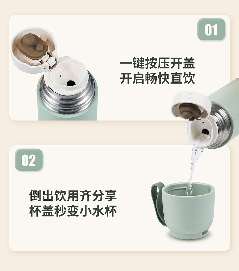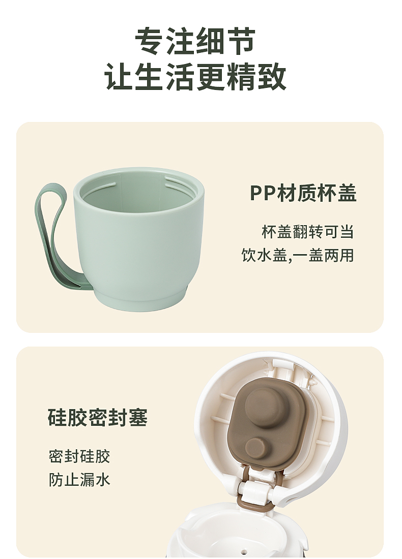 1.一杯双饮,PP材质杯盖翻转可当做饮用盖使用,是杯盖秒变小水杯,随时随地享用; 2.长效保温,实验数据在室温20℃±5摄氏度环境下,倒入95℃以上热水测试得出6小时75℃以上;12小时56℃以上,仅供参考; 3.密封防漏,按压内塞搭配PP材质杯盖,双盖紧锁出水口,360°密封防漏,出差、旅行、通勤、随身携带更安心; 4.采用304不锈钢内胆,材质安全耐腐蚀,耐氧化,给你满分安心 5.手感漆面,杯身磨砂工艺,不易留指痕,手感舒适细腻,触摸好品质,给你全新的使用体验; 6.便携提手,柔软硅胶提绳,Q弹不勒手,不变形,勾勾手指,随拎随走。 7.硅胶密封塞,密封硅胶,防止漏水 8.一键按压内塞,一键开启,顺畅出水;