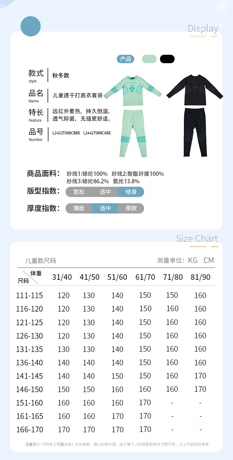 力丼田儿童户外沙漠系列 Thermolite保暖运动内衣 压缩衣套装 速干四面弹透气 L2442T088CABE