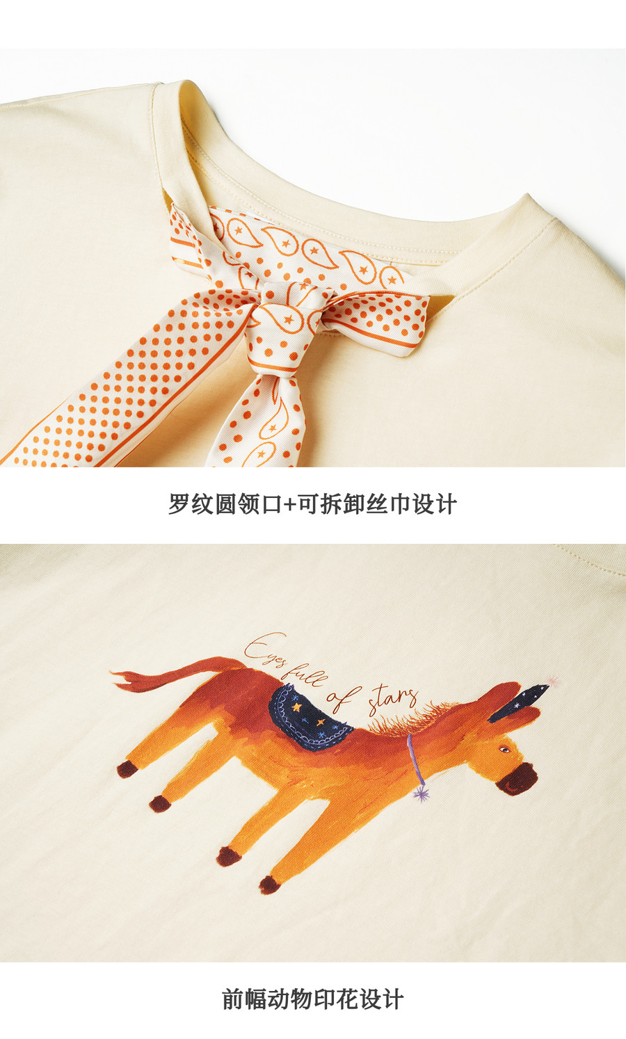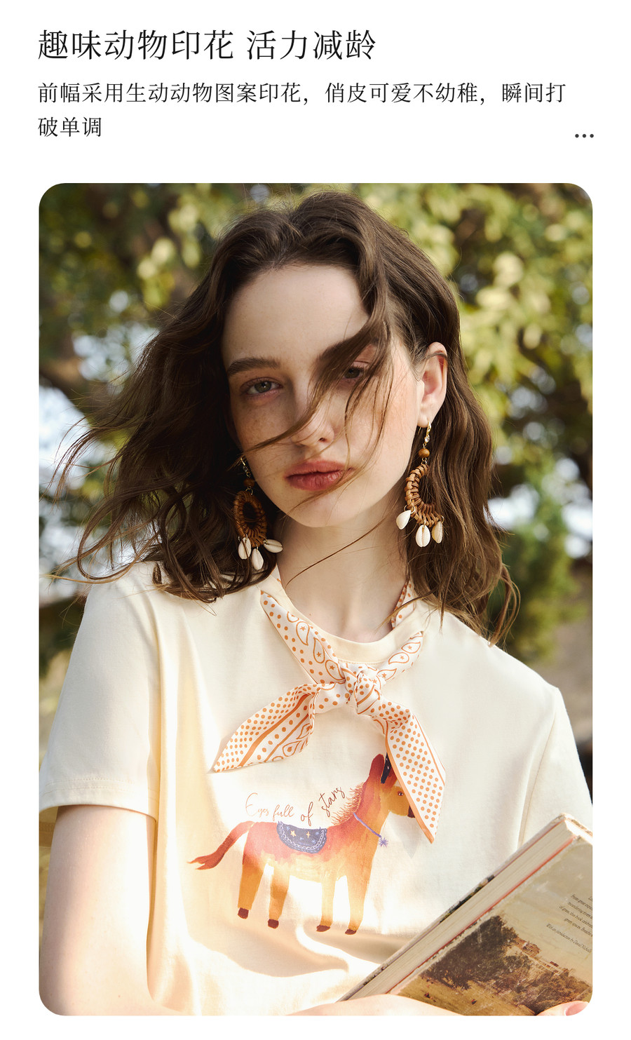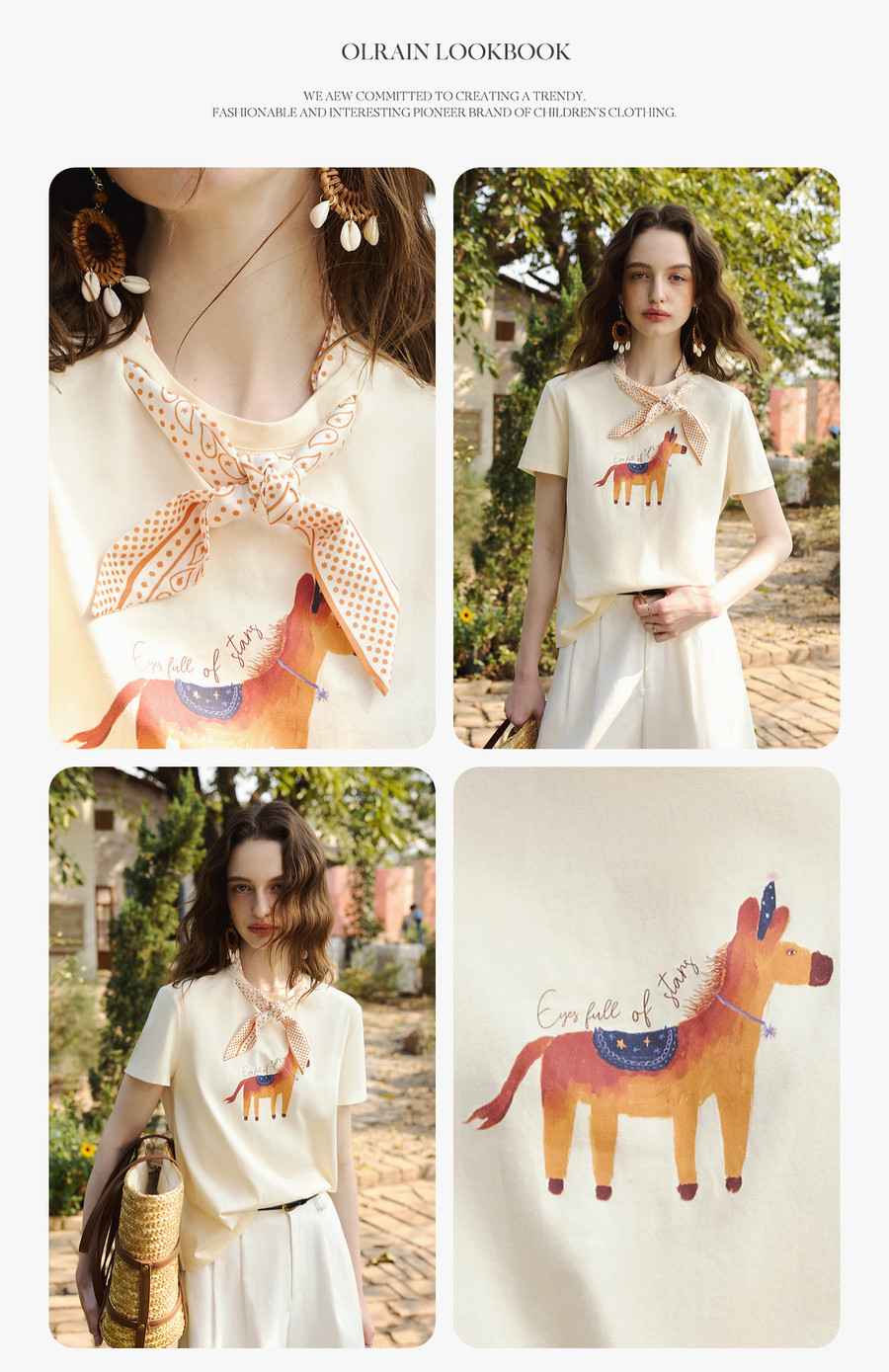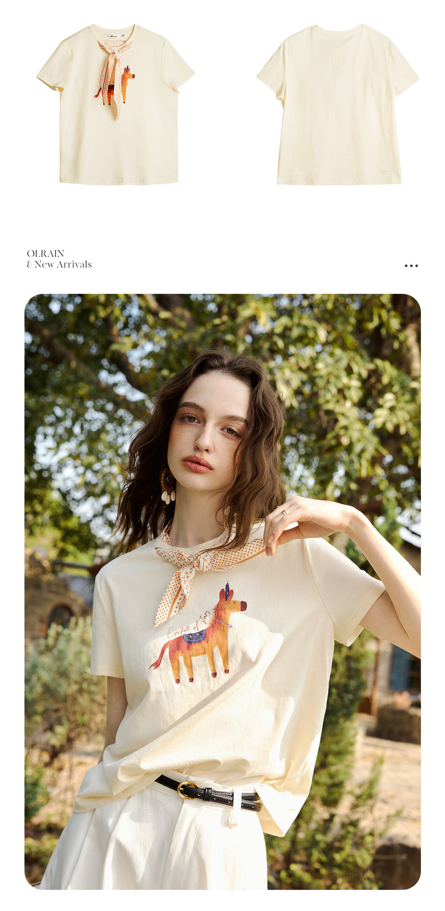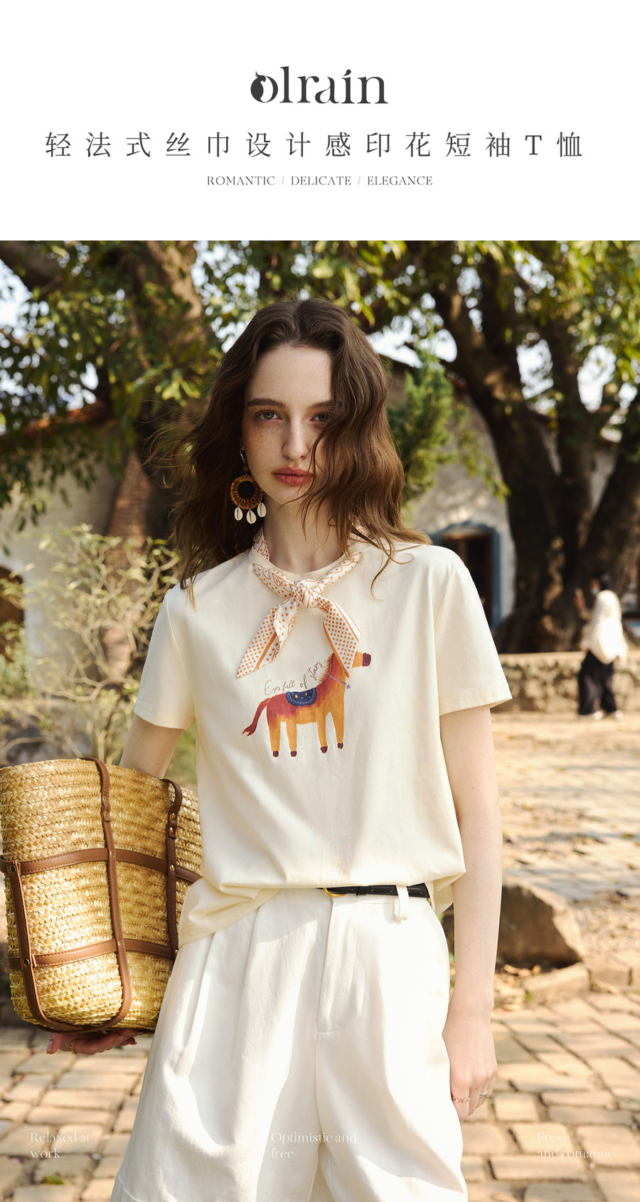 欧芮儿轻法式丝巾设计感印花圆领短袖T恤女夏季2026新款纯棉上衣