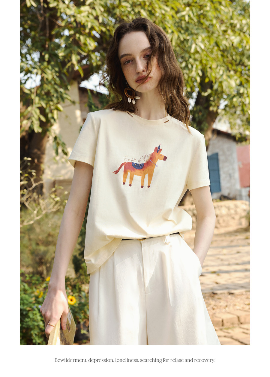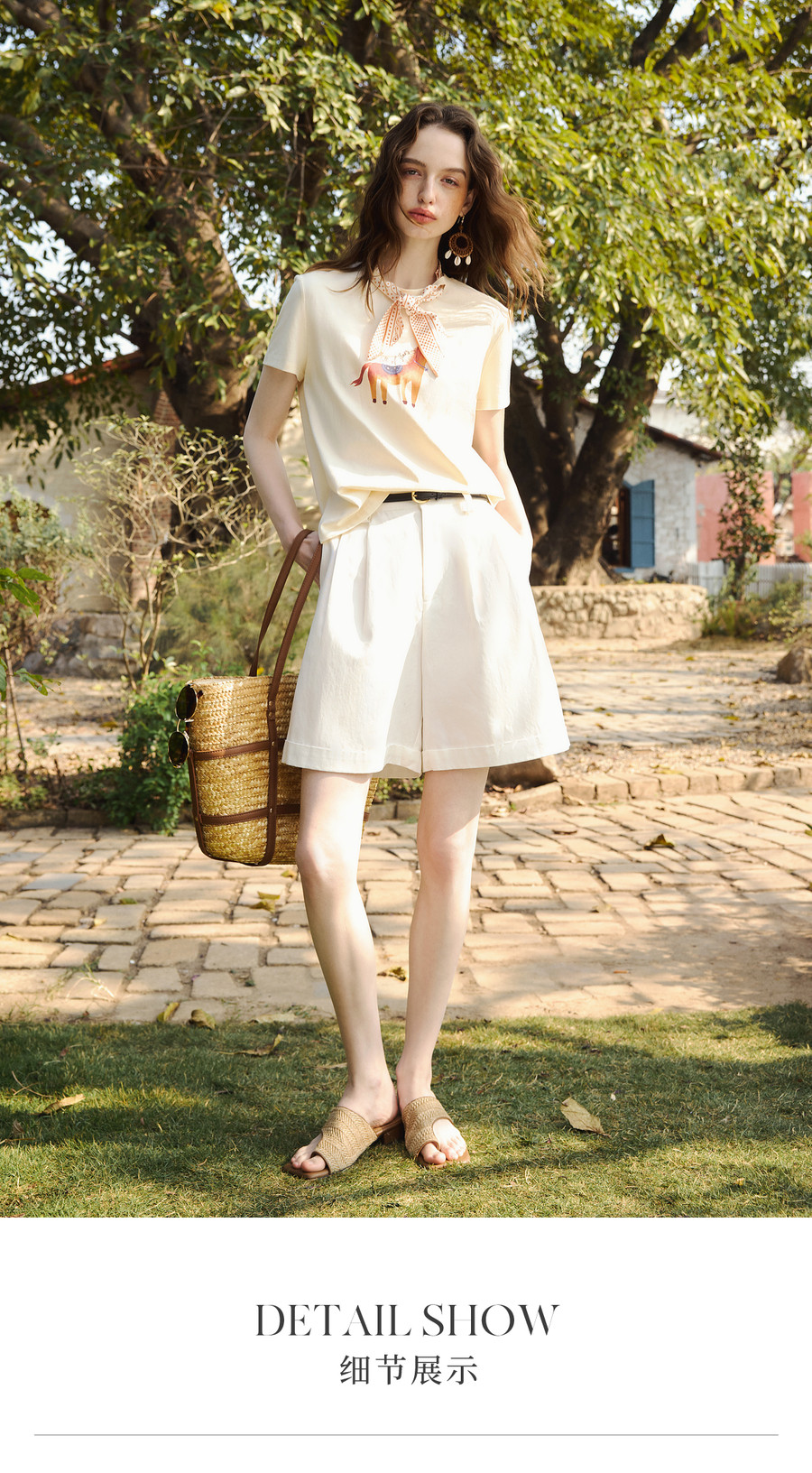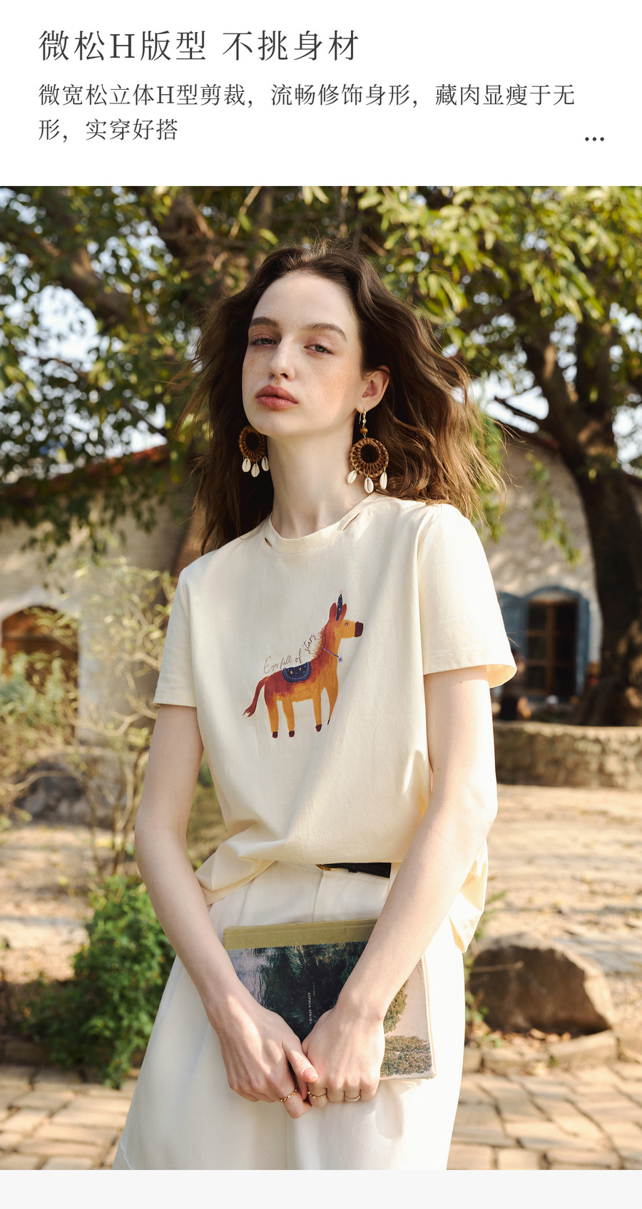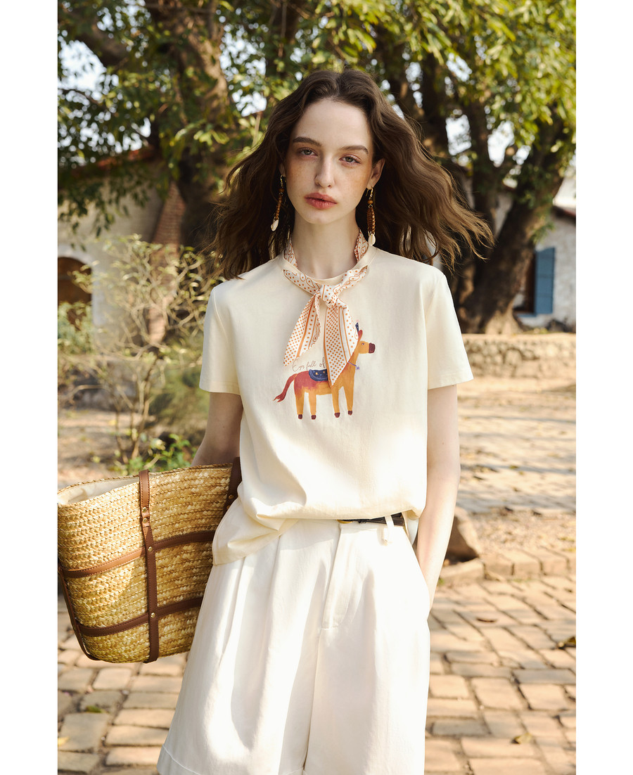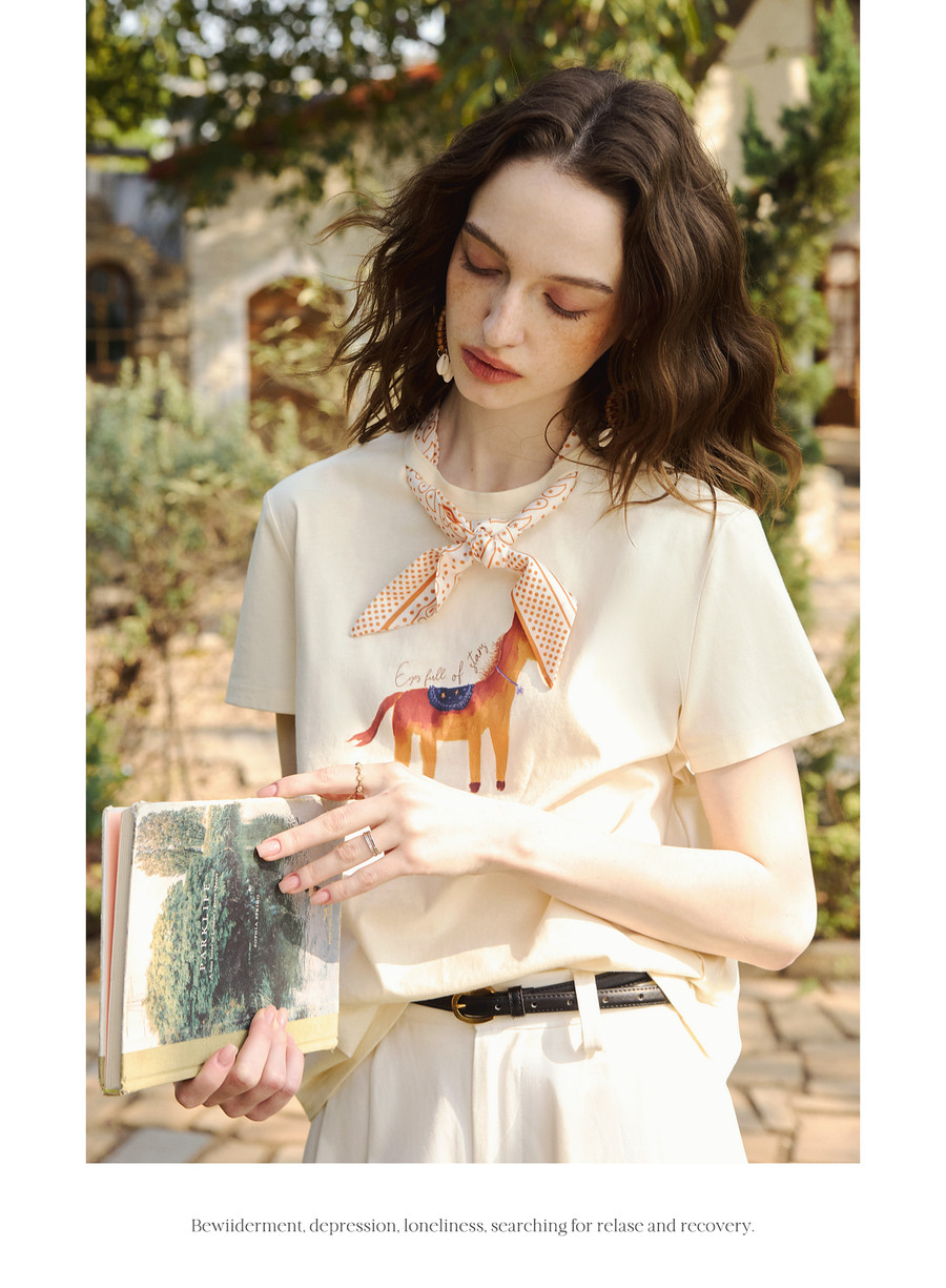 欧芮儿轻法式丝巾设计感印花圆领短袖T恤女夏季2026新款纯棉上衣