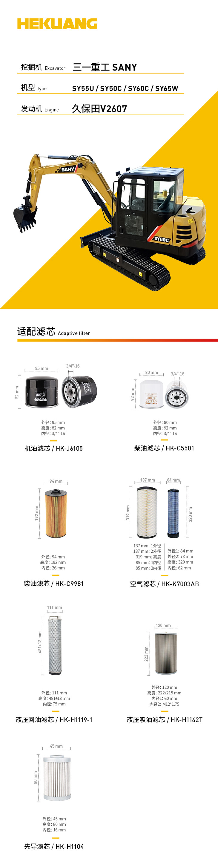 三一重工SY55U/SY50C/SY60C/SY65W(久保田V2607)挖掘机适配滤芯 机柴滤芯 液压油吸油回油滤芯 空气滤芯 先导滤芯