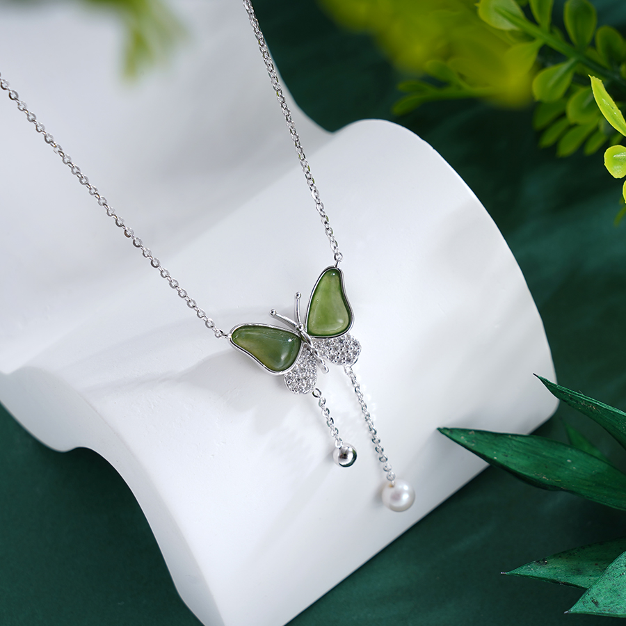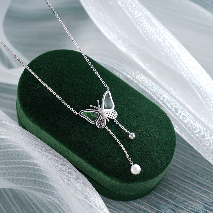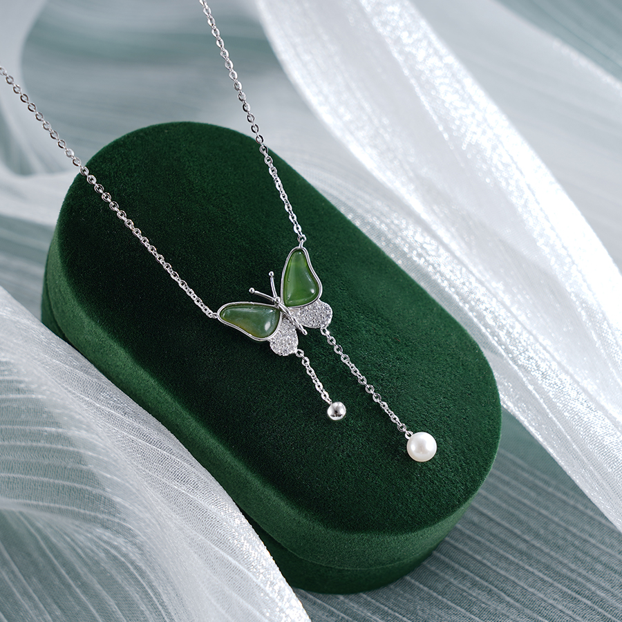 【寓意】:吊坠灵感源自蝴蝶,和田碧玉镶嵌,尽显清雅。下方点缀珍珠,飘逸灵动,如清风过境,带来无限好运。