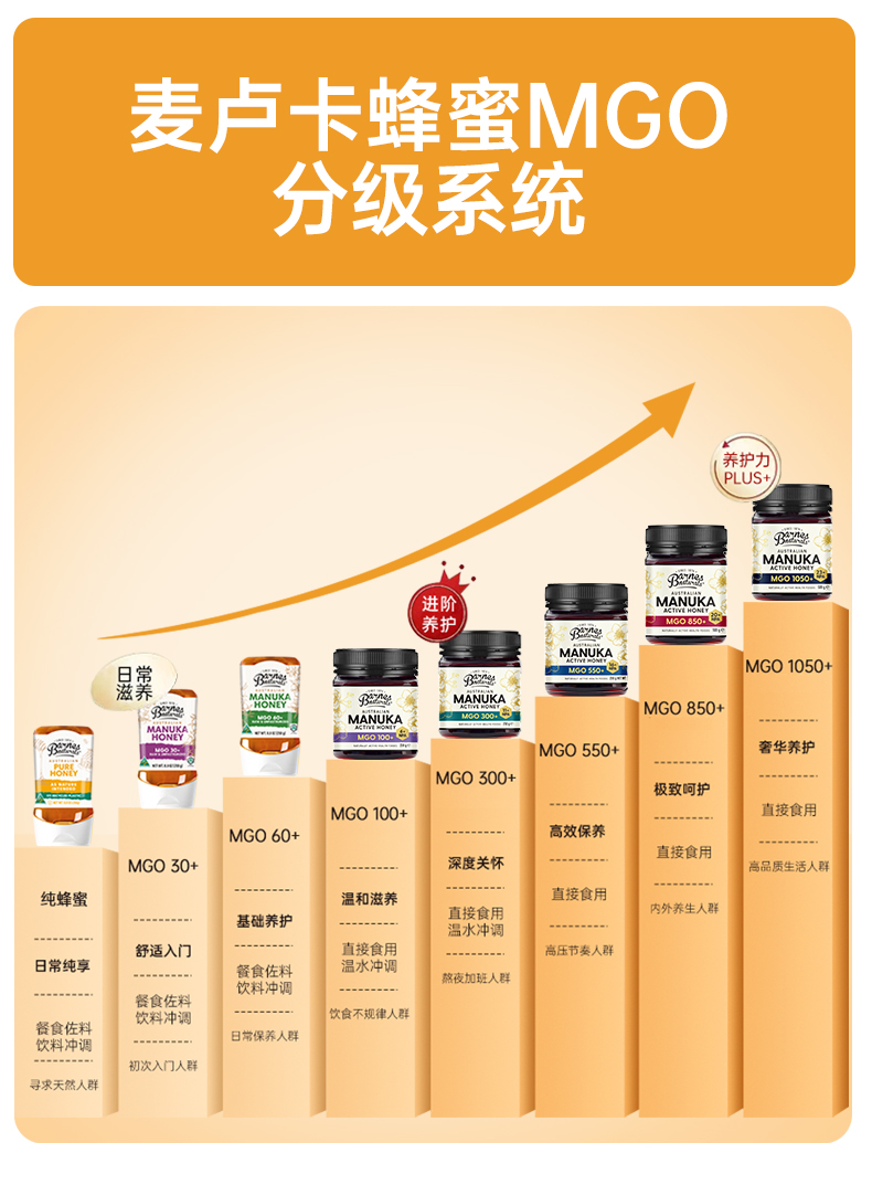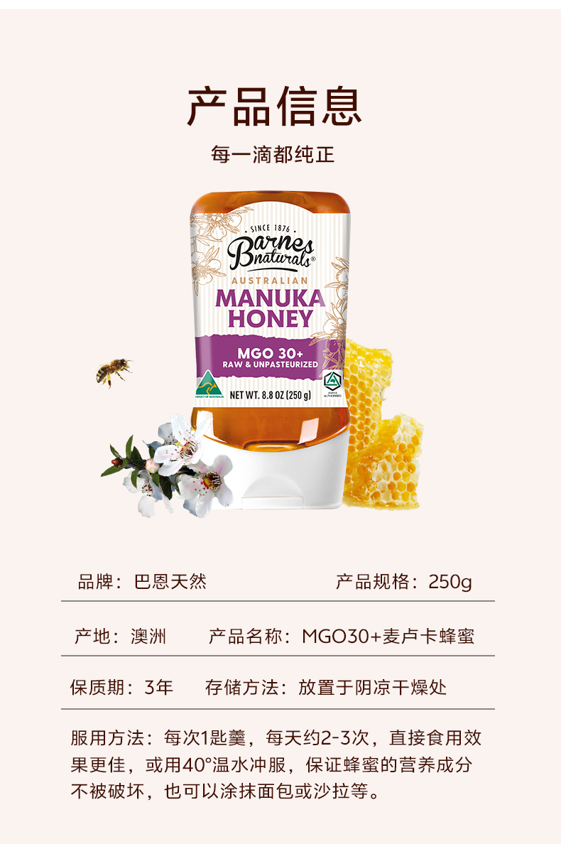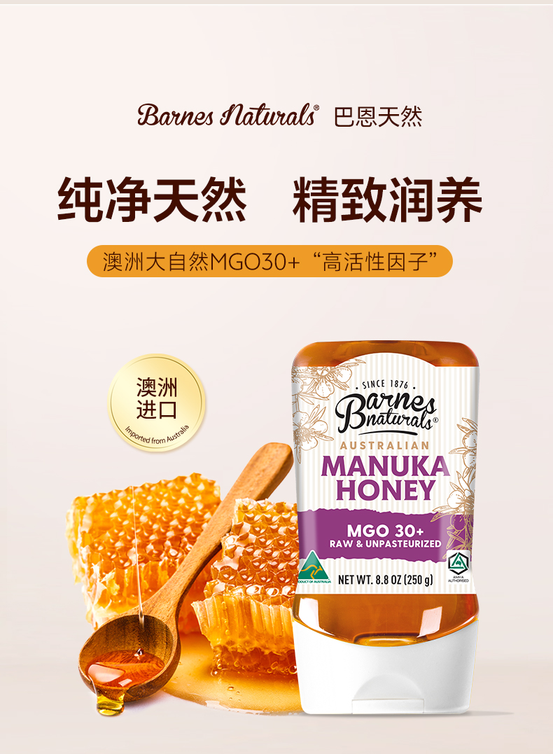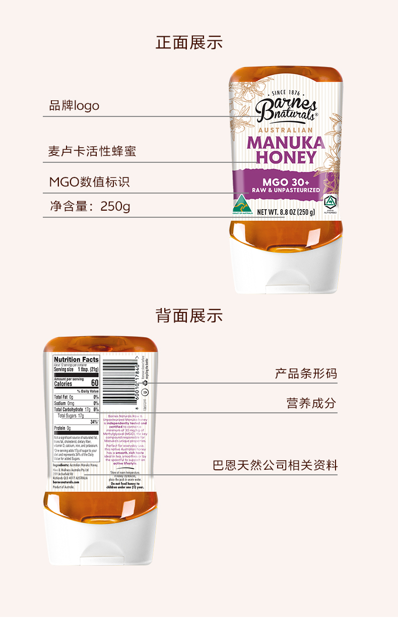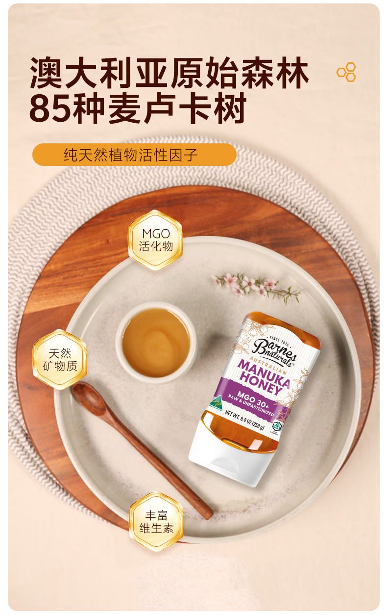 澳大利亚巴恩天然 活性麦努卡蜂蜜倒立装MGO30+ 250g