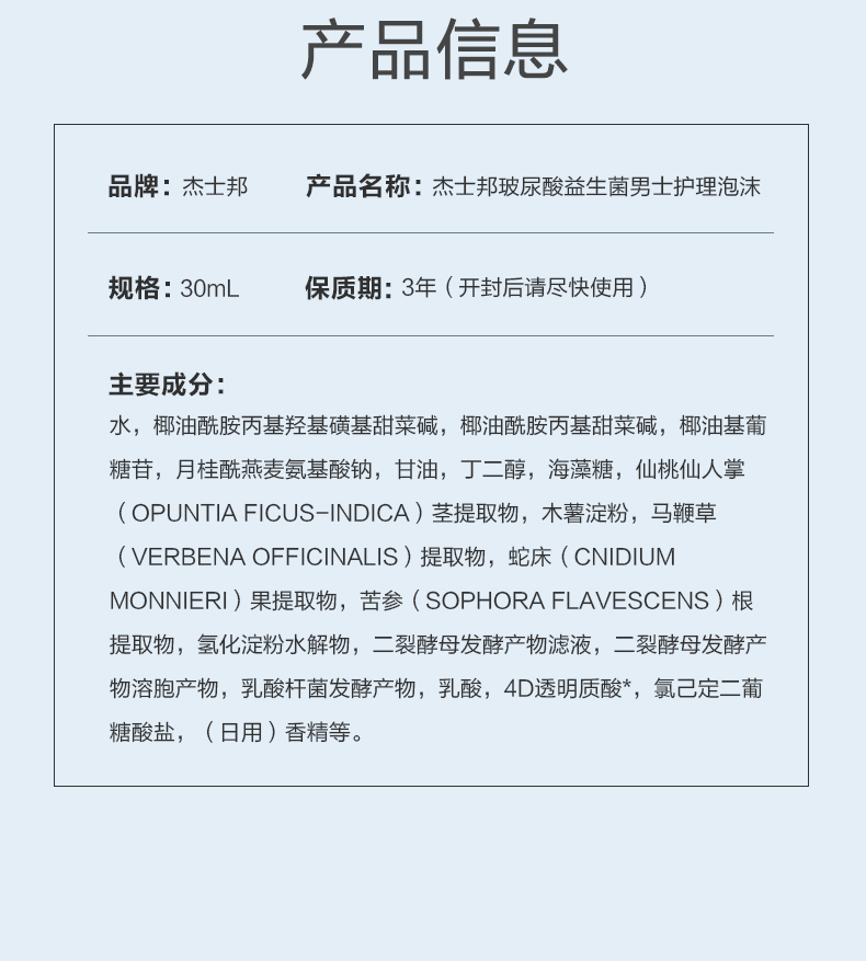 杰士邦玻尿酸益生菌男士护理泡沫30mL(JXBM30)
