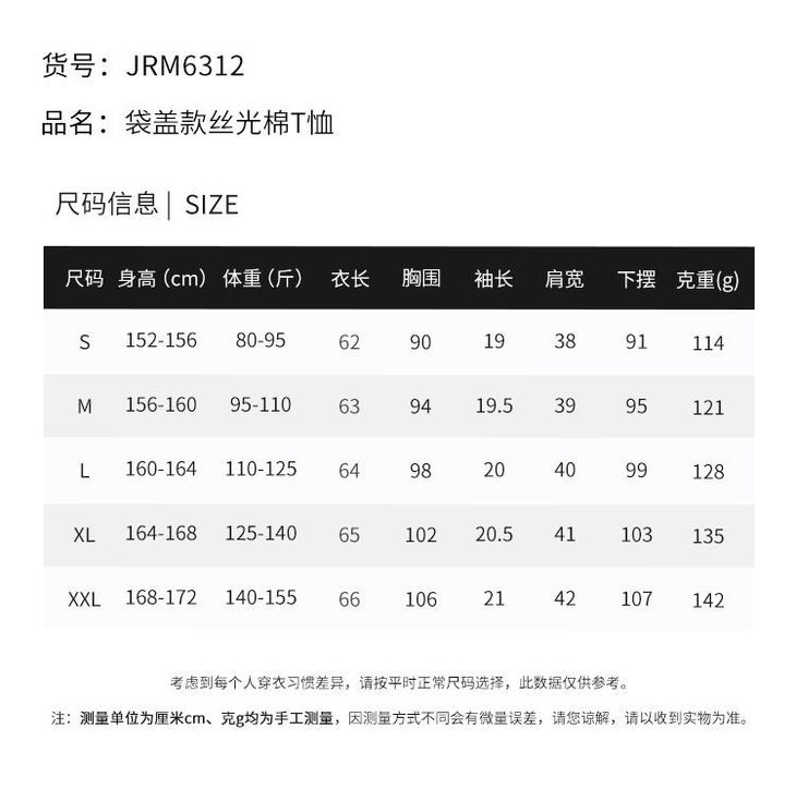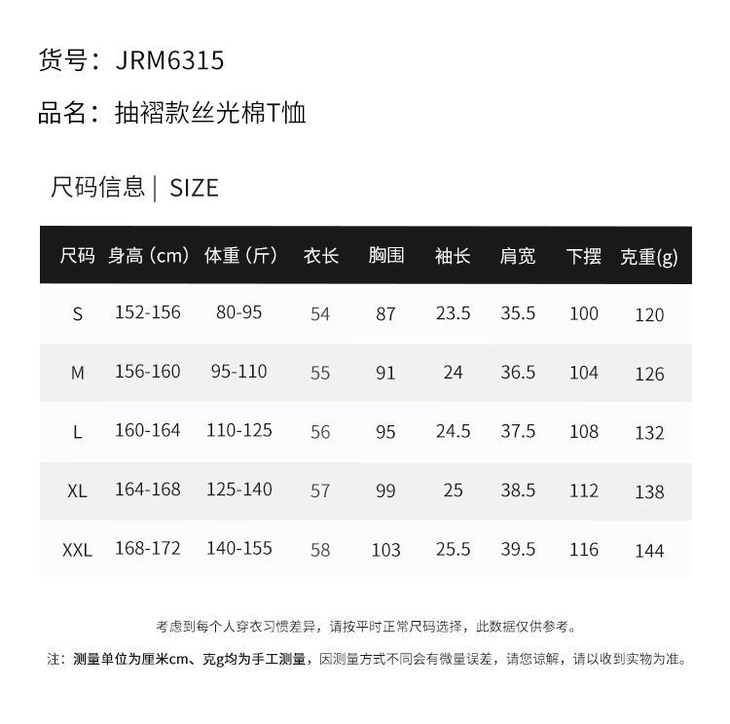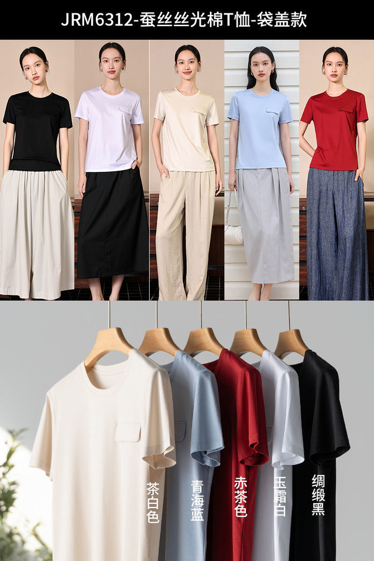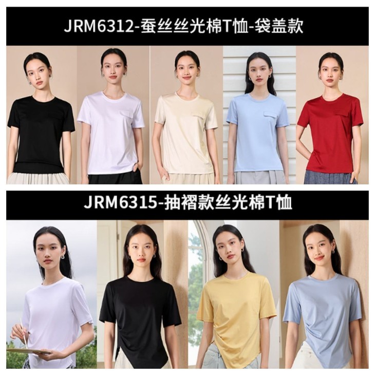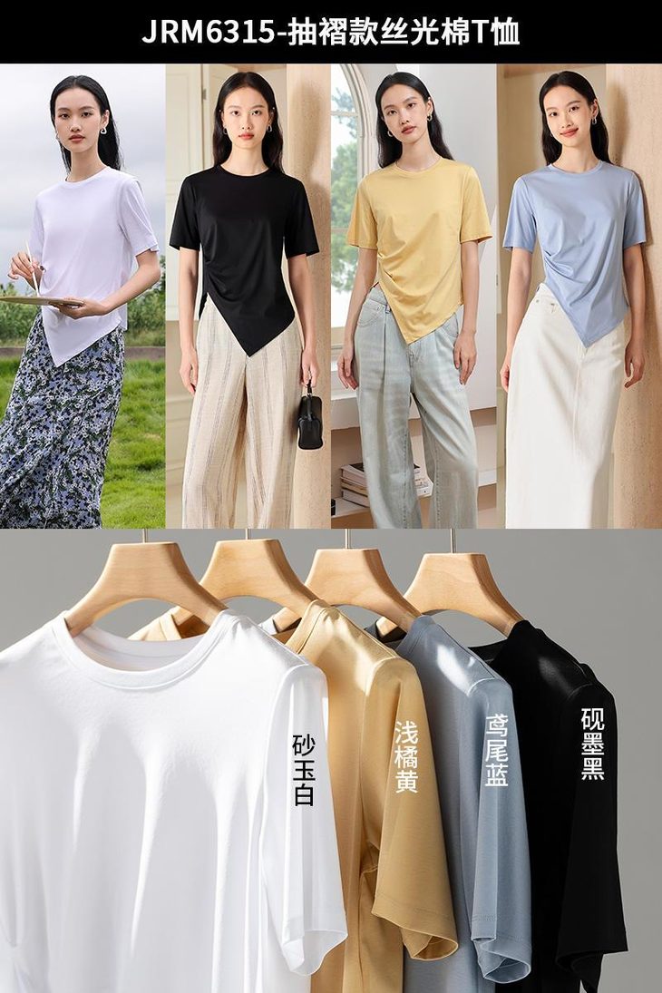 名称:抽褶款桑蚕丝丝光T恤 款号:JRM6315 尺码:S、M、L、XL、XXL 材质: 10%桑蚕丝、58%棉、32%再生纤维素纤维 颜色信息:砚墨黑、砂玉白、浅橘黄、鸢尾蓝 (清仓商品,售完无补!请各渠道上架销售前务必务必要先核实库存!) 【卖点提炼】: 1、添加奢品级桑蚕丝,温润舒适,细腻亲肤。 2、吸湿性、透气性能优于纯棉织物,是理想的贴身成衣。 3、高倍防晒UPF50+,有效阻挡紫外线。 4、舒适感微合身版型,上身效果挺阔又有型。 5、经典小圆领,升级包边工艺,不易变形。 6、腰间不规则抽褶,提高身材比例。 7、4种颜色选择,实穿率爆棚。