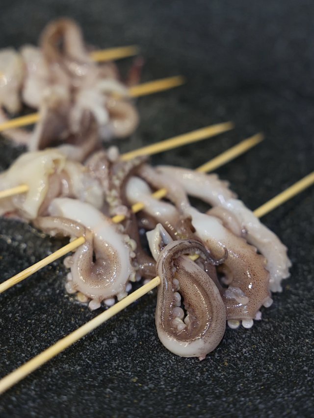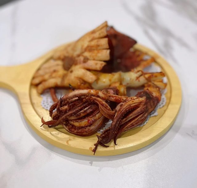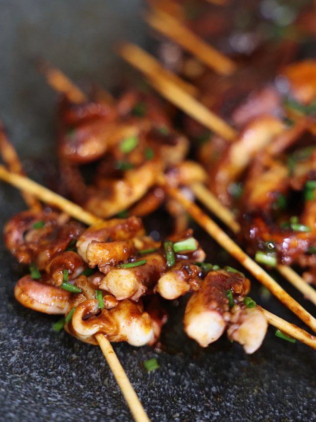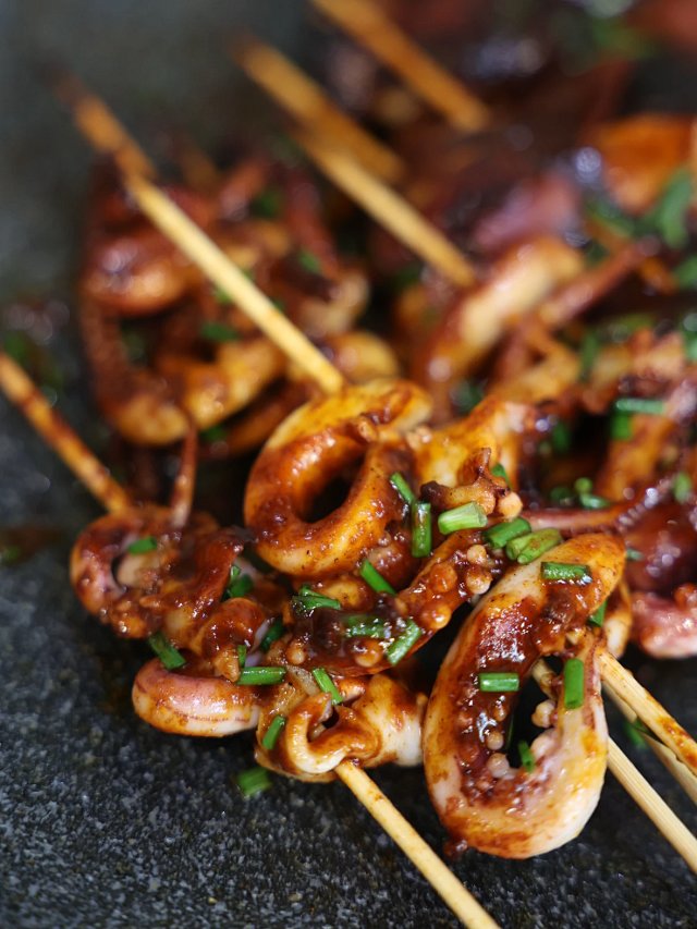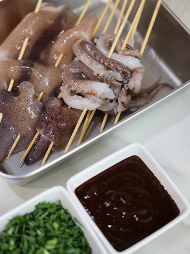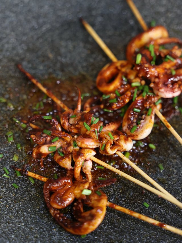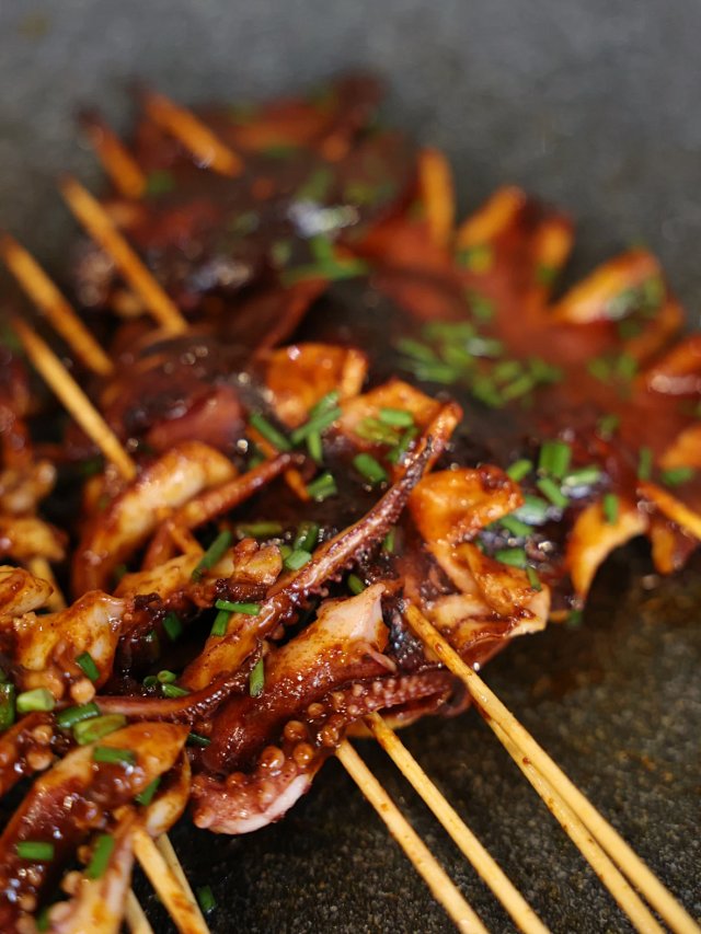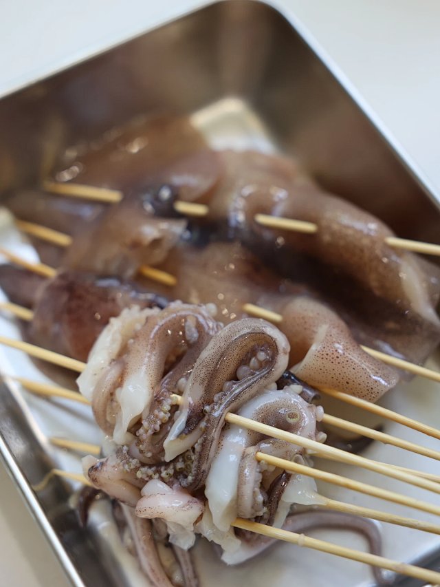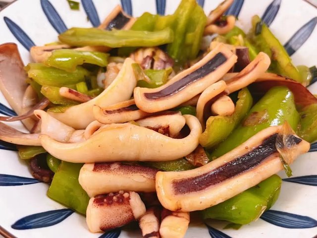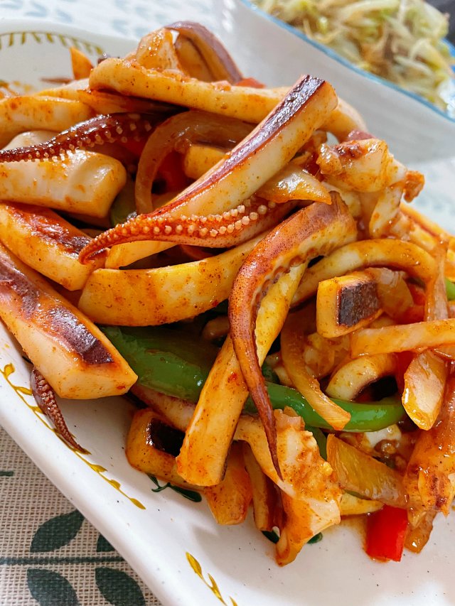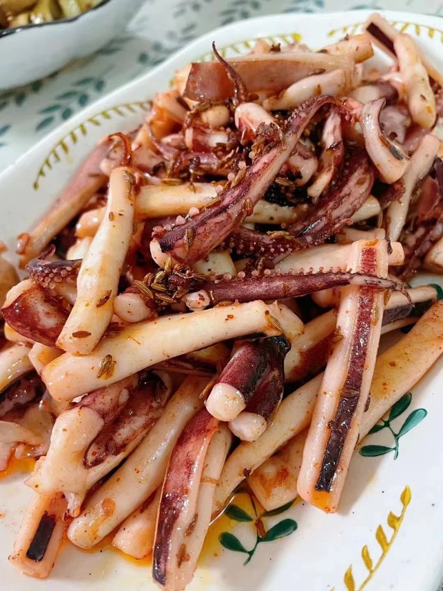 鱿鱼洗干净,横着切条,开水焯一下变色就行,捞出来控干水分,锅里放油,加入鱿鱼煸炒,炒干了,加一点盐,一点点糖也可以,孜然粒多放一点,爱吃辣加一点辣椒粉,炒香出锅完成