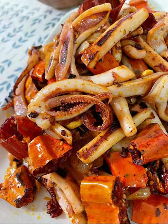 干煸鱿鱼: 鱿鱼洗干净,横着切条,(鱿鱼一定要横着切,不然热了会卷起来,不影响口感,就是不太好看)用开水焯一下,控干水分,锅里放油,加点蒜片洋葱炒炒,加入鱿鱼煸炒,炒干水份再加入黄飞红辣椒脆继续炒一会,根据自己口味加一点盐,也可以加一点孜然调味,炒得看着干了就好了,淋一点香油出货锅完成。