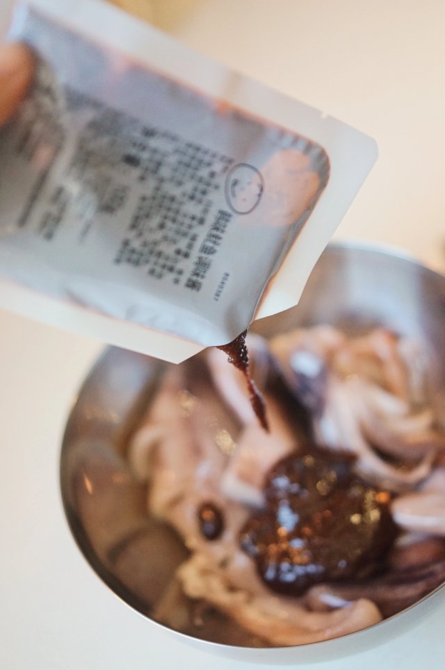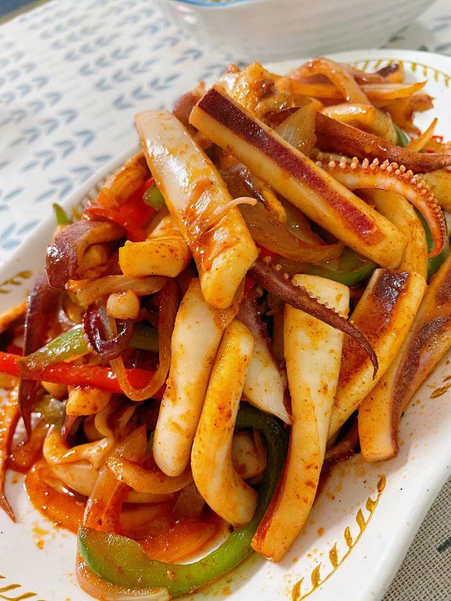 鱿鱼送的韩式辣酱,鱿鱼洗干净横着切条,开水焯一下,变色就行,时间别长了,捞出来控干水分,锅里放油,放洋葱丝炒一下,加入鱿鱼条,再加入韩式辣酱炒香出锅完成。