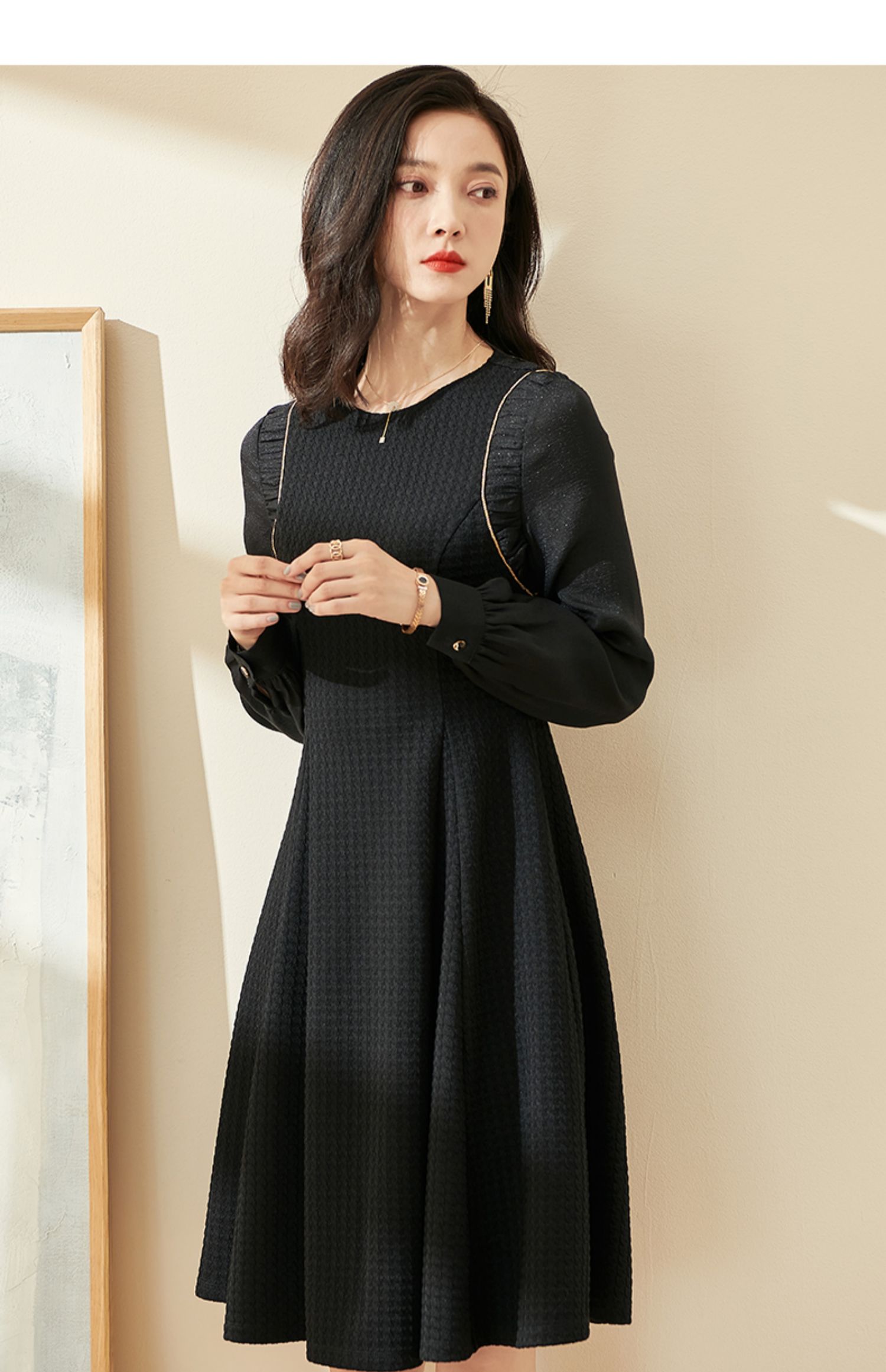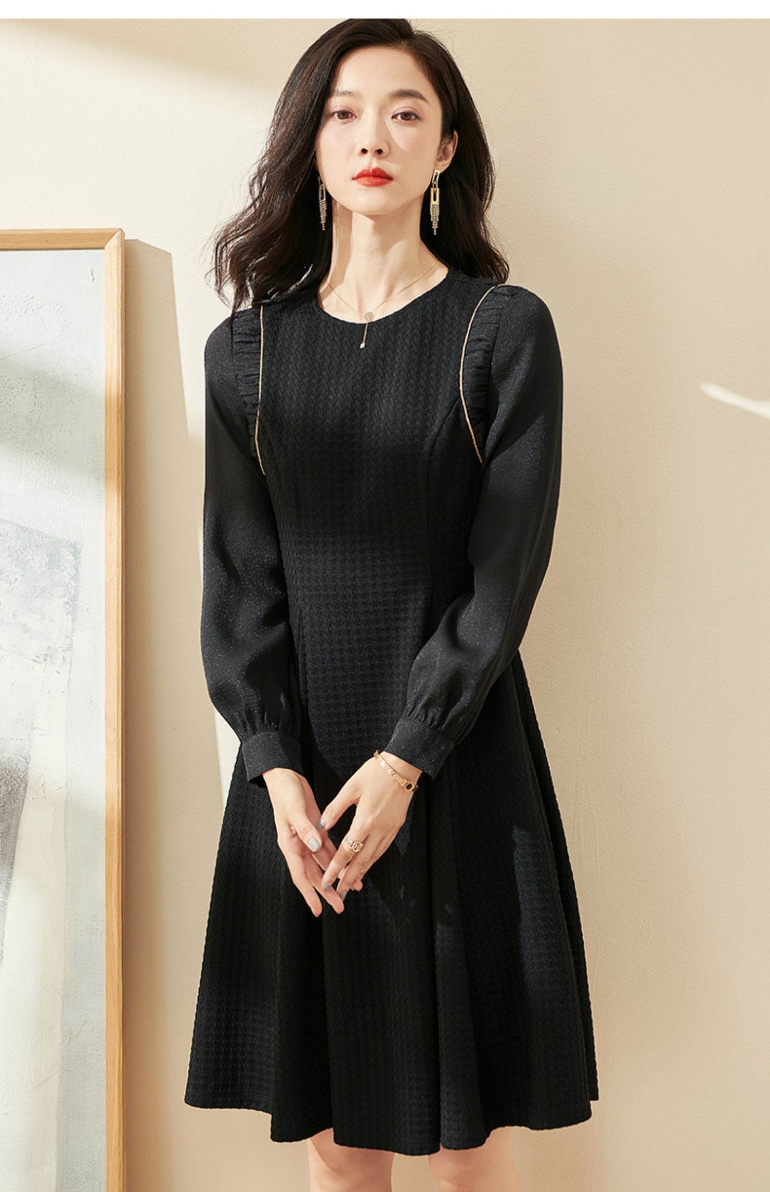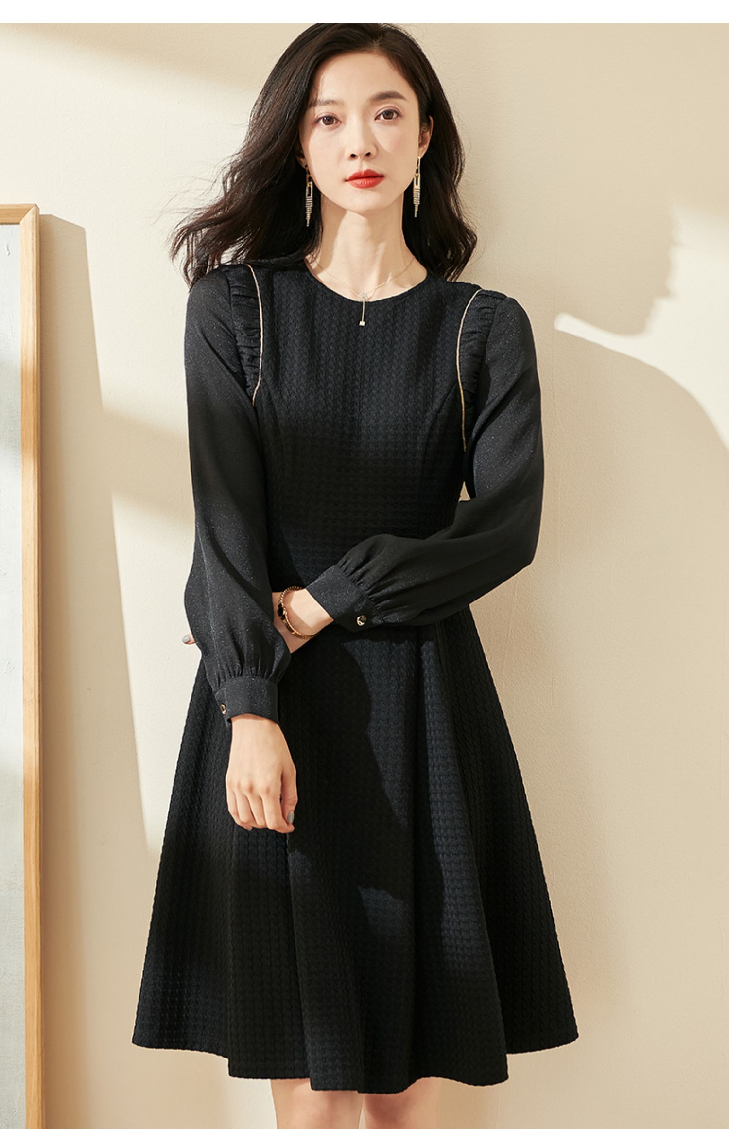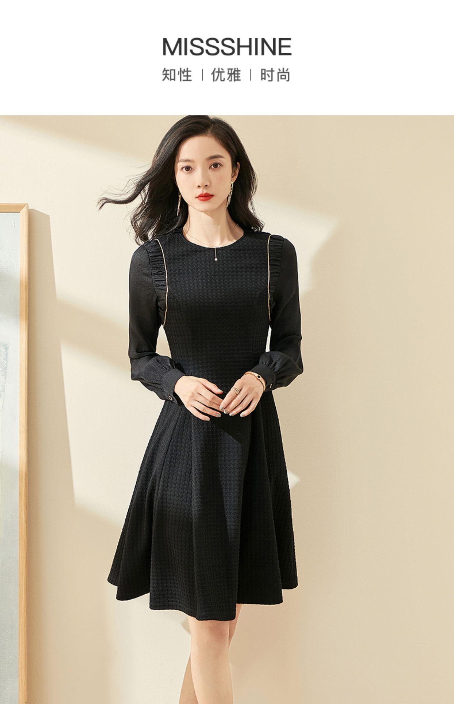 剩S/M/XL 米思阳2024秋季新款气质简约百搭黑色连衣裙高腰显瘦A字裙0037