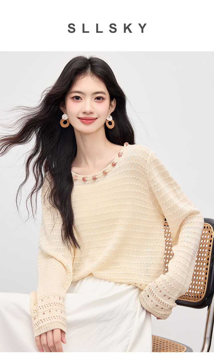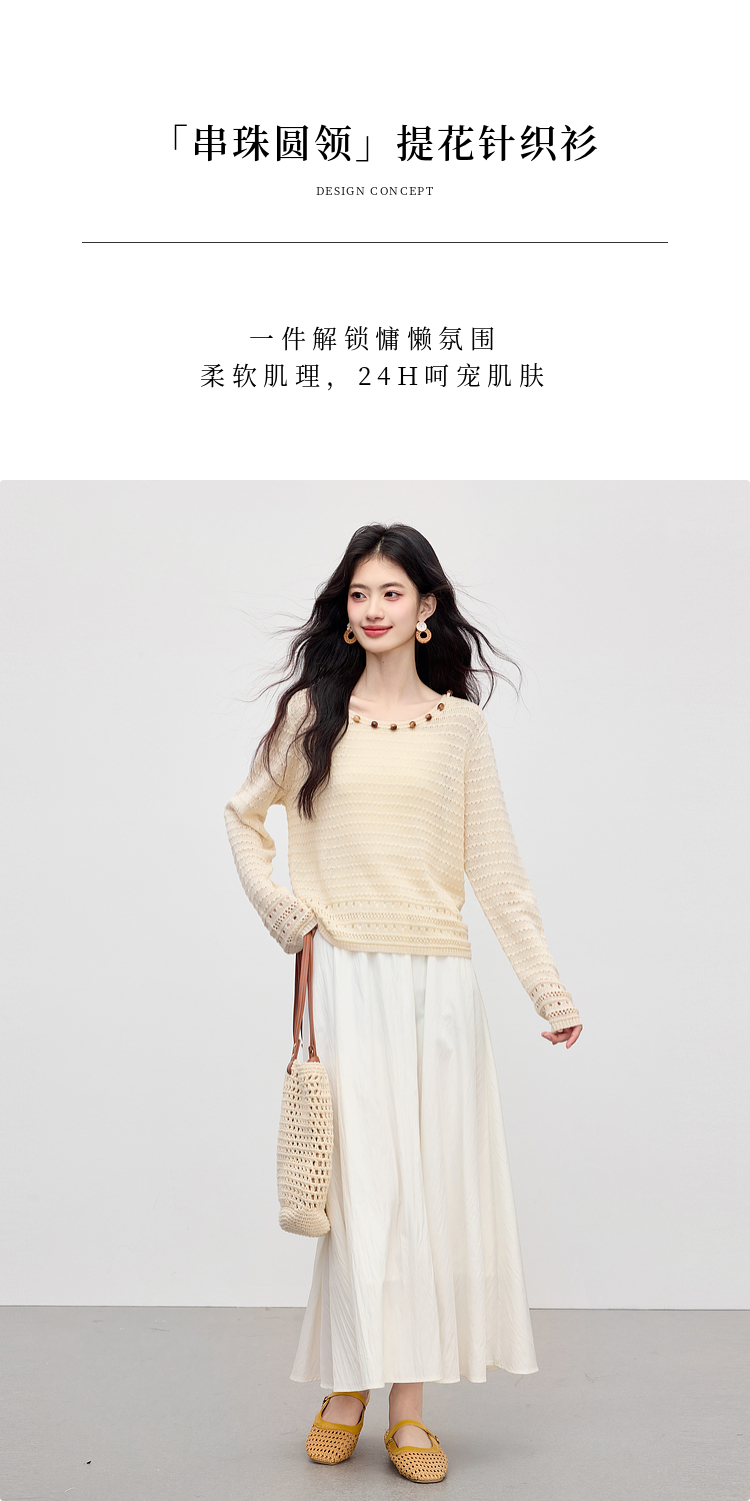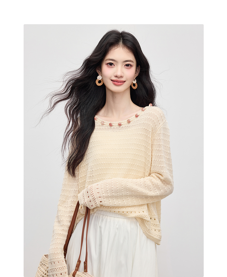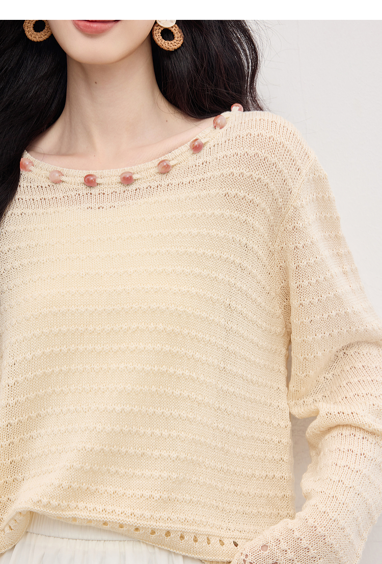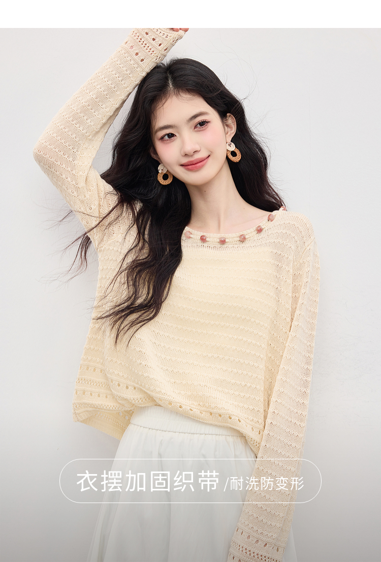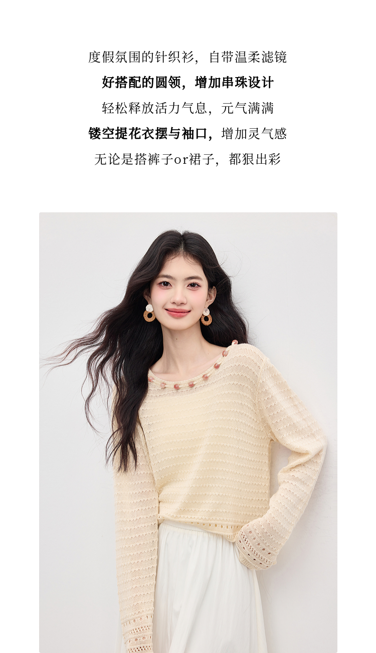 【08/12新品】熙世界法式提花镂空针织衫女2025年早秋新款气质串珠圆领罩衫上衣