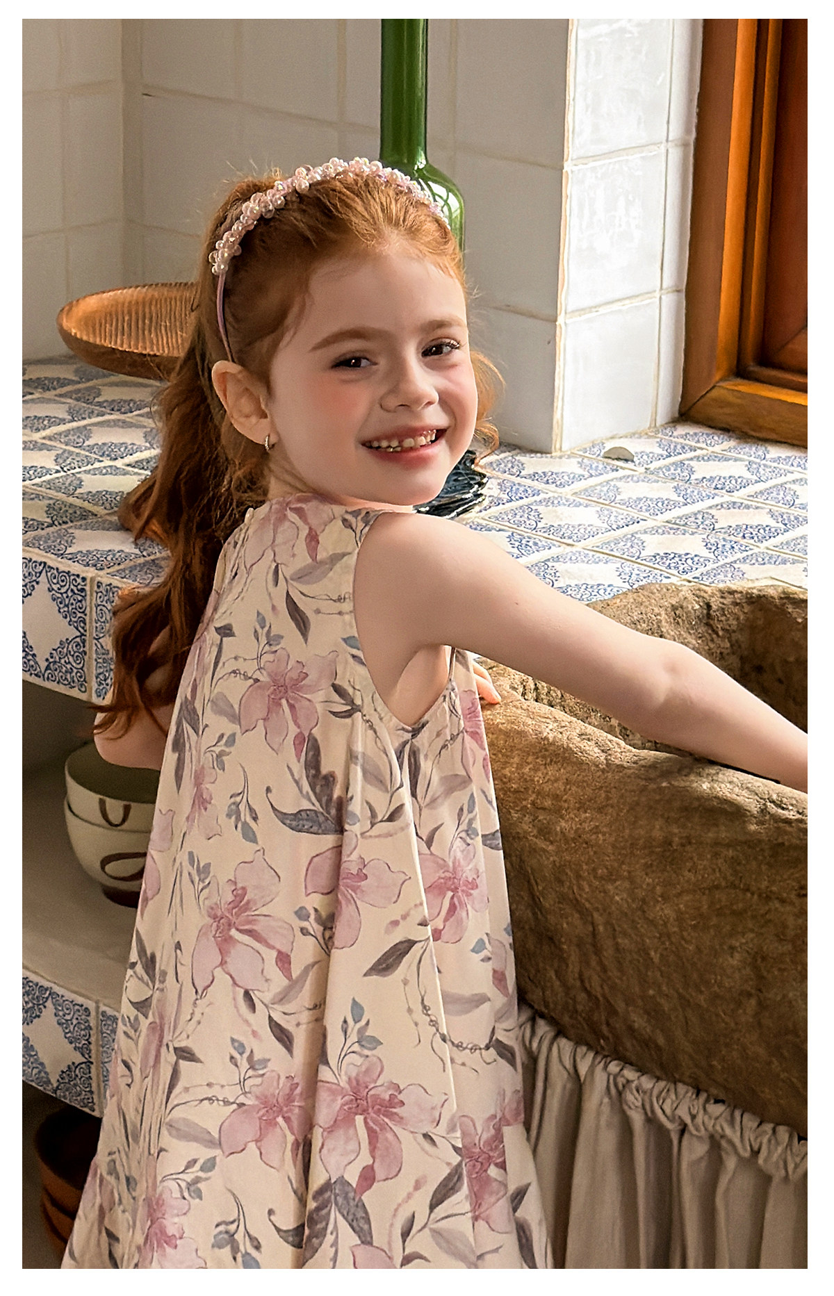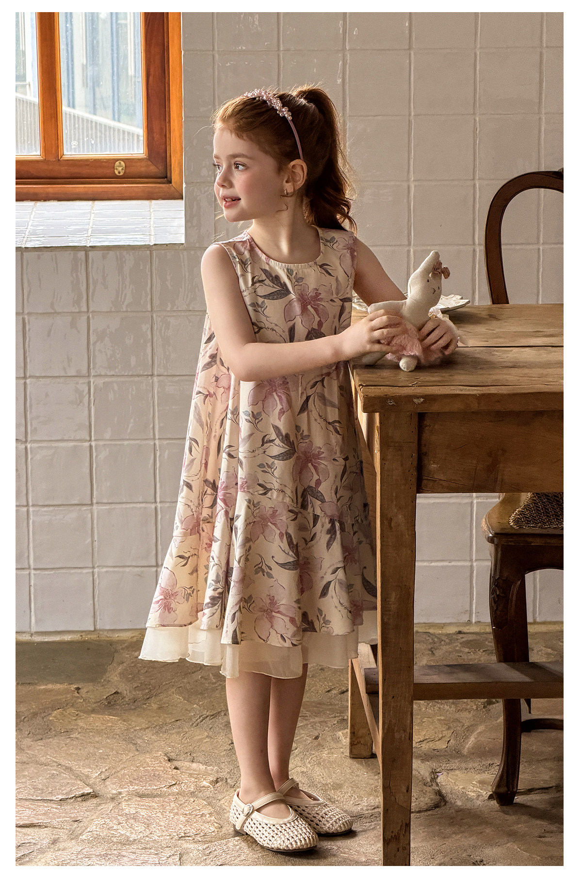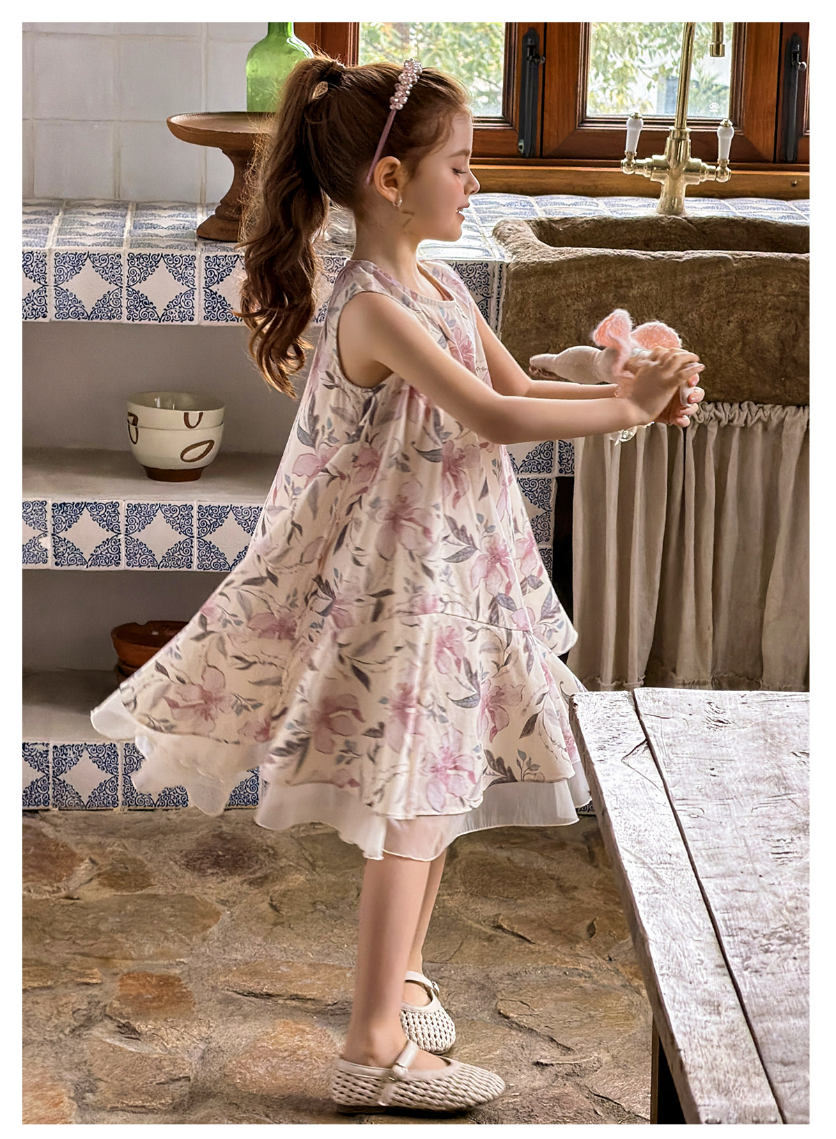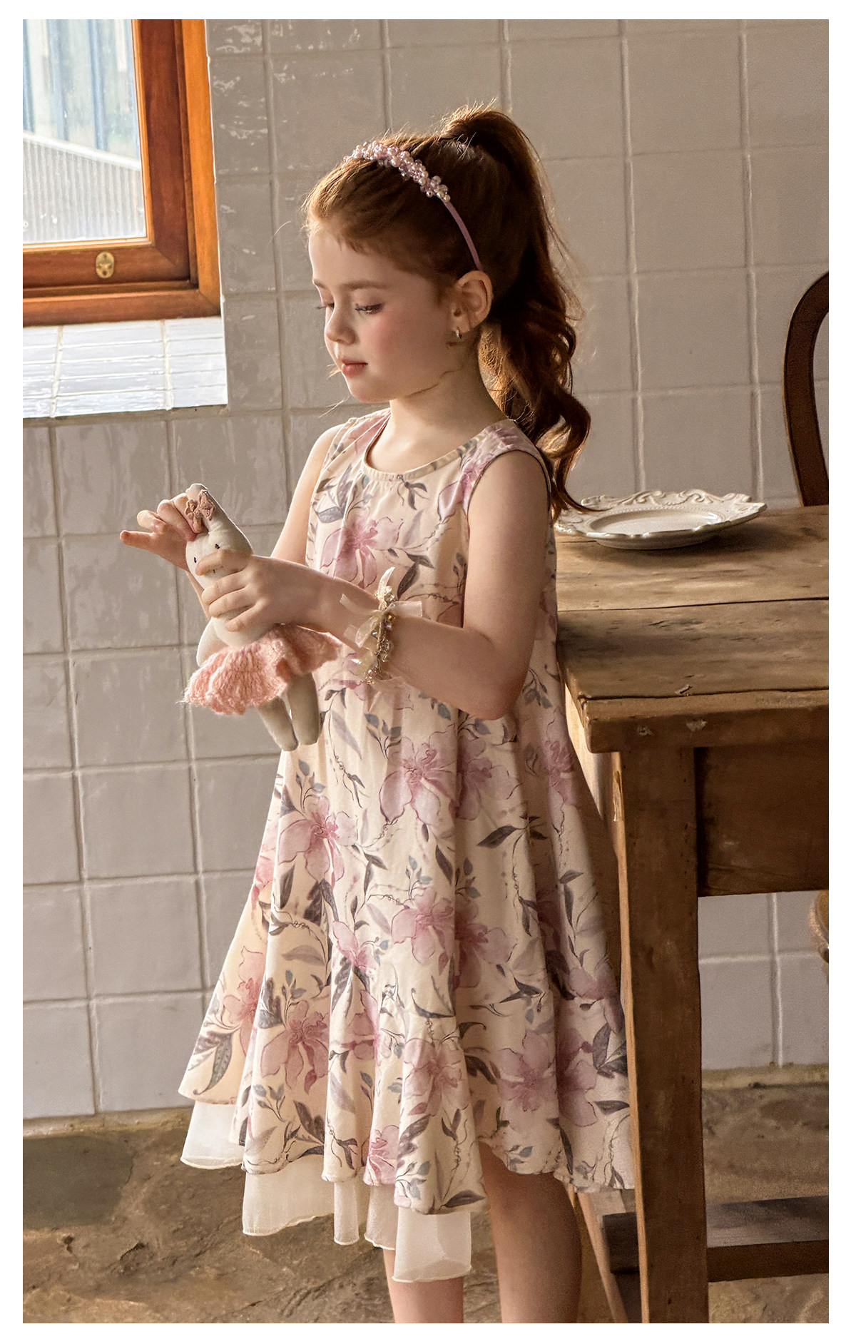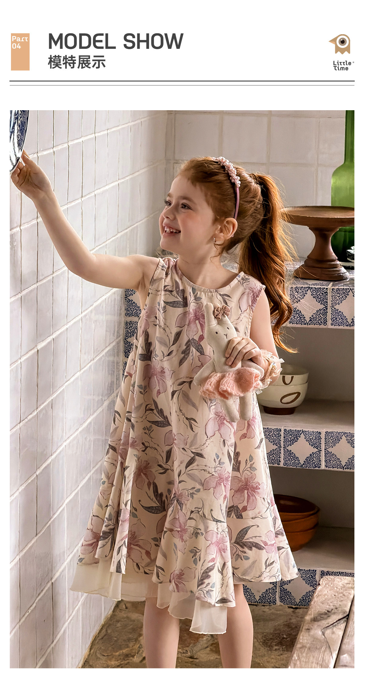 littletime26春夏女童韩国波西米亚风碎花连衣裙粉色复古田园长裙