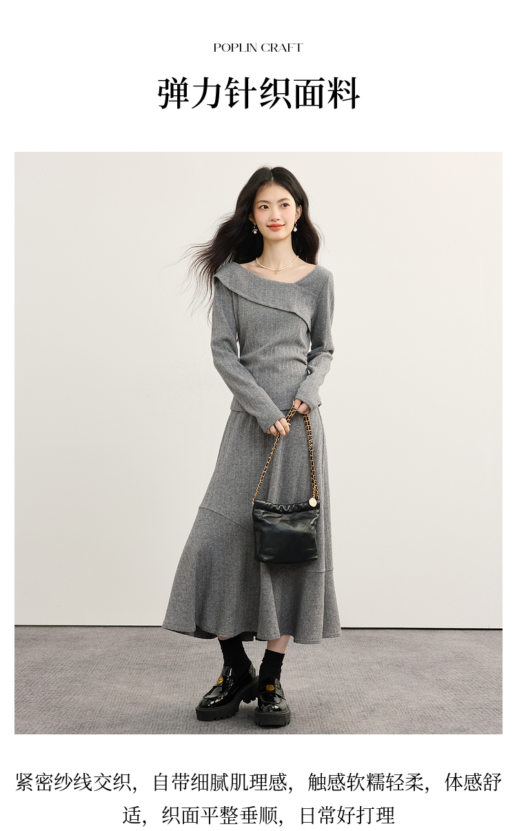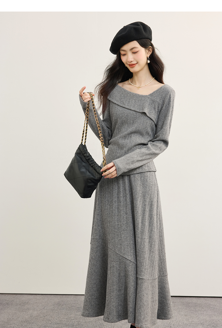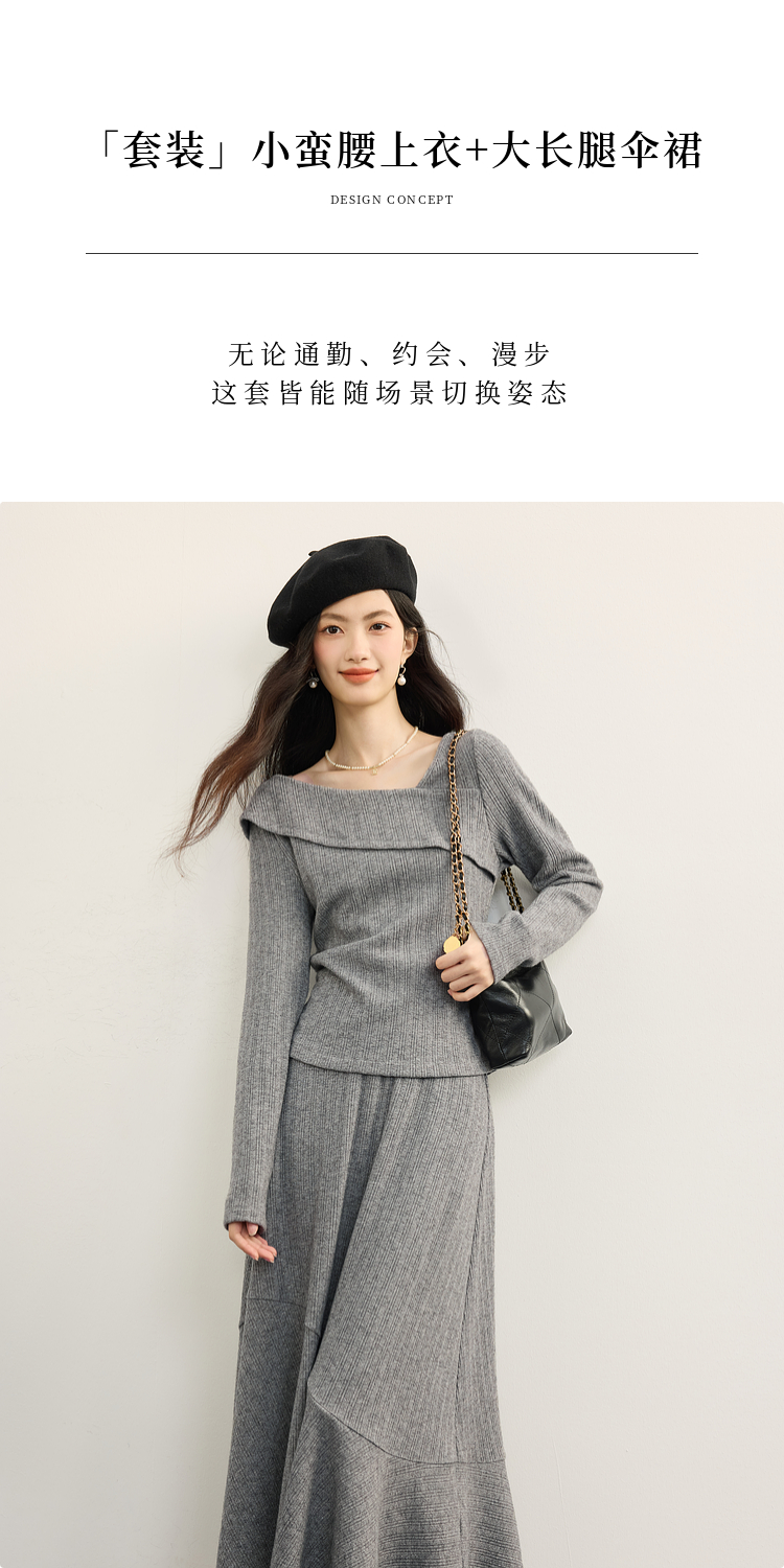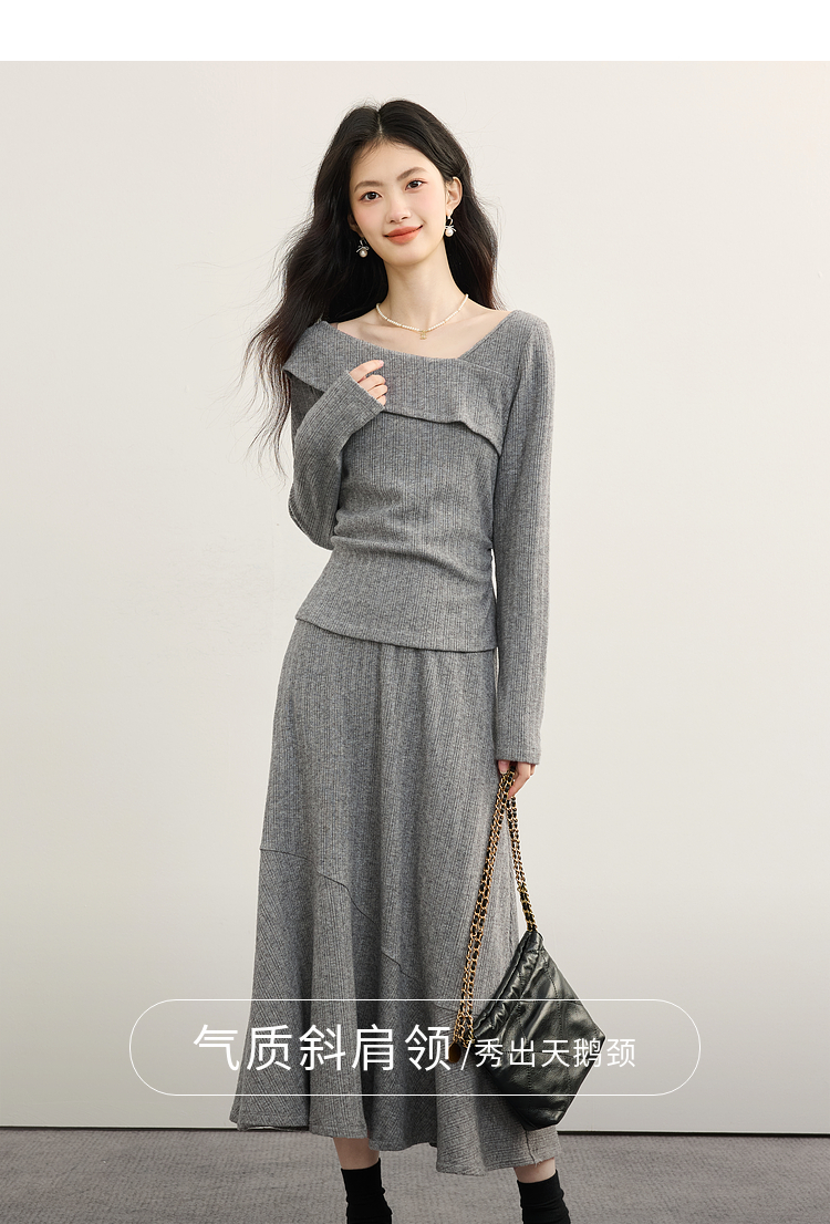 【09/03新品】熙世界格雷系灰色针织套装裙两件套女秋新款斜肩领上衣半身裙套装