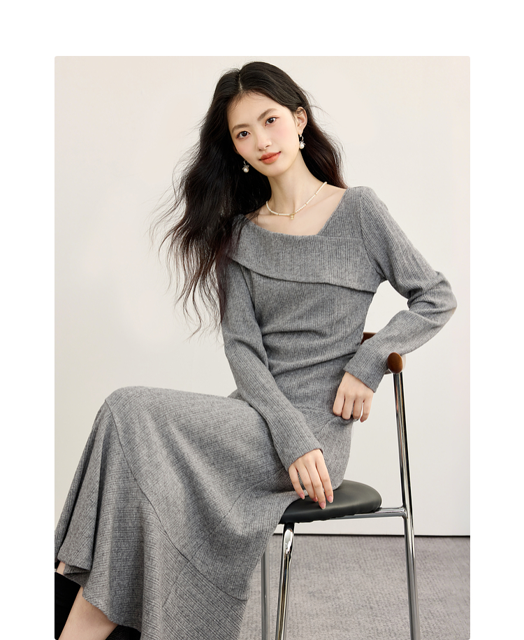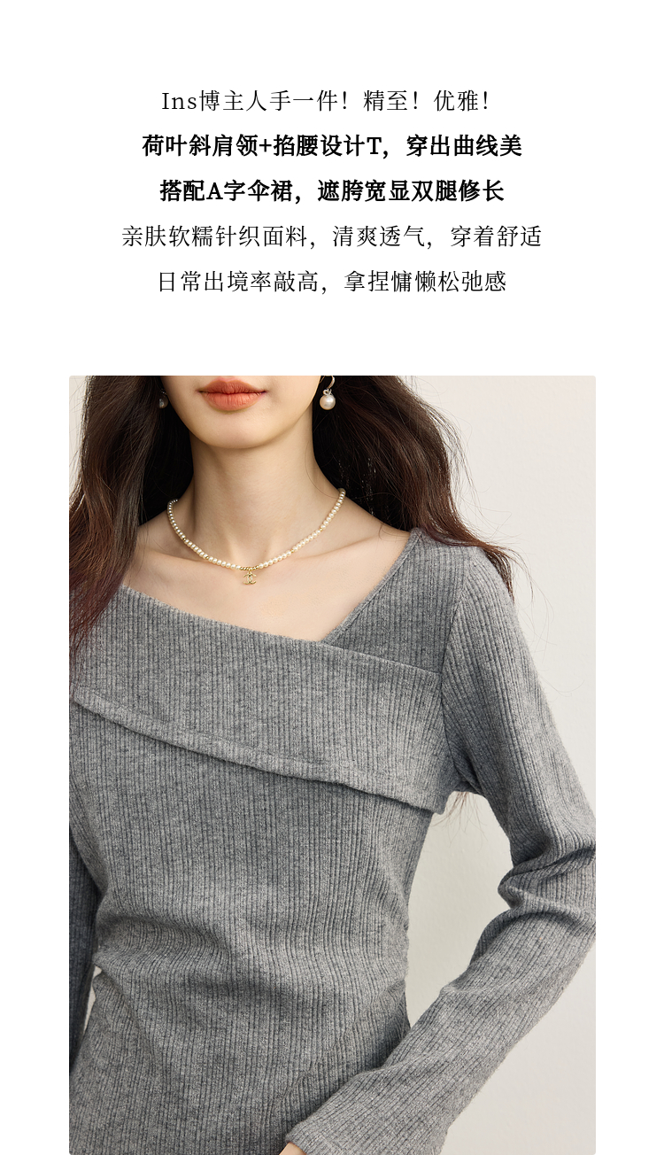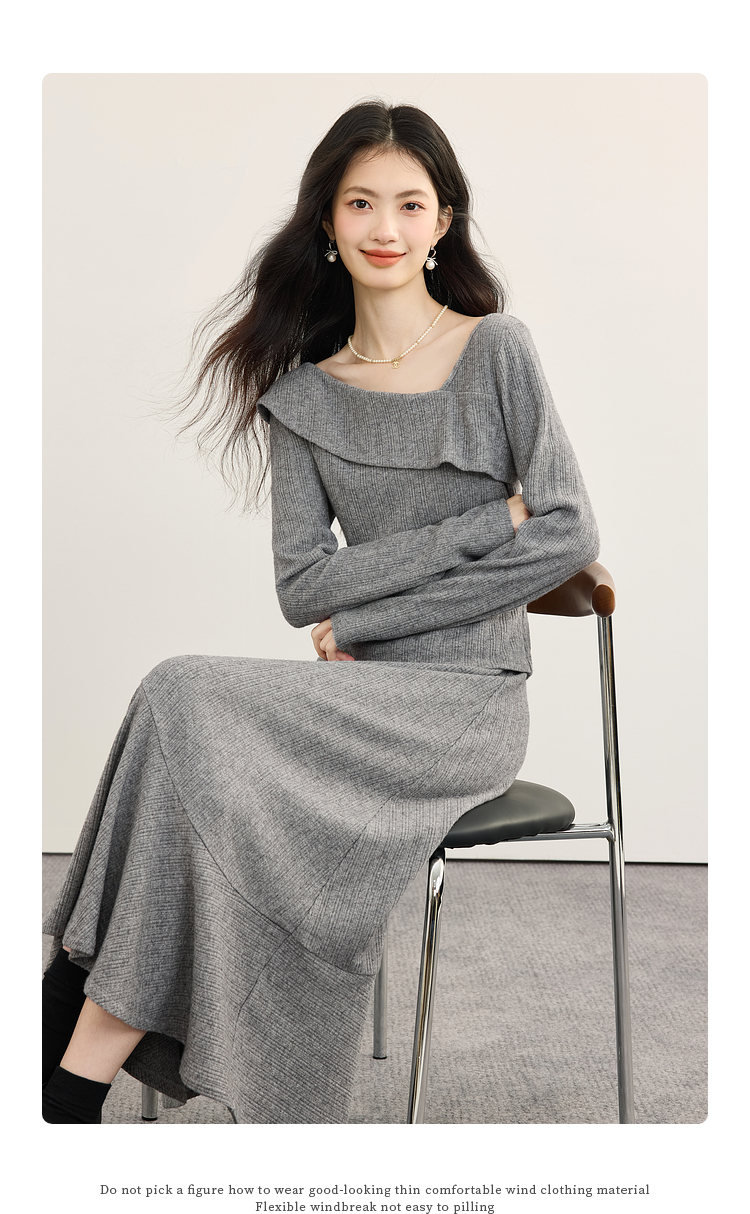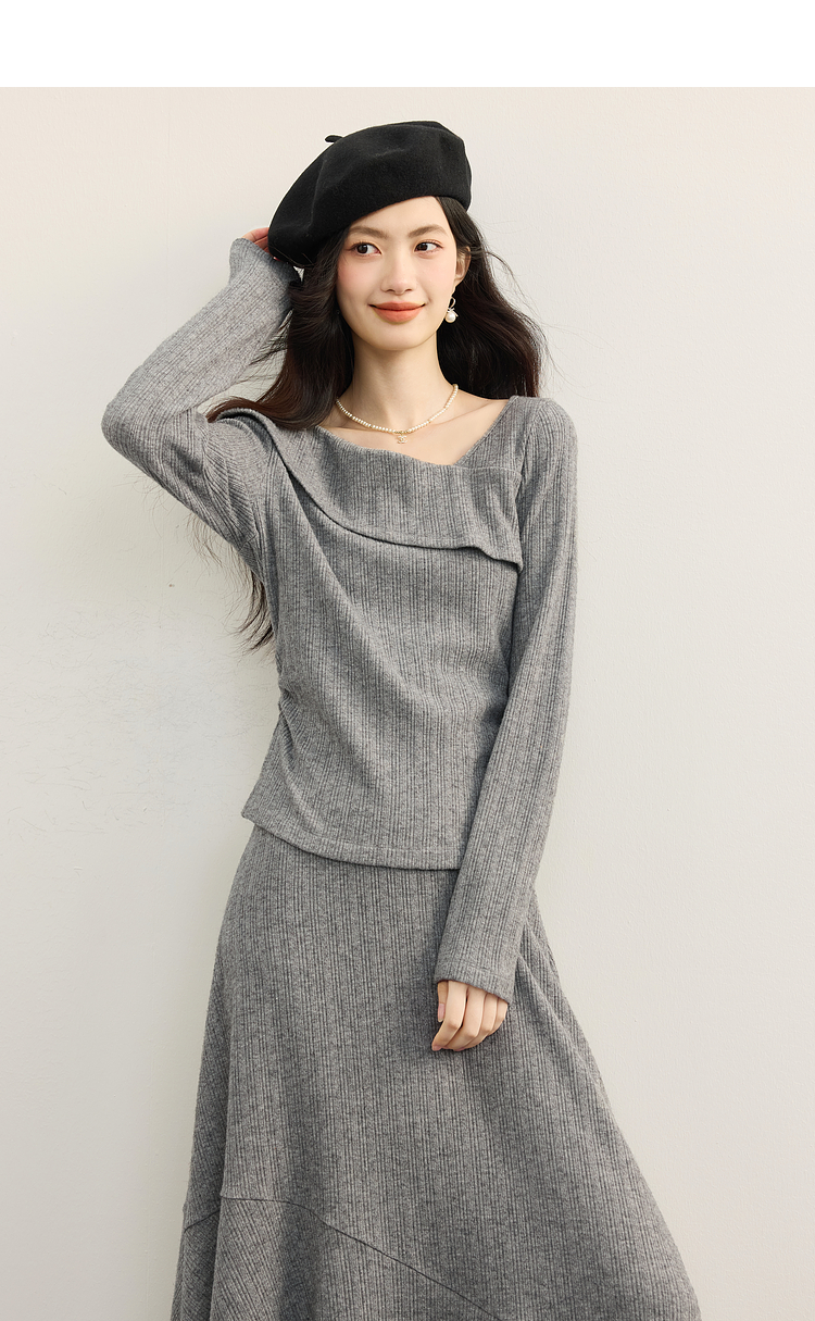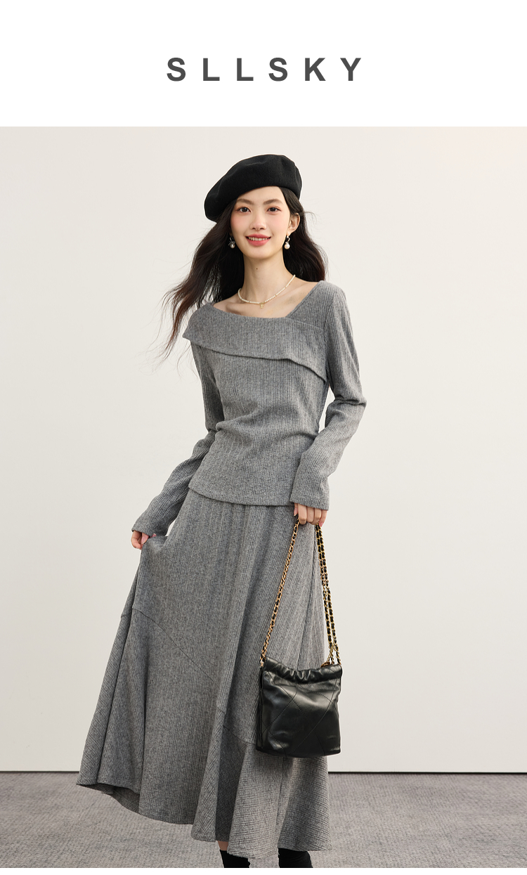 【09/03新品】熙世界格雷系灰色针织套装裙两件套女秋新款斜肩领上衣半身裙套装