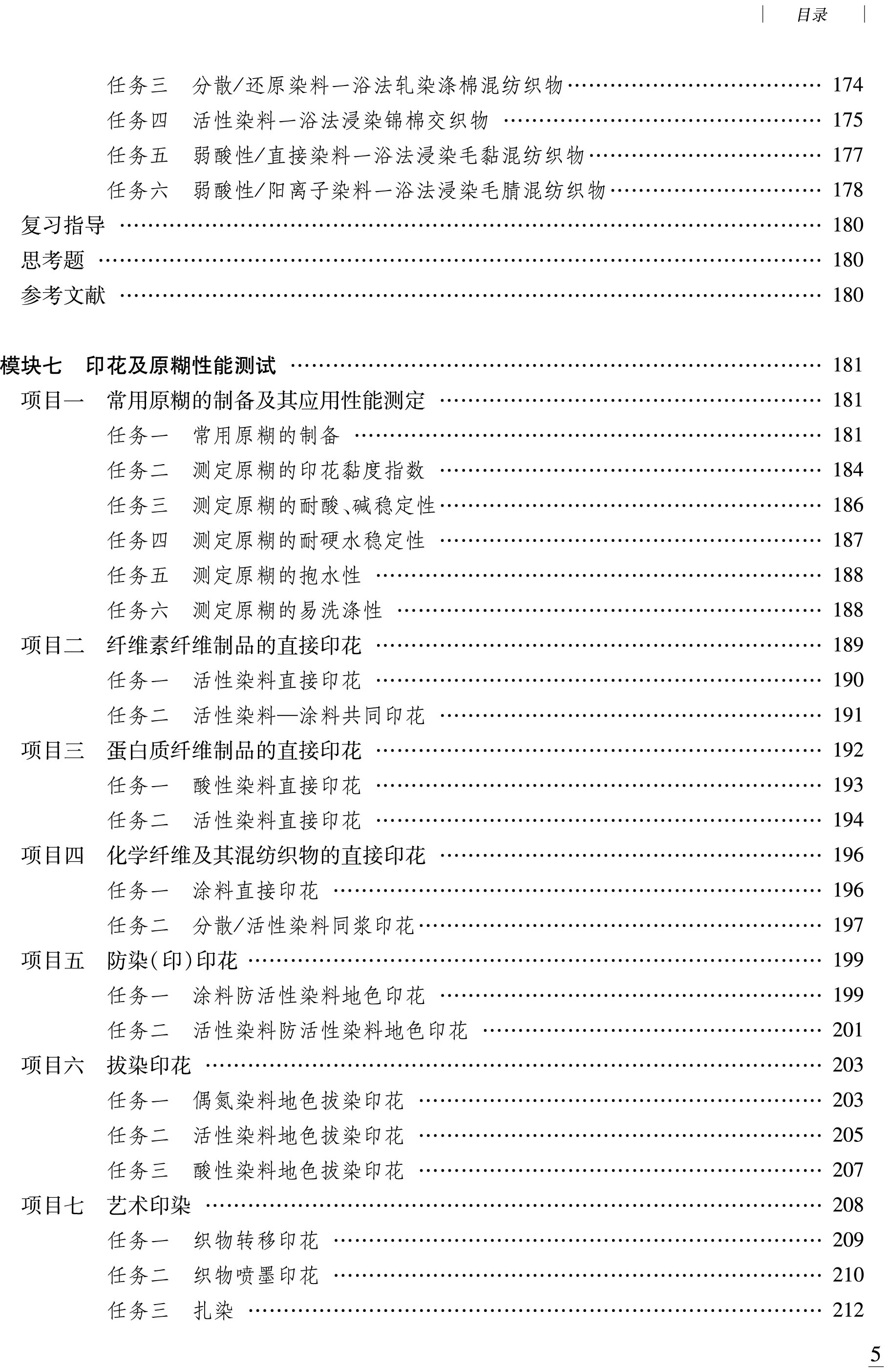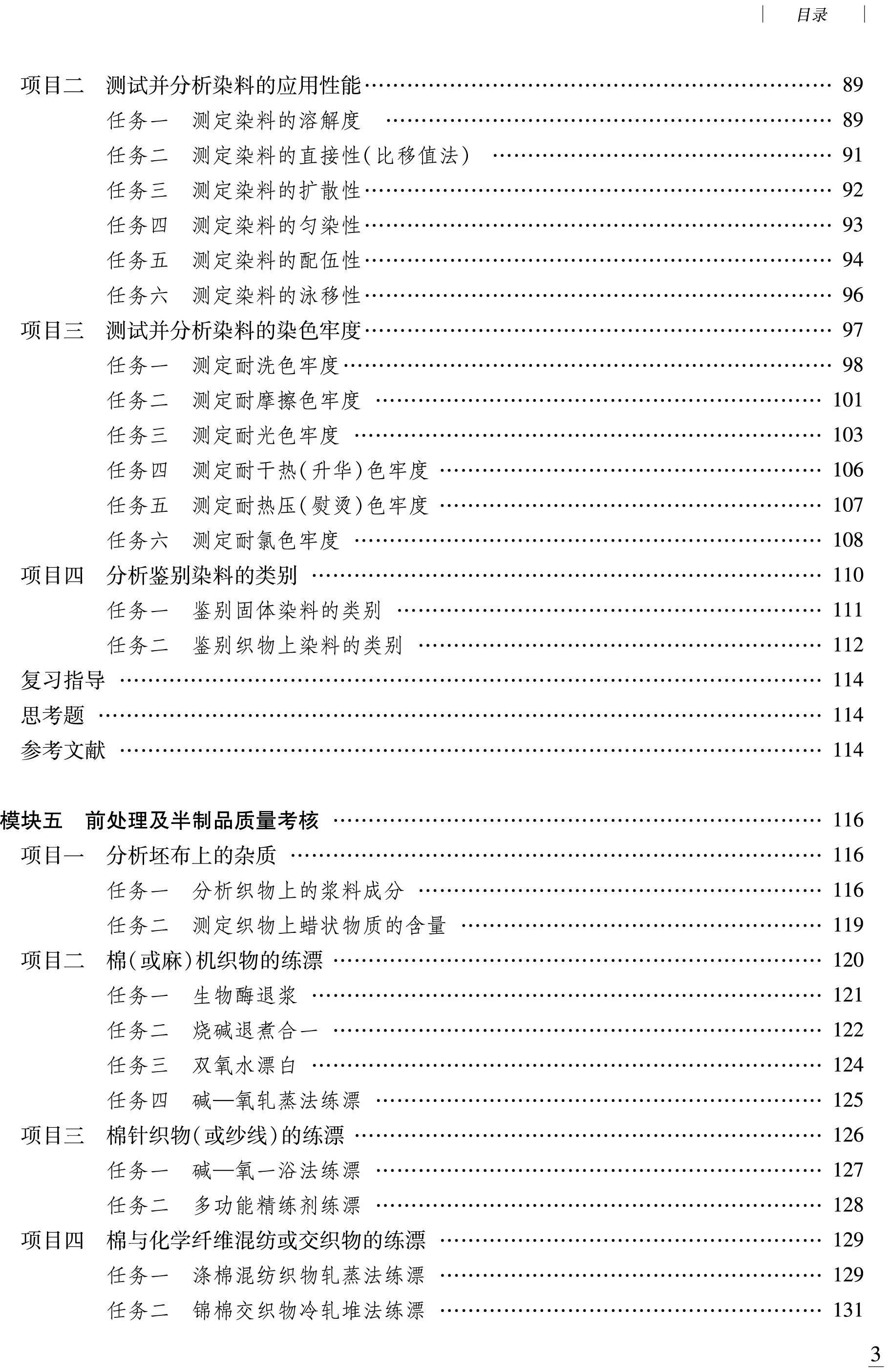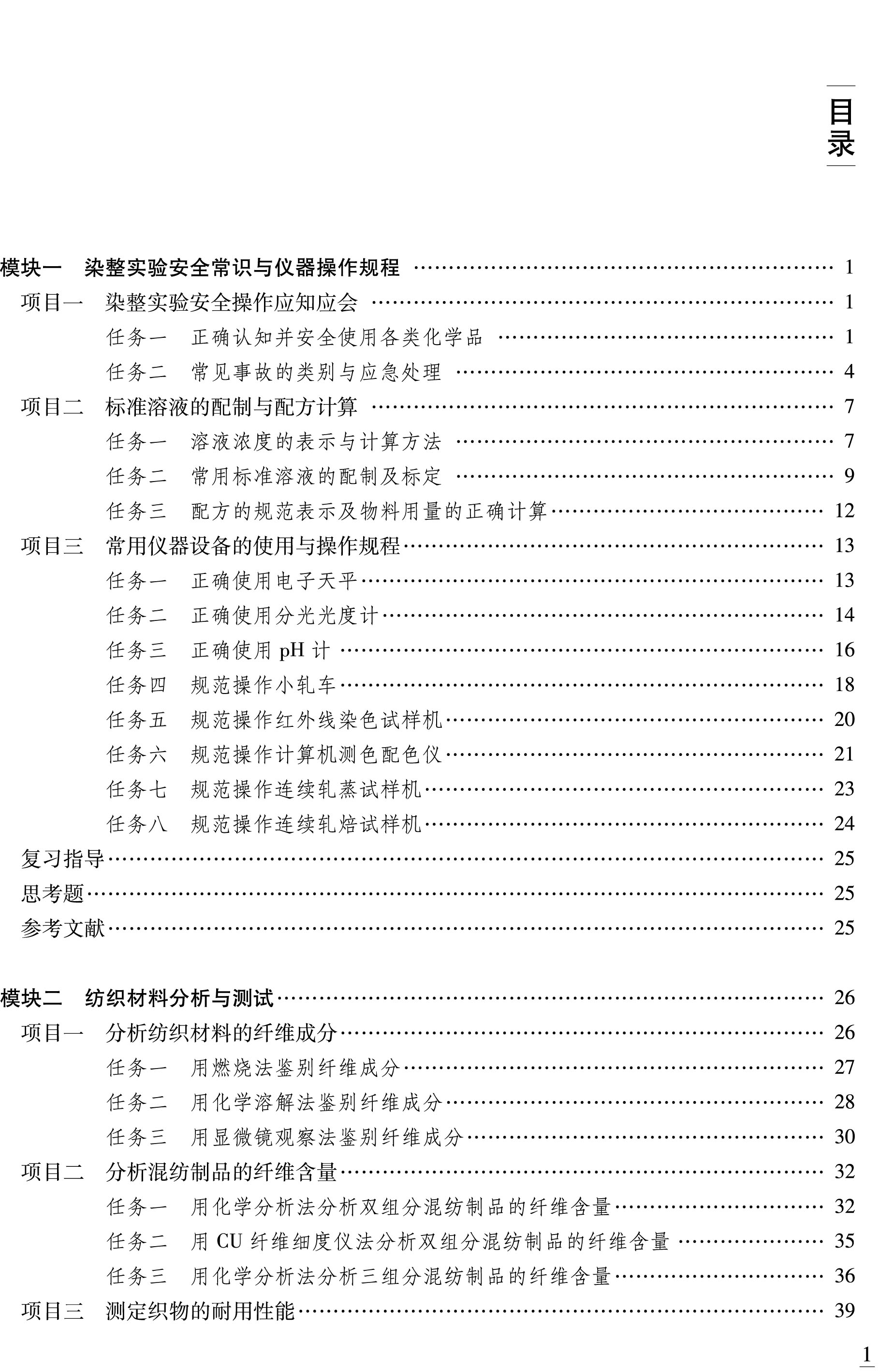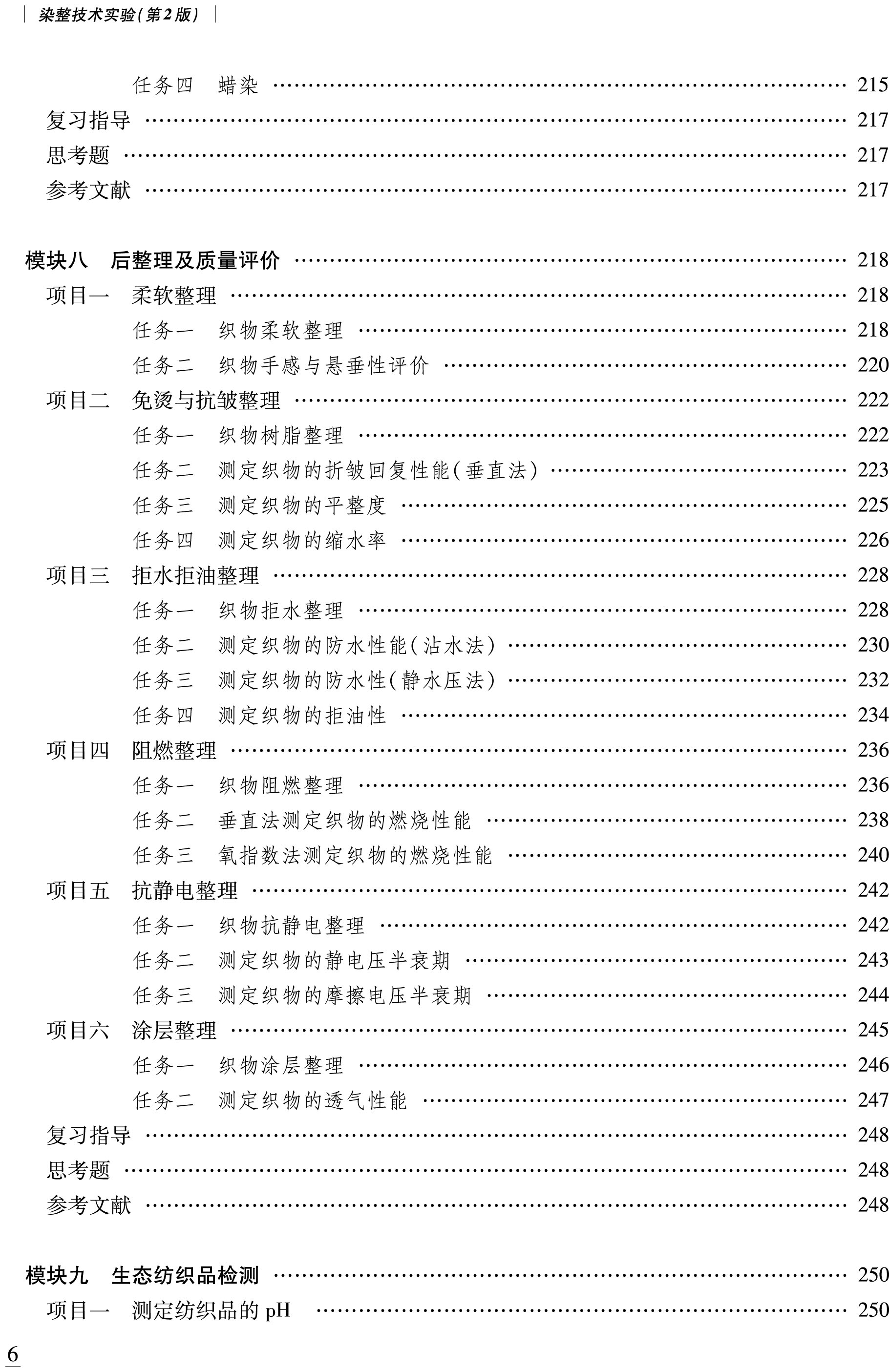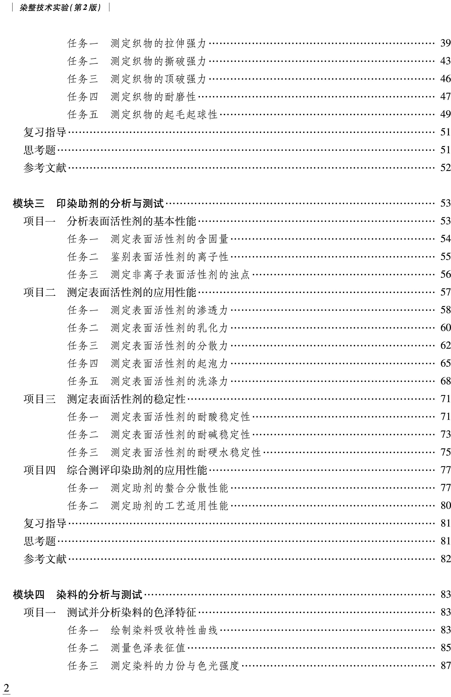 《染整技术实验(版)》较系统地介绍了染整试化验人员的安全常识、溶液配制、配方计算及常用试化验仪器设备的操作规程;纺织材料、染整助剂、染料的分析测试方法;常用纺织品的前处理、染色、印花、后整理工艺操作及产品质量评价方法;生态纺织品检测与印染车间快速测定方法等。