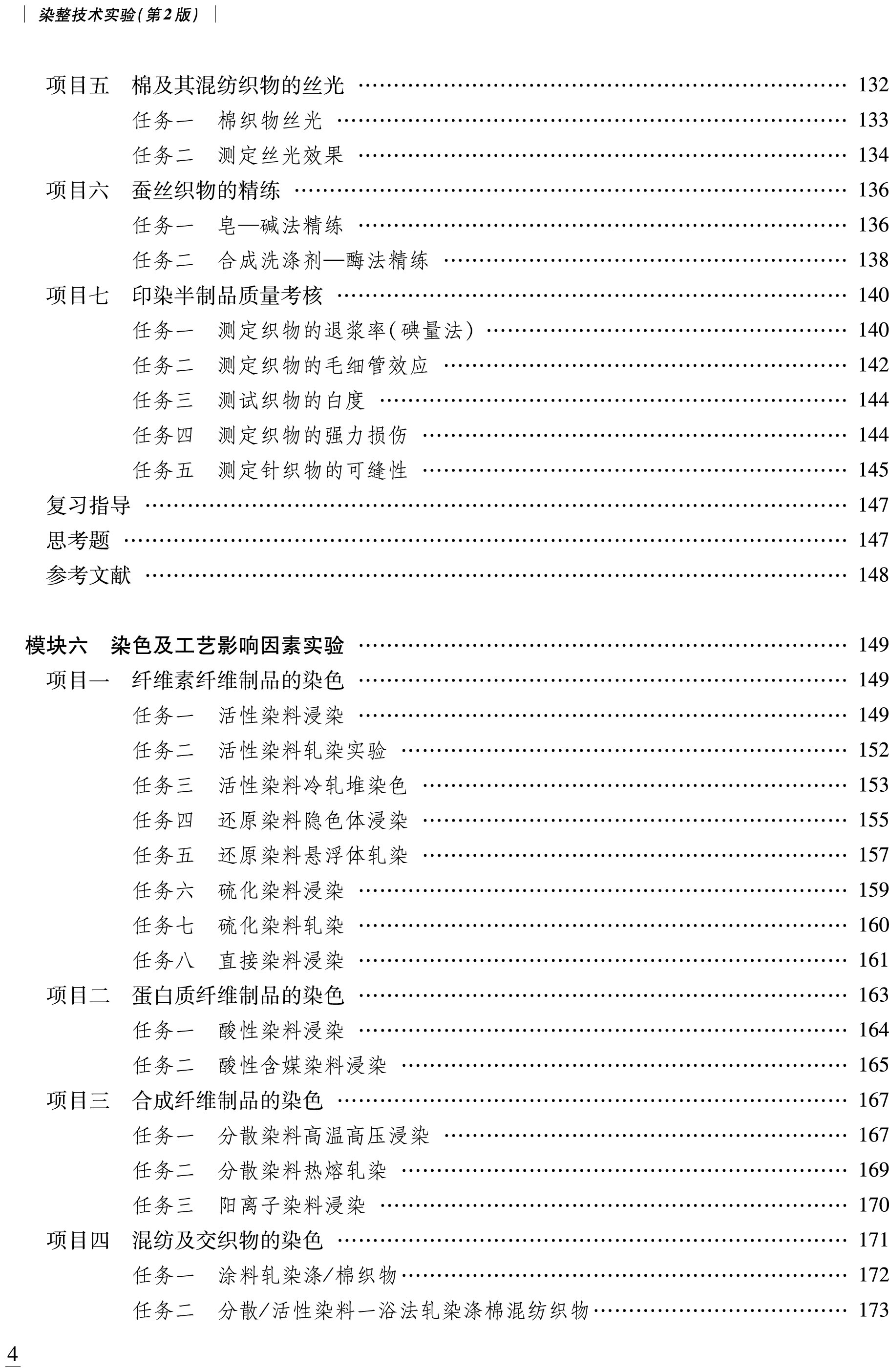 《染整技术实验(版)》中除了传统印染实验外,还增加了生态纺织品检测和印染车间快速测定实验,使得本书具有较强的实用性和可操作性,既可作为高等职业院校染整技术及相关专业学生的教科书,也可供纺染整、助剂、染料等行业技术人员学习与参考。