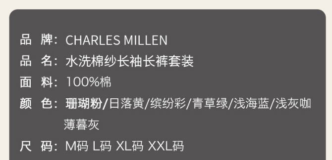 Charles Millen的家居服,之前夏款热卖3500+单,穿过的都知道,质量真的好,现在这团是水洗棉纱家居服套装,一套可以穿三季,更值! Charles Millen水洗棉纱家居服套装! 真的必须说下它的含金量❗️❗️ 上海高岛屋专柜同步在售💰459的档次! 🔺英国皇家御用品牌,高端家居品牌出品! 🔺100%纯棉,甄选新疆长绒棉! 🔺水洗棉纱工艺,触感软糯亲肤,越洗越软! 🔺马来西亚专柜在售!品质达到国际标准!