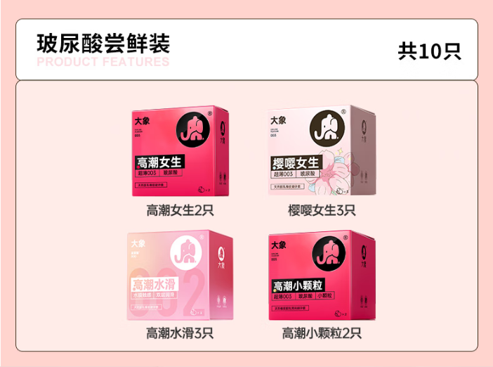 大象避孕套玻尿酸尝鲜组合10只 超薄002安全套 套套成人情趣计生用品