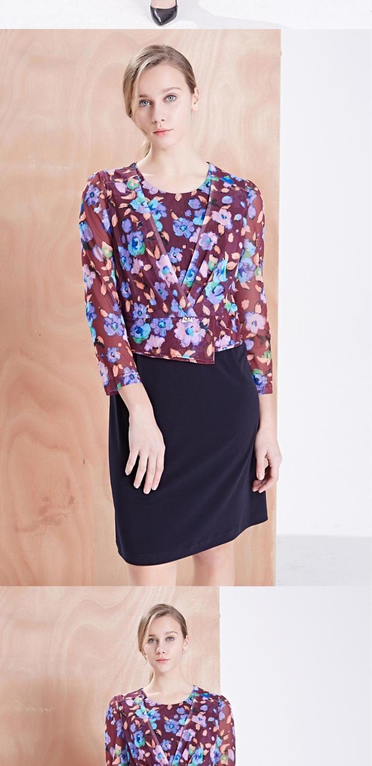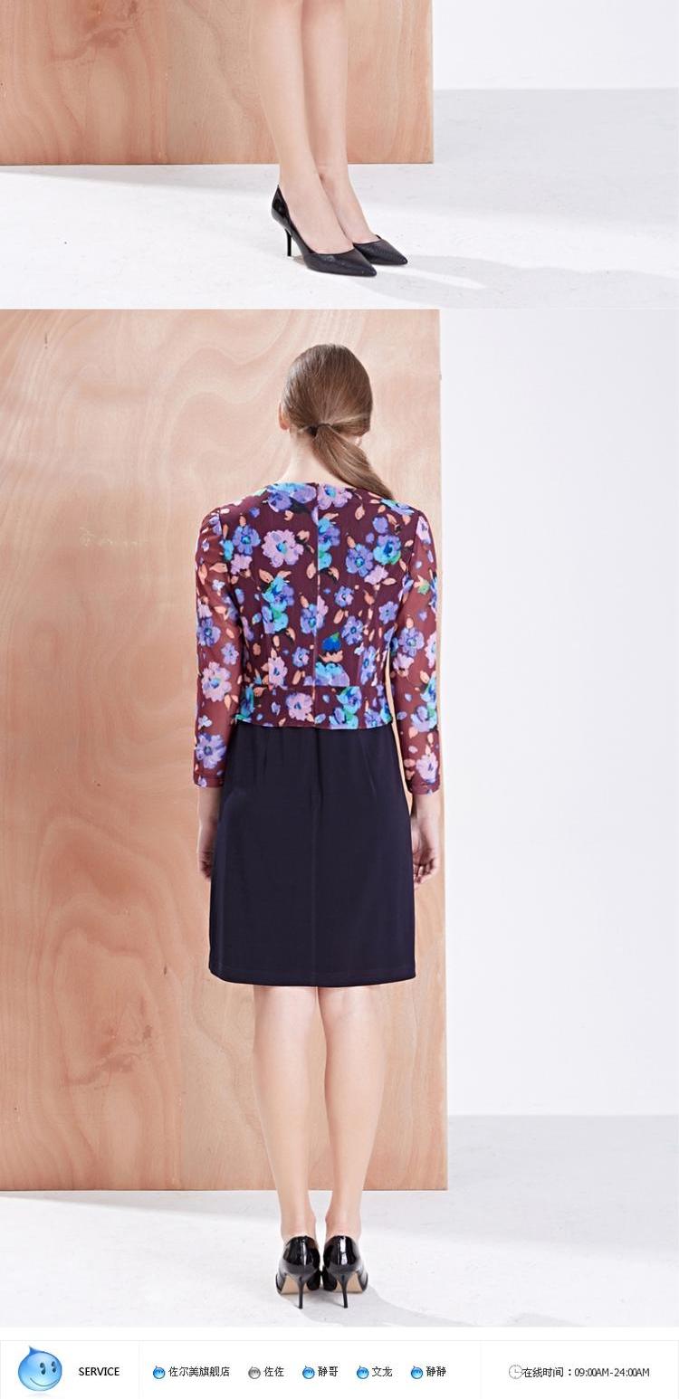 佐尔美新品春秋女装碎花印花拼接针织OL九分袖连衣裙短裙E63LL14