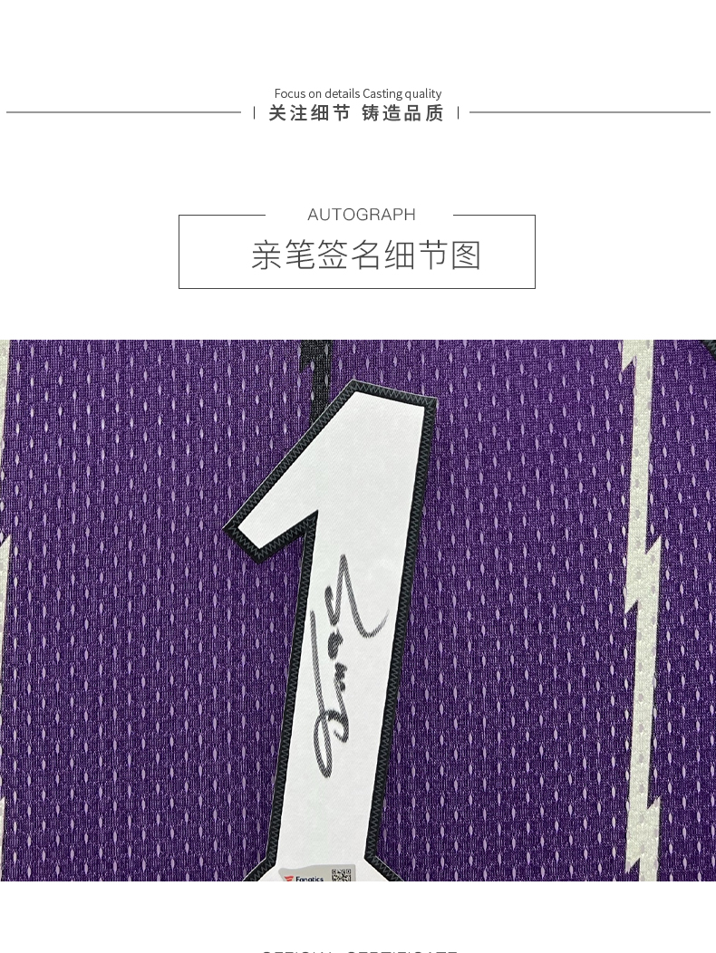 收藏系列 麦迪 猛龙队1号紫色 亲笔签名球衣