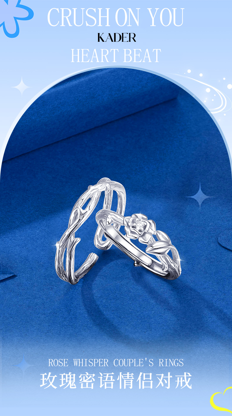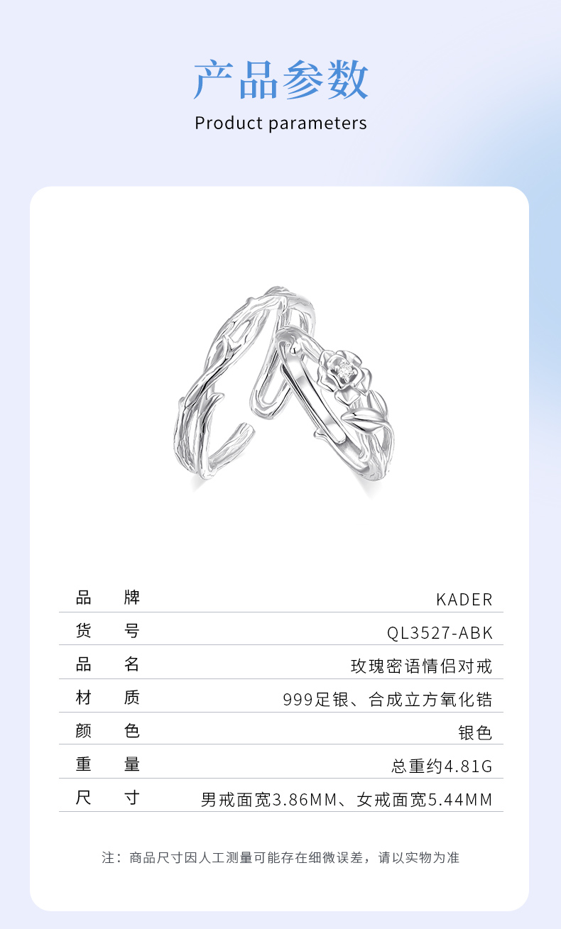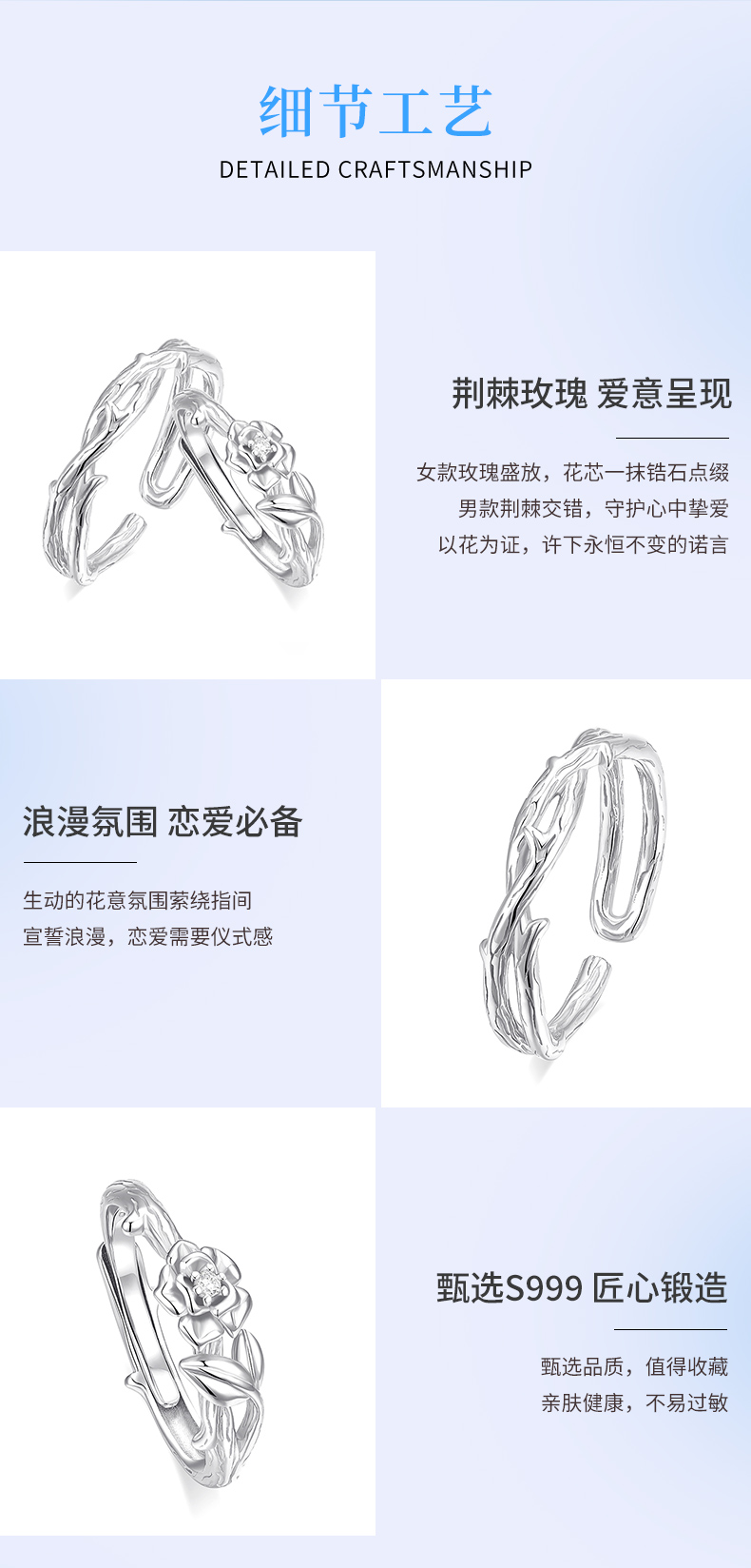 卡蒂罗/KADER 足银999 玫瑰密语情侣对戒 荆棘玫瑰简约复古开口可调节纯银素圈一对 浪漫精致恋爱告白钟爱久久